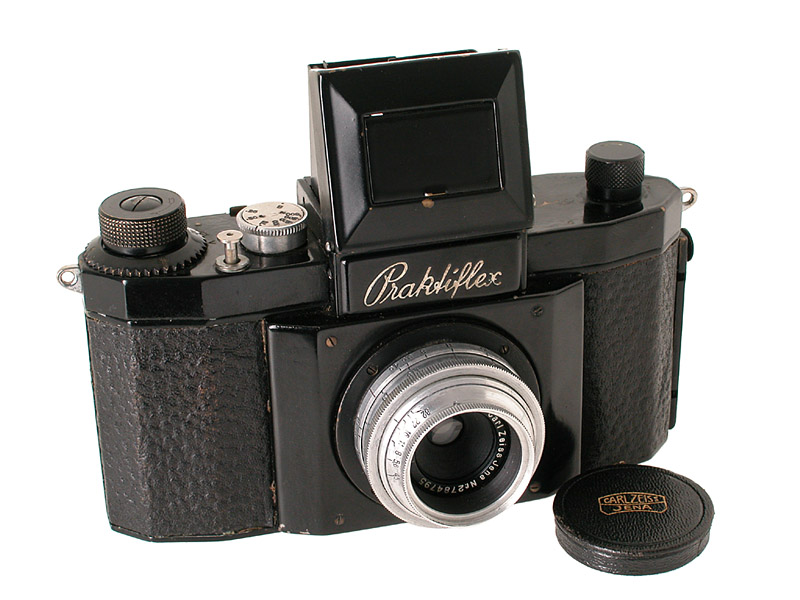 Schöne und seltene, schwarz lackierte Praktiflex 076 mit passendem Tessar 4,5/4cm Nr. 2784795, Deckel