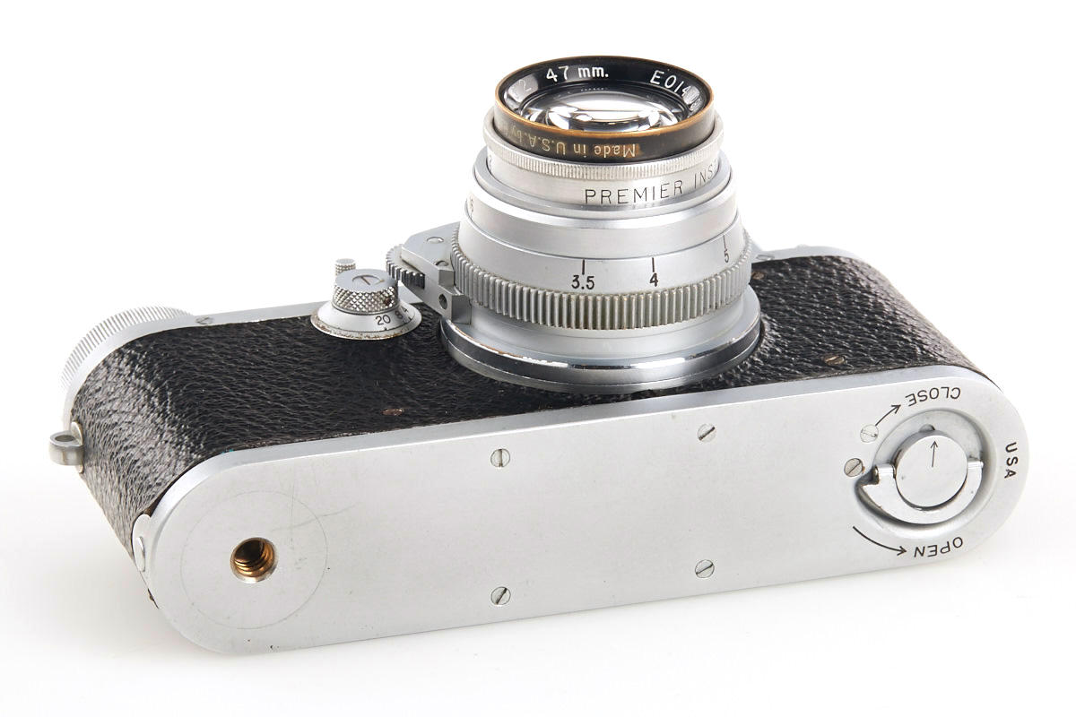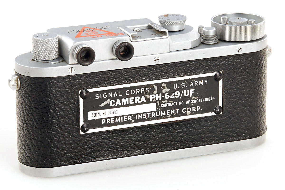 Leica IIIb copy for US Army made by Premier Instrument Co., in good condition and perfect technical order, Kodak Ektar 2/47mm no.EO14009 (cap), on the rear of the body metal-plate engraved: SIGNAL CORPS U.S. ARMY CAMERA PH-629/UF SERIAL no.6348 CONTRACT no. AF 33(038)-6864 PREMIER INSTRUMENT CORP.