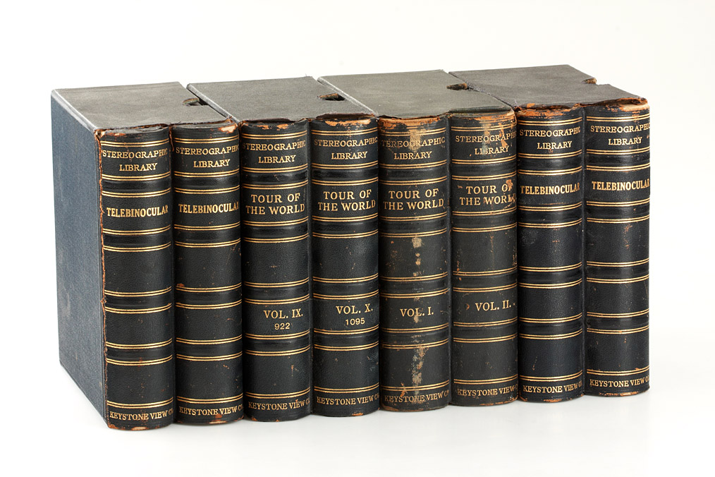 6 volumes in 3 boxes of the Keystone ‘Stereographic Library -Tour of the World’ edition in book-like containers including the matching and boxed ‘Telebinocular’ viewer, two almost complete series Vol.I/II and Vol.IX/X in their original boxes, a mixed series of cards in a second ‘Telebinocular’ box, all in all approx. 280 cards in good condition, the boxes show wear at the edges and the covering partly comes off, the dark blue viewer is in used but good condition. With a little restoration this might be an excellent set! Ex-Naylor Collection.