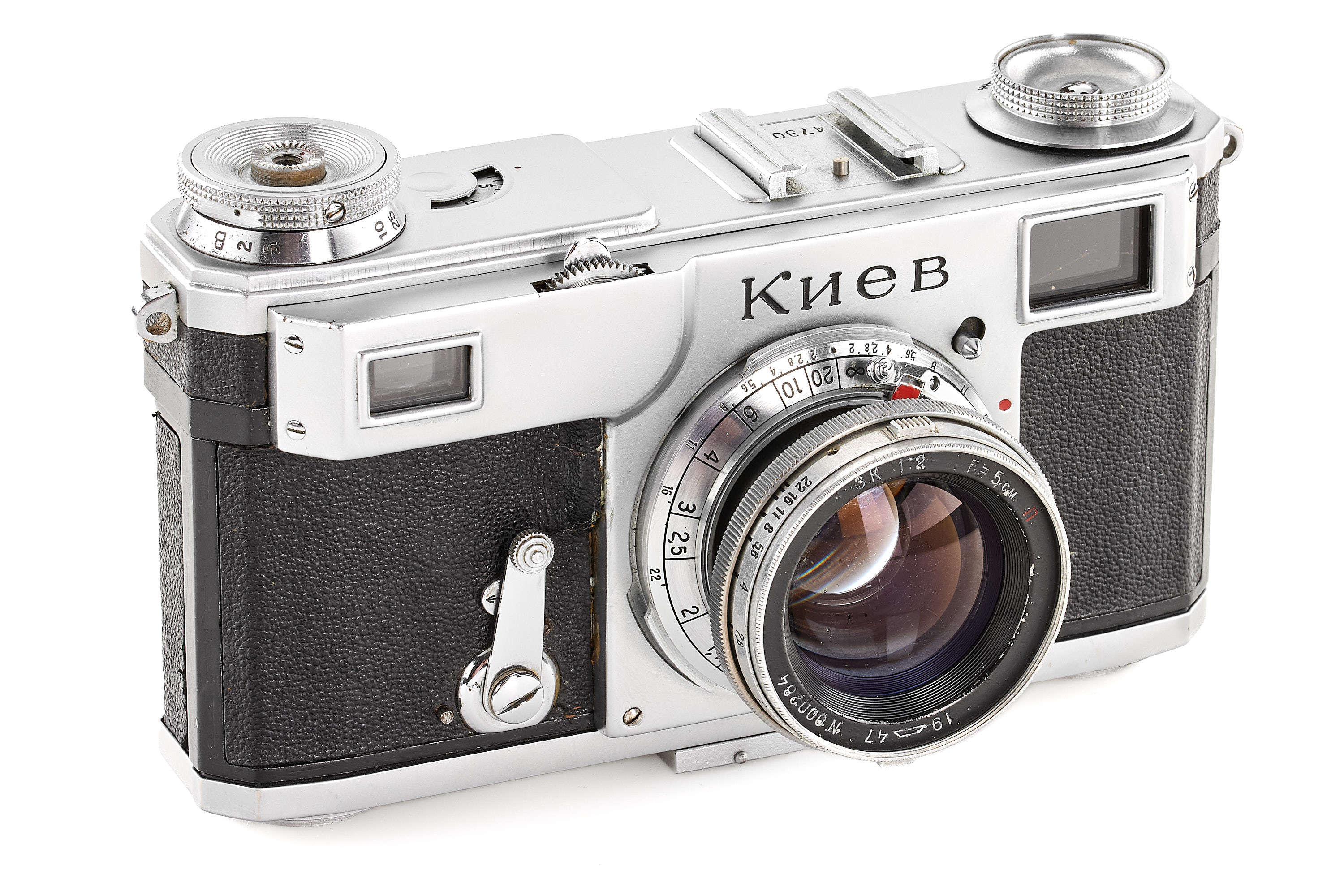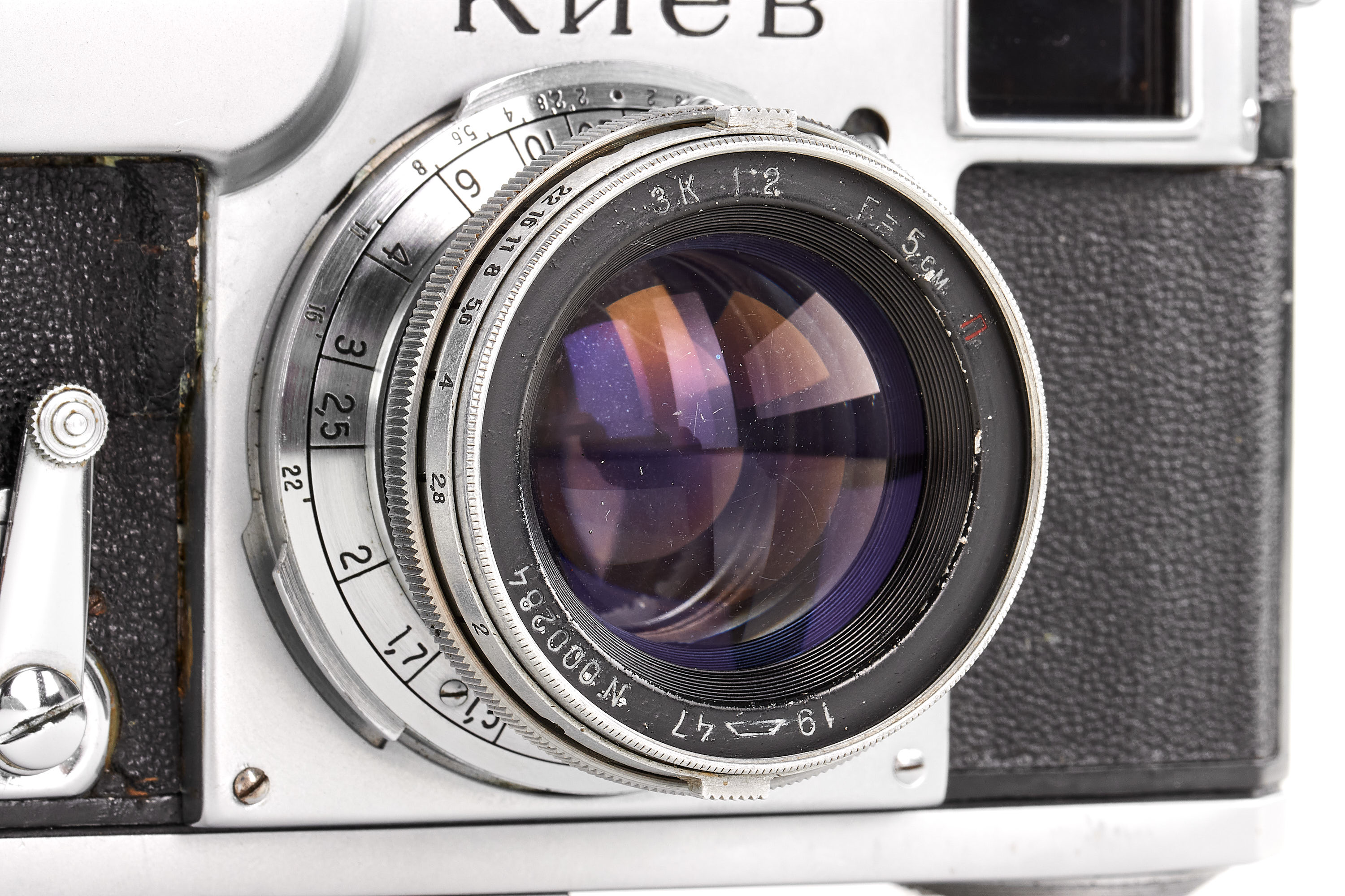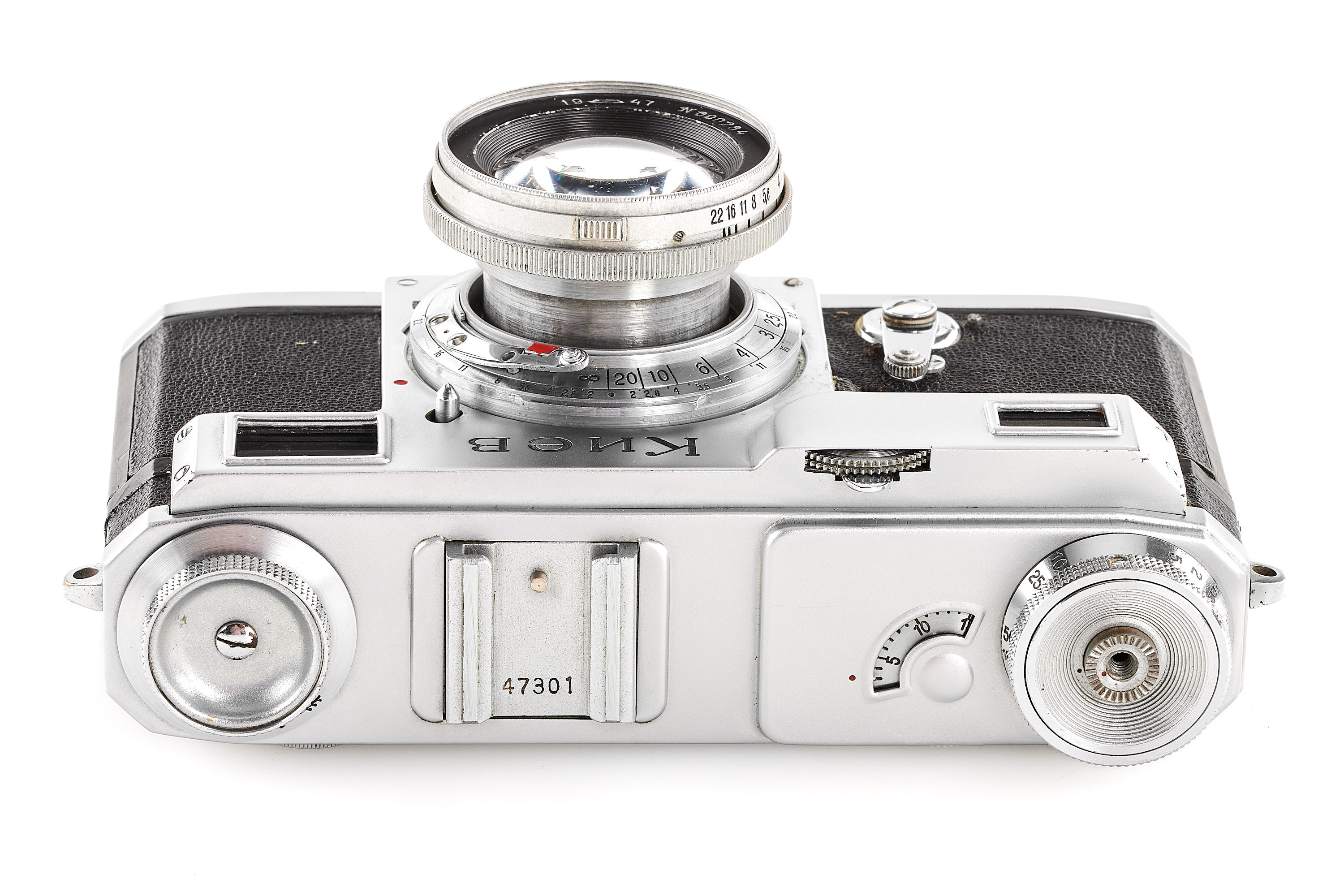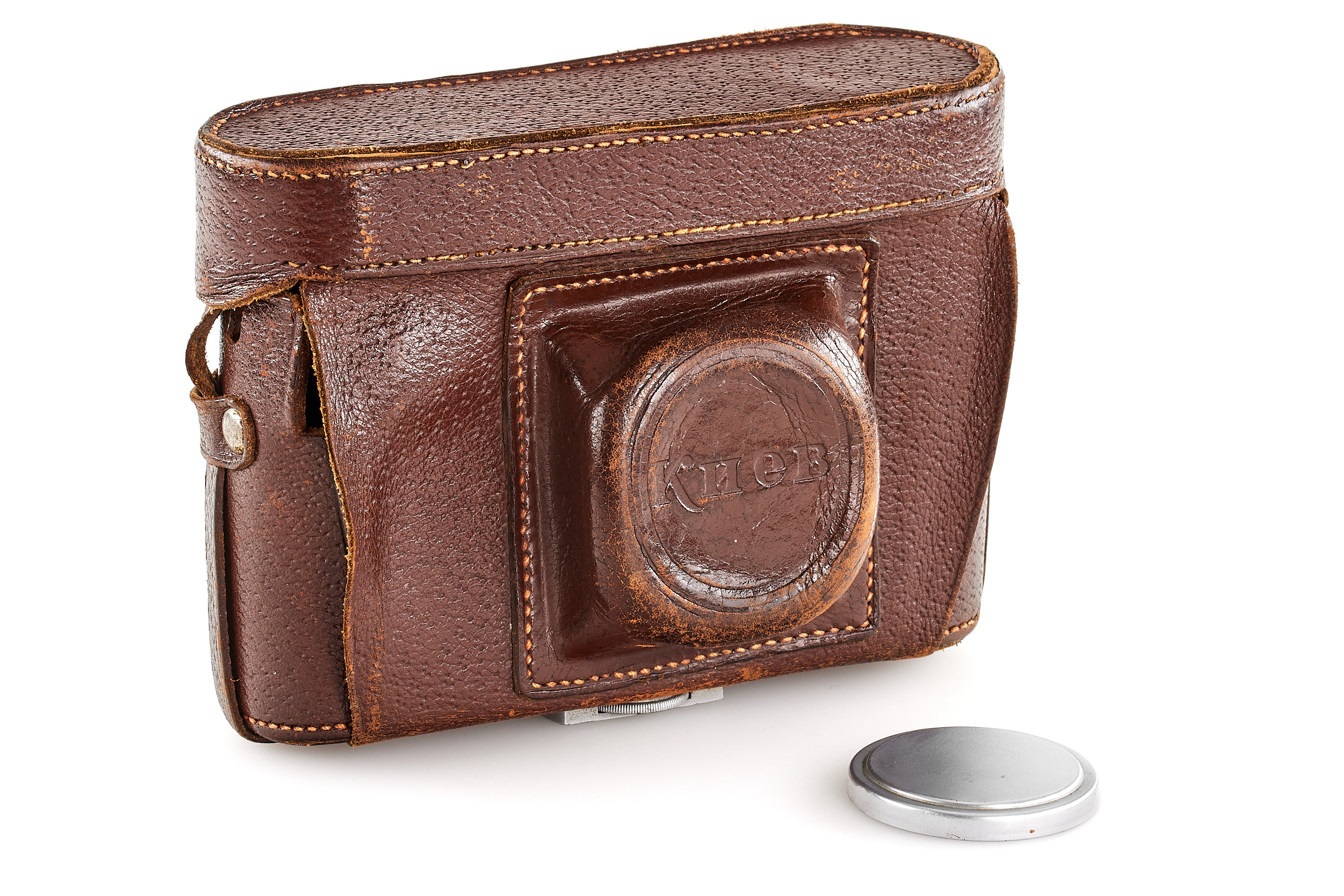A very early Kiev in very good, original condition, the shutter needs attention, only around 500 pieces have been produced, with matching early 1947 ZK 2/5cm no.000284 (traces of removed fungus and some cleaning marks), incl. front lens cap and leather case. While the first relocation of the Contax production line from Zeiss Ikon Dresden to Kiev in 1945 was a failure, two other production lines made by Carl Zeiss Jena were probably relocated to Kiev successfully in 1947. It seems that the „Kiev“, as it is called now, was a mixture of „Jena“ and „Dresden“ shaped parts from the start, as can be seen in this example. This is the second type with the final form of the Kiev logo. This camera is an interesting document of the Kiev company's history.