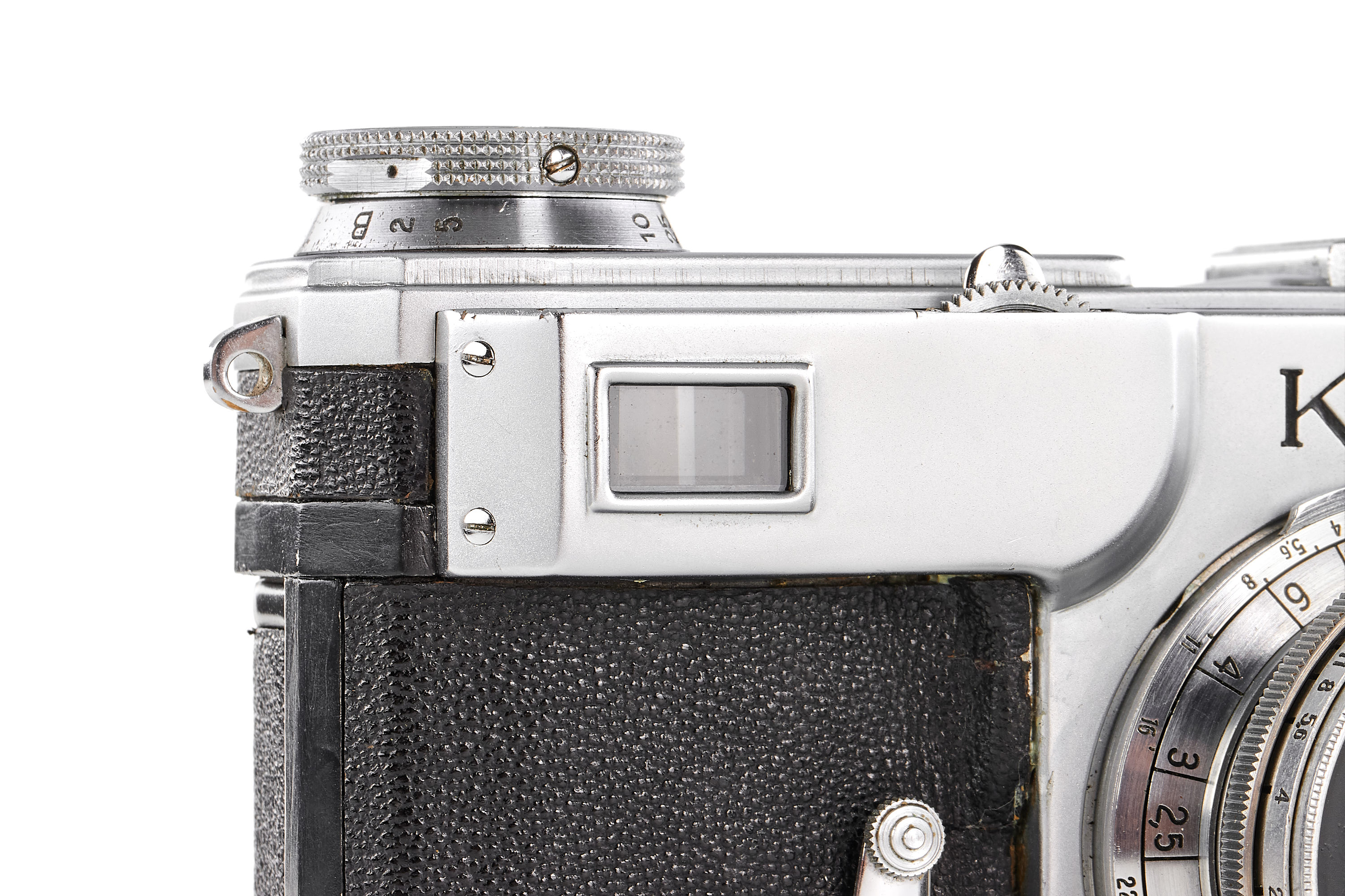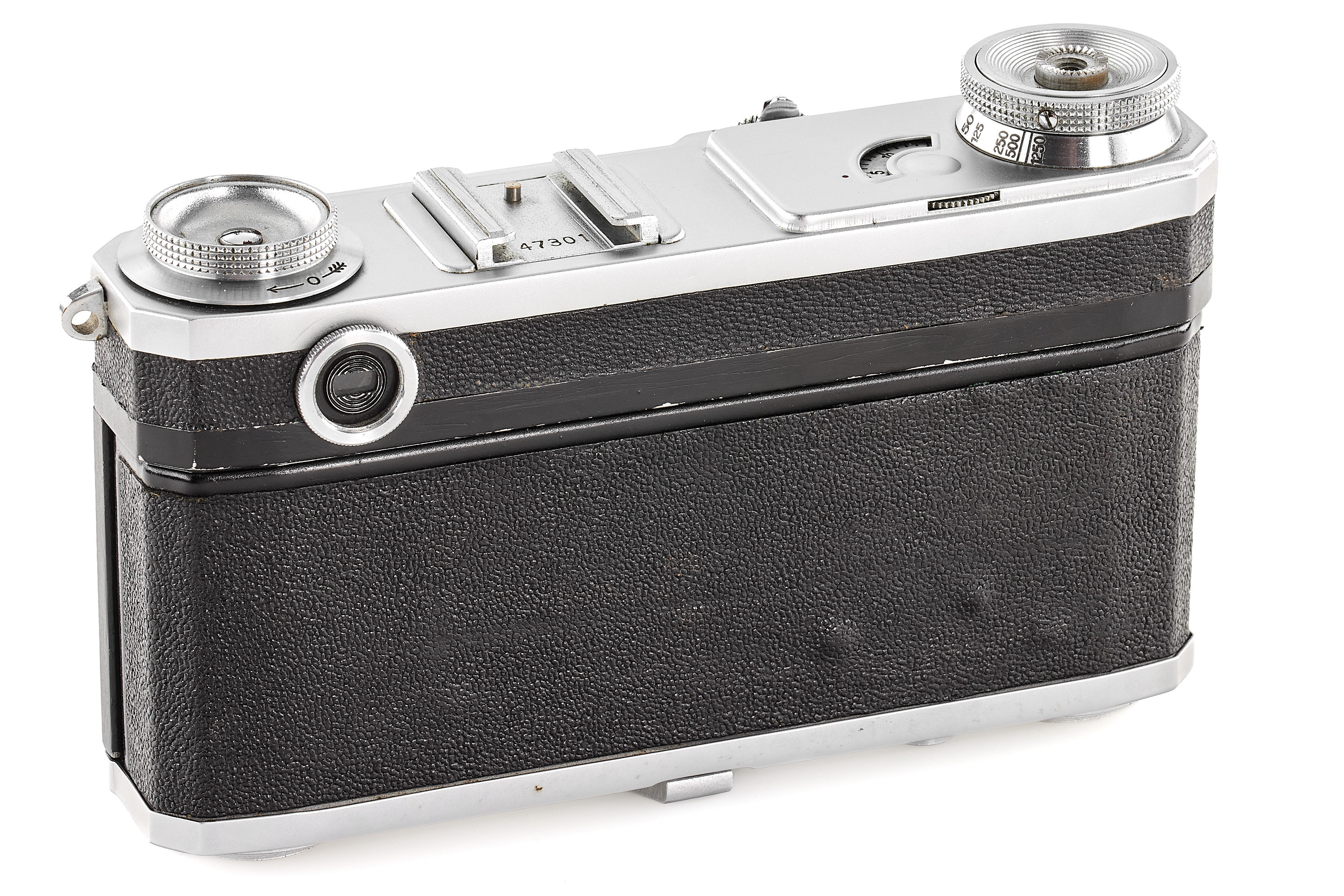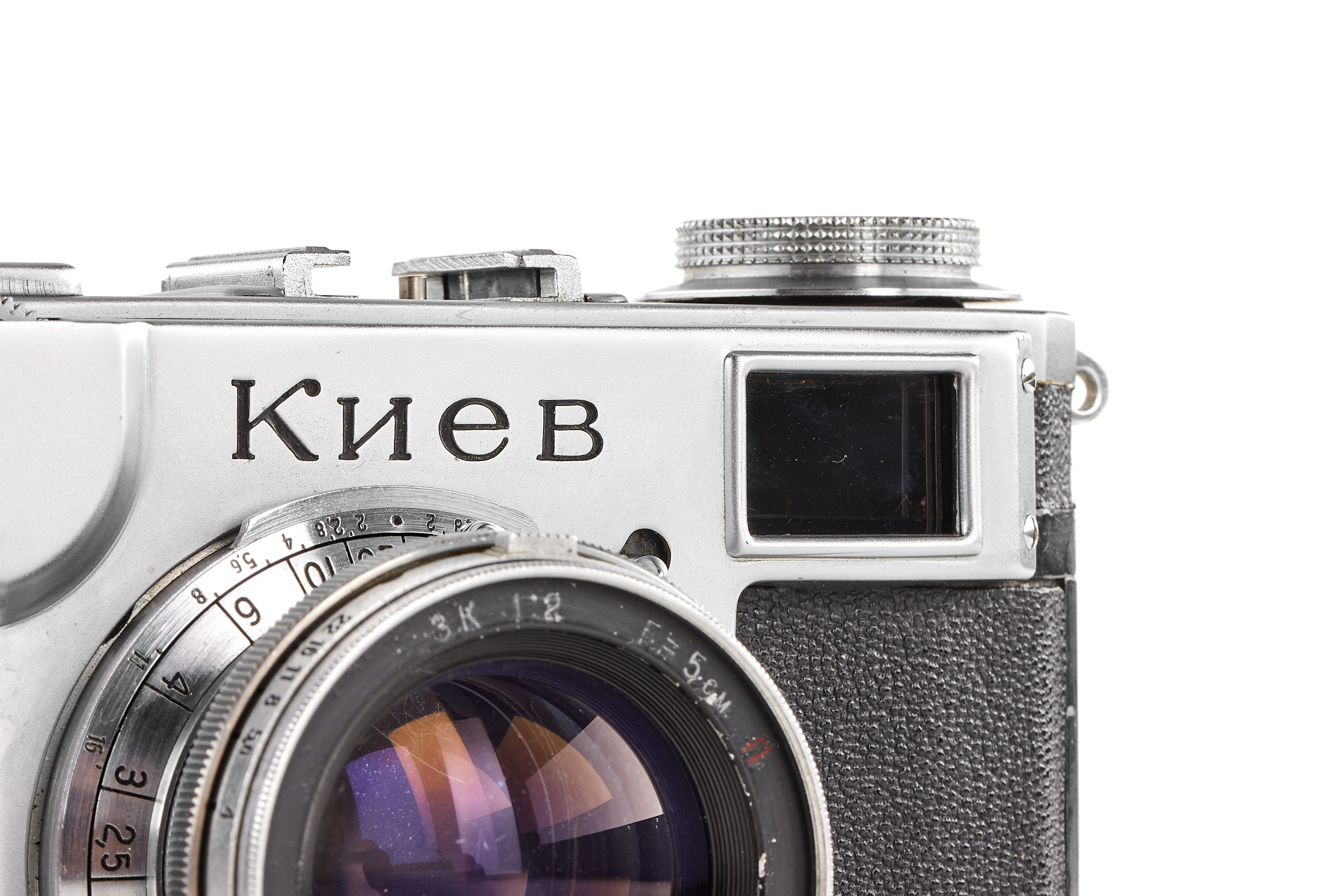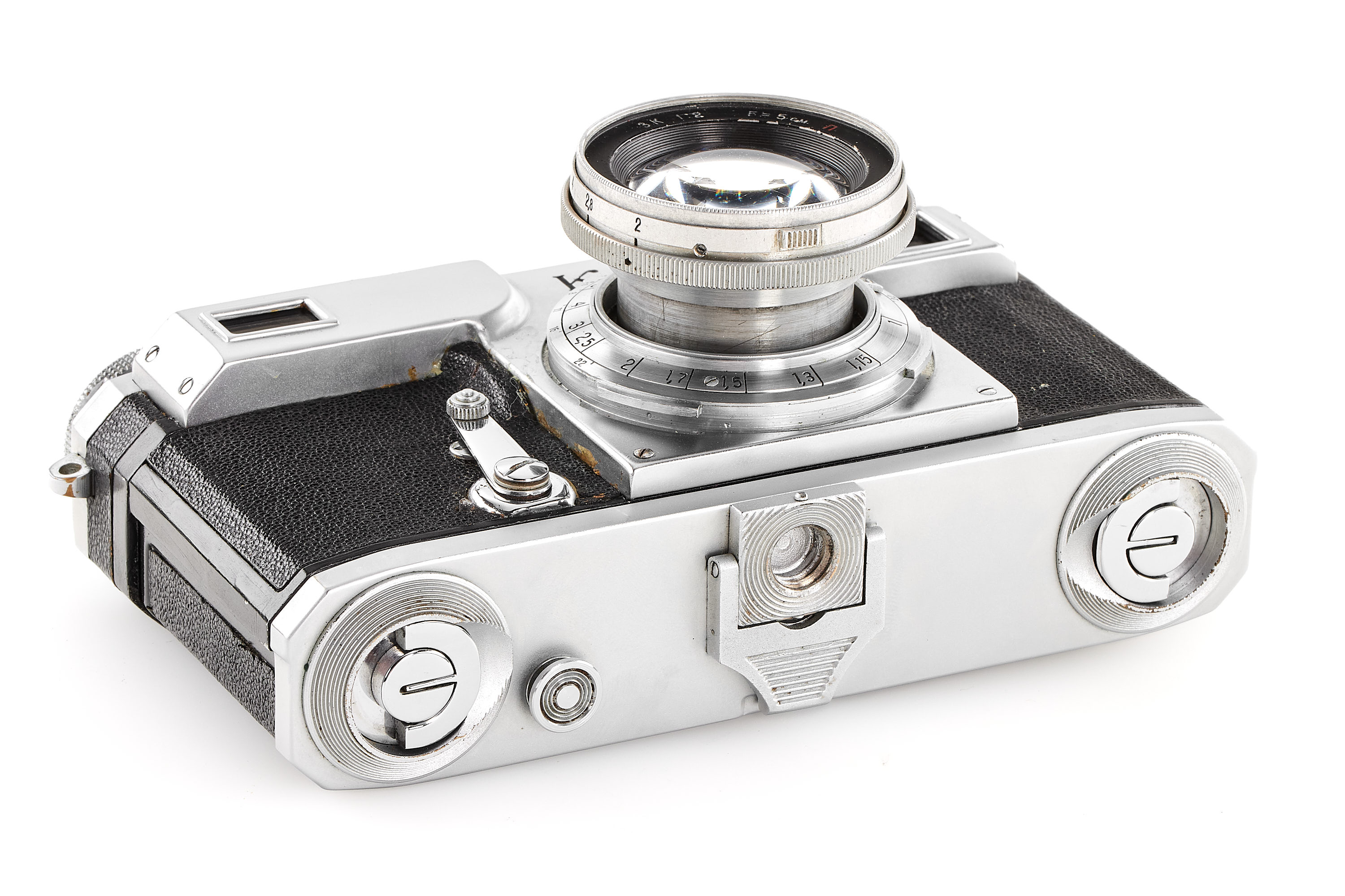 A very early Kiev in very good, original condition, the shutter needs attention, only around 500 pieces have been produced, with matching early 1947 ZK 2/5cm no.000284 (traces of removed fungus and some cleaning marks), incl. front lens cap and leather case. While the first relocation of the Contax production line from Zeiss Ikon Dresden to Kiev in 1945 was a failure, two other production lines made by Carl Zeiss Jena were probably relocated to Kiev successfully in 1947. It seems that the „Kiev“, as it is called now, was a mixture of „Jena“ and „Dresden“ shaped parts from the start, as can be seen in this example. This is the second type with the final form of the Kiev logo. This camera is an interesting document of the Kiev company's history.