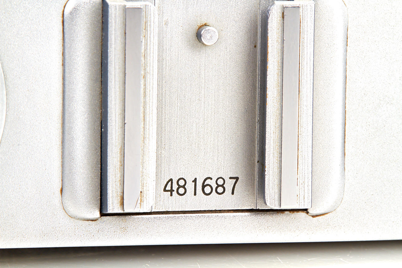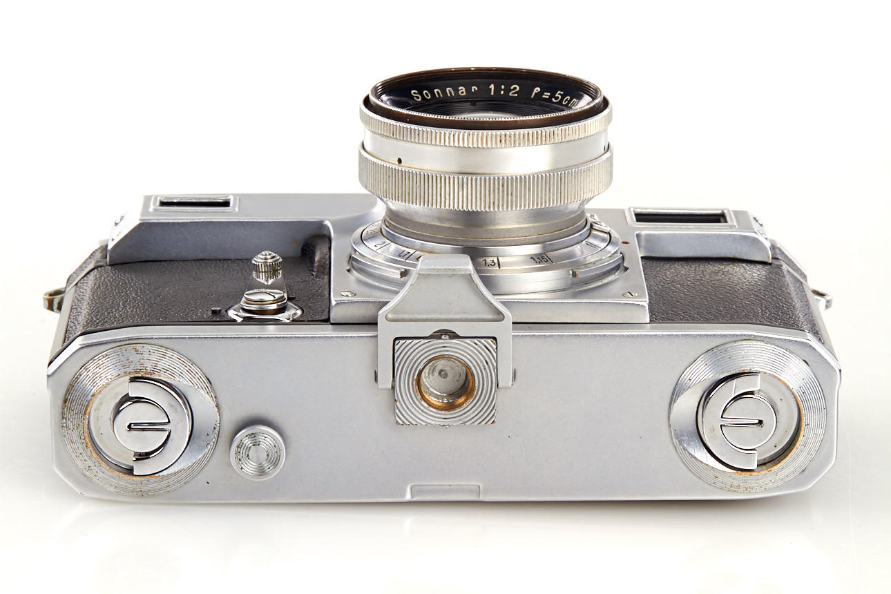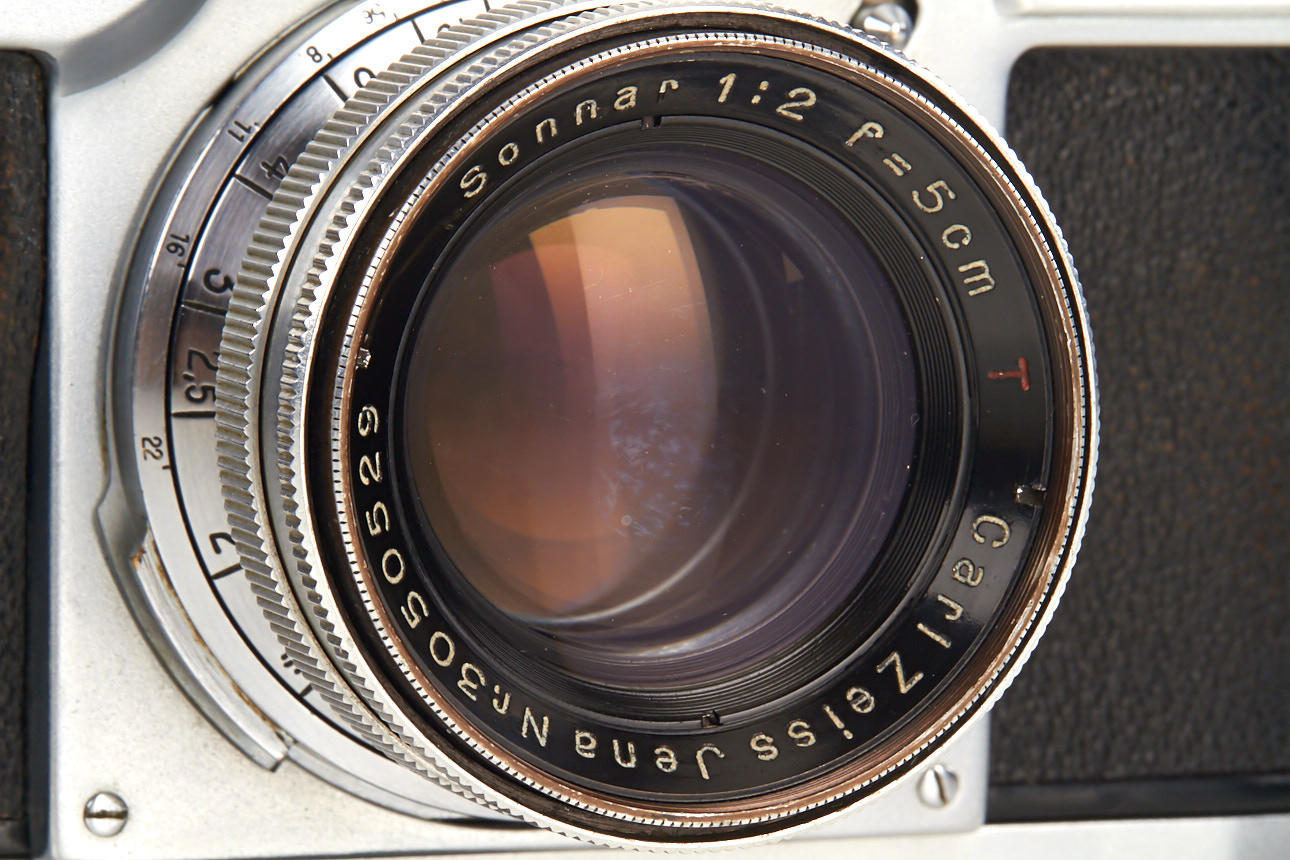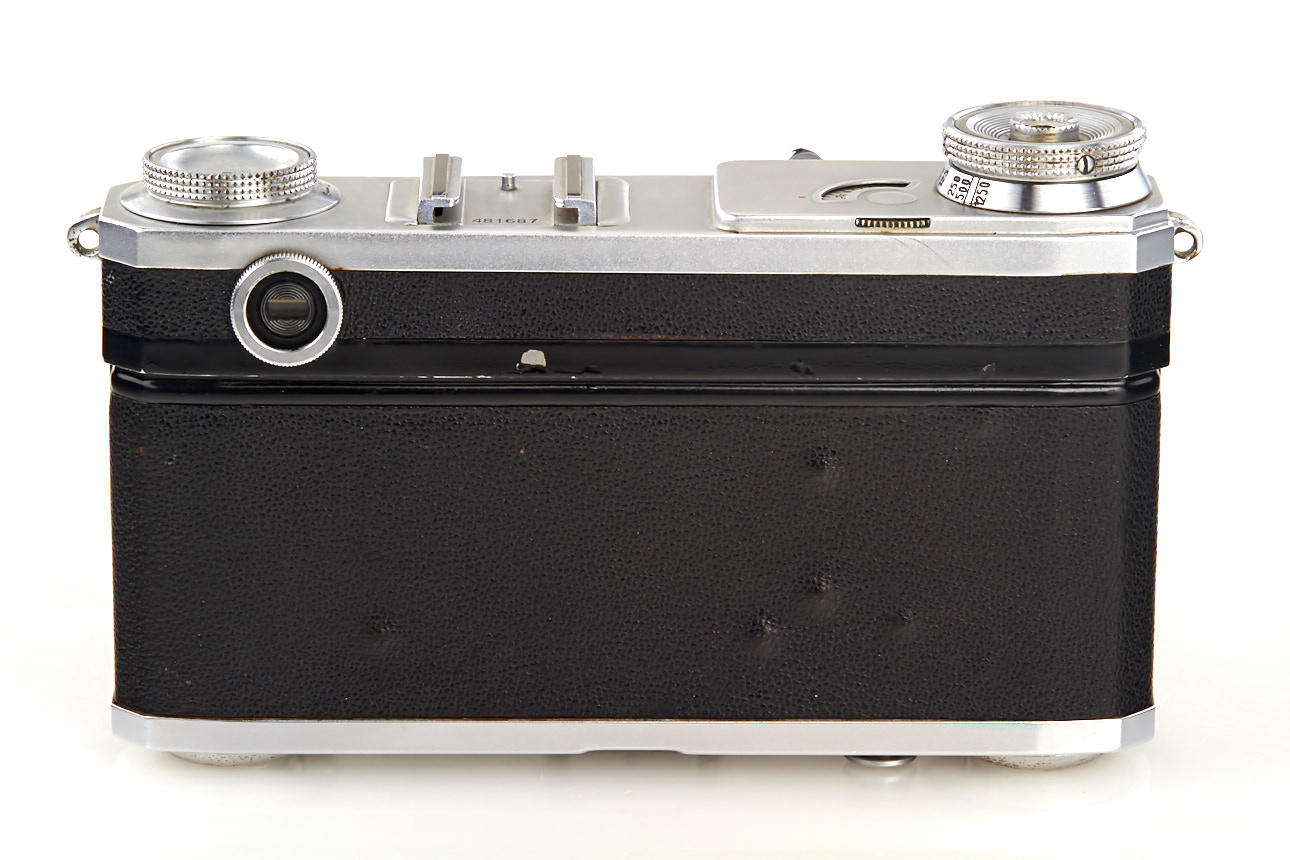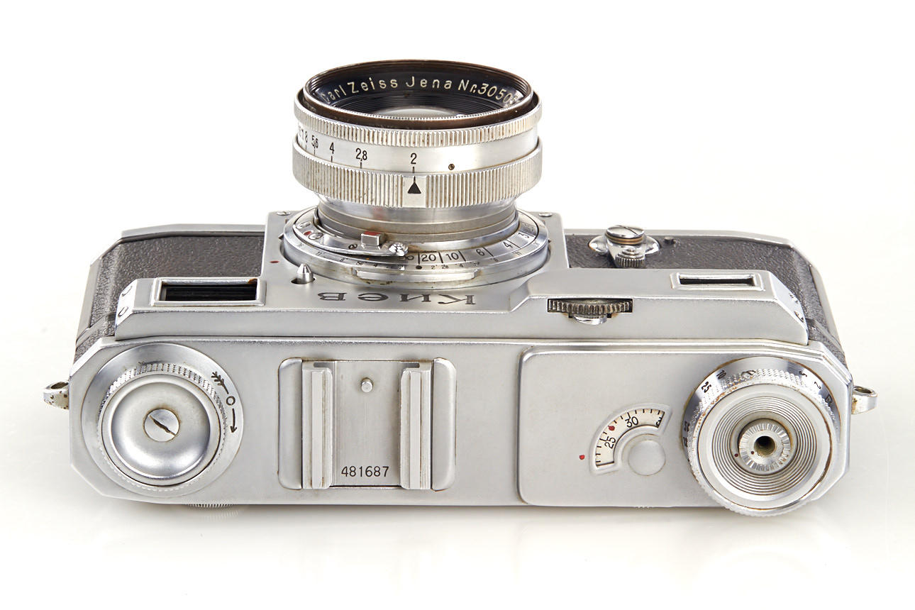 early Kiev in excellent original condition, fully functional, with Carl Zeiss Jena Sonnar 2/5cm T no.3050529 (1947). While a first relocation of the Contax production line from Zeiss Ikon Dresden to Kiev in 1945 was a failure, two other production lines made by Carl Zeiss Jena were probably relocated to Kiev successfully in 1947. It seems that the „Kiev“, as it was called now, was a mixture of „Jena“ and „Dresden“ shaped parts from the start, as it can be seen in this example. Some important parts of this camera no. 481687 from 1948 are shaped just like Dresden parts, as the scales of the helicoid and the frame counter, the film plane casting, the main body casting and the accessory shoe, while other important parts are shaped like „Jena“ parts, as the four screws that hold the film plane casting in place (fine thread! not the coarse thread as in a „Dresden“ camera) and specially the rangefinder optics (the rangefinder of no. 481687 uses a „Jena“ type semi-silvered beam splitter, while in a Dresden camera or a later Kiev from 1950 on it would contain a „green tint“ gold-plated beam splitter). In later 1948 and 1949 the „Jena“ parts were gradually omitted during production in favour of „Dresden“ shaped parts. All in all this camera is an interesting document of the Kiev history in beautiful pristine condition. Expertise by Dr.Milos Mladek.