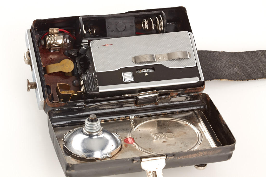 probably custom made spy device, Kiev subminiature camera built into an electric lamp, two sliders that change the filters