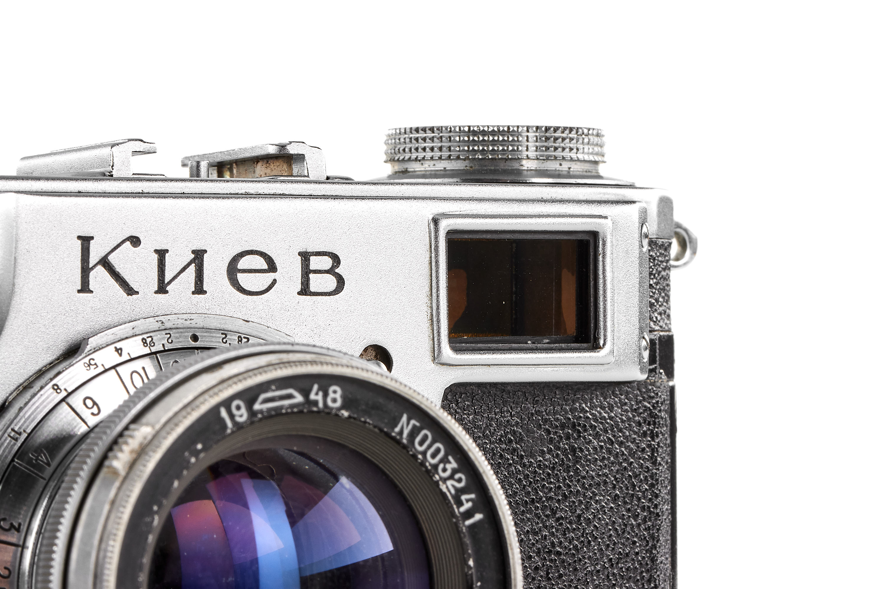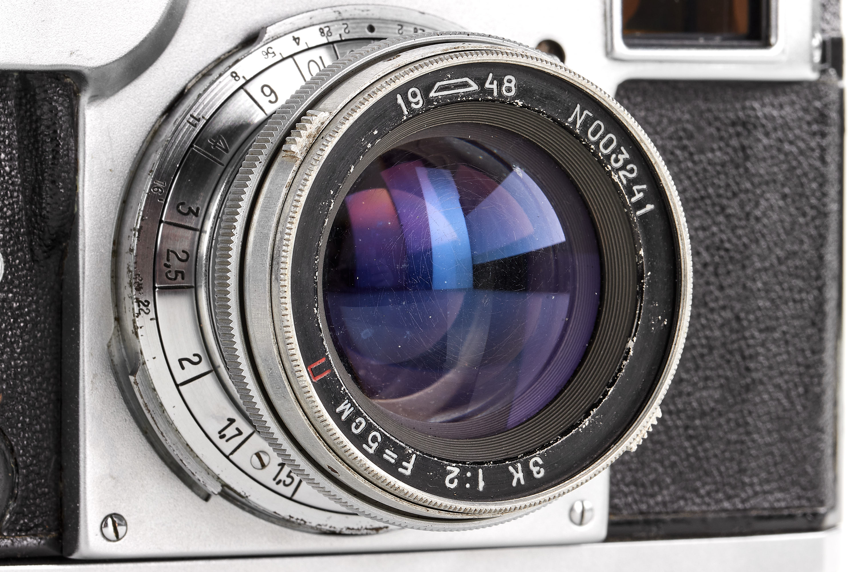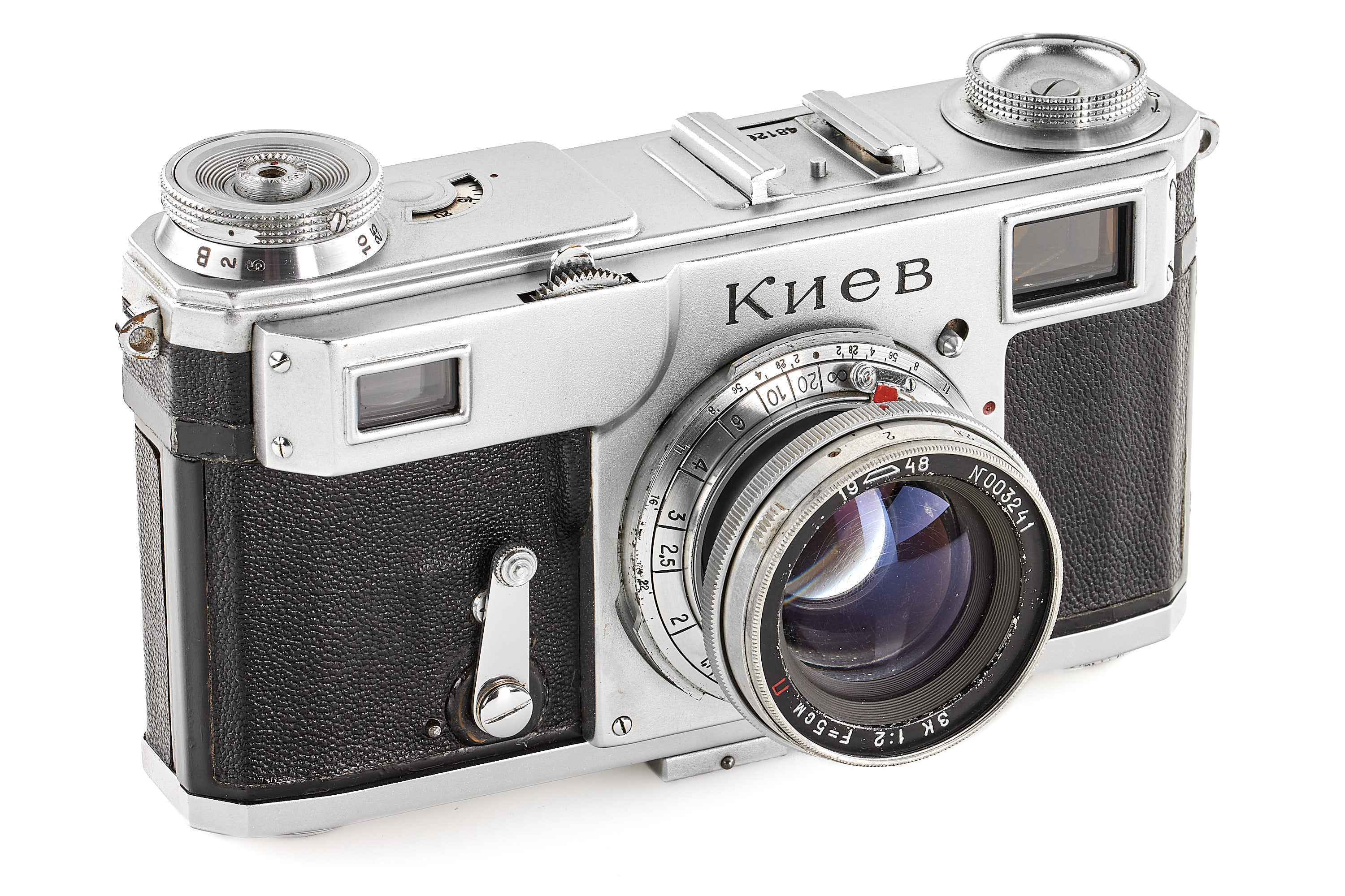 An early Kiev camera, assembled partially with Contax Jena parts, in good condition and working order (shutter speeds not accurate), with matching ZK 1948 2/5cm no.003241 (also assembled using Zeiss parts) showing cleaning marks, with original leather case, only around 2000 of these cameras have been released.