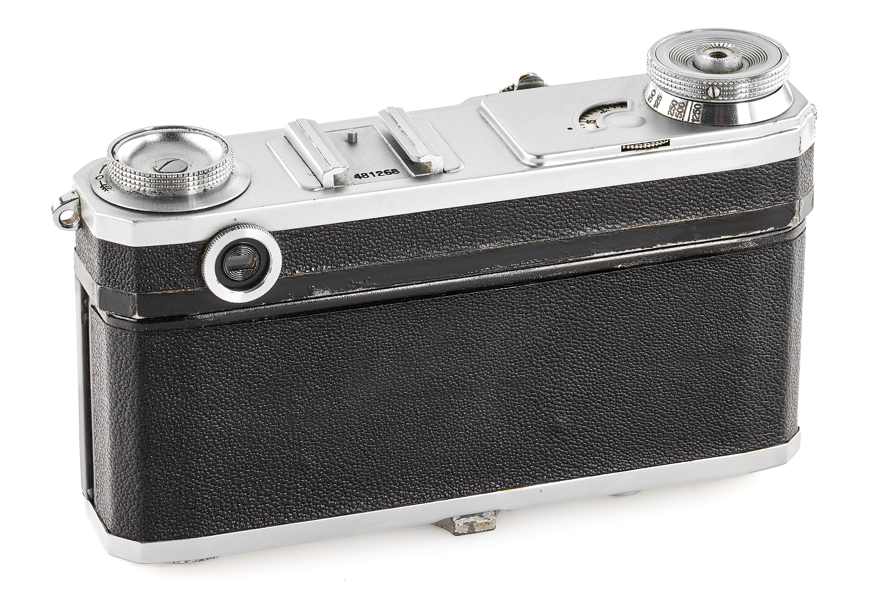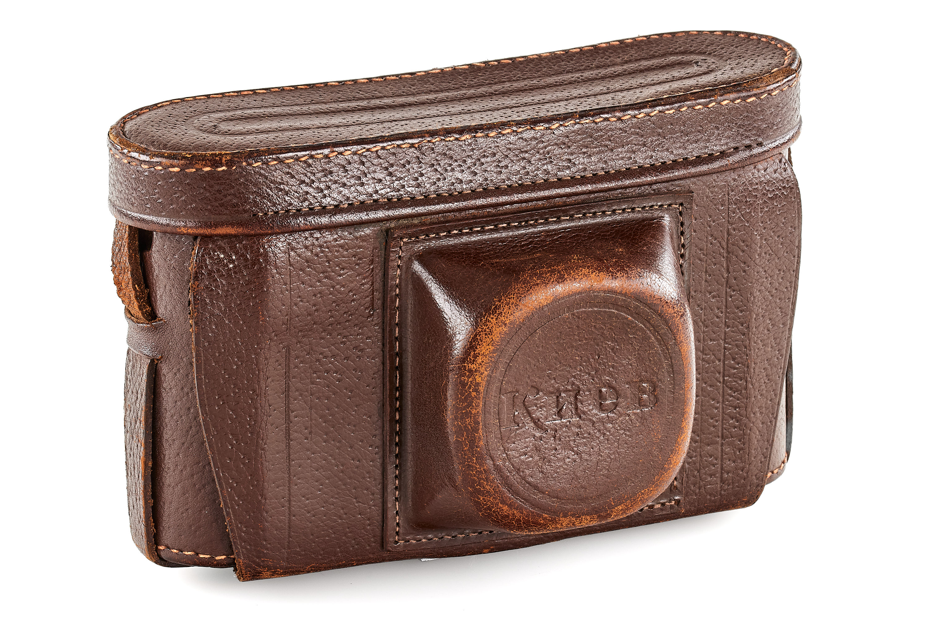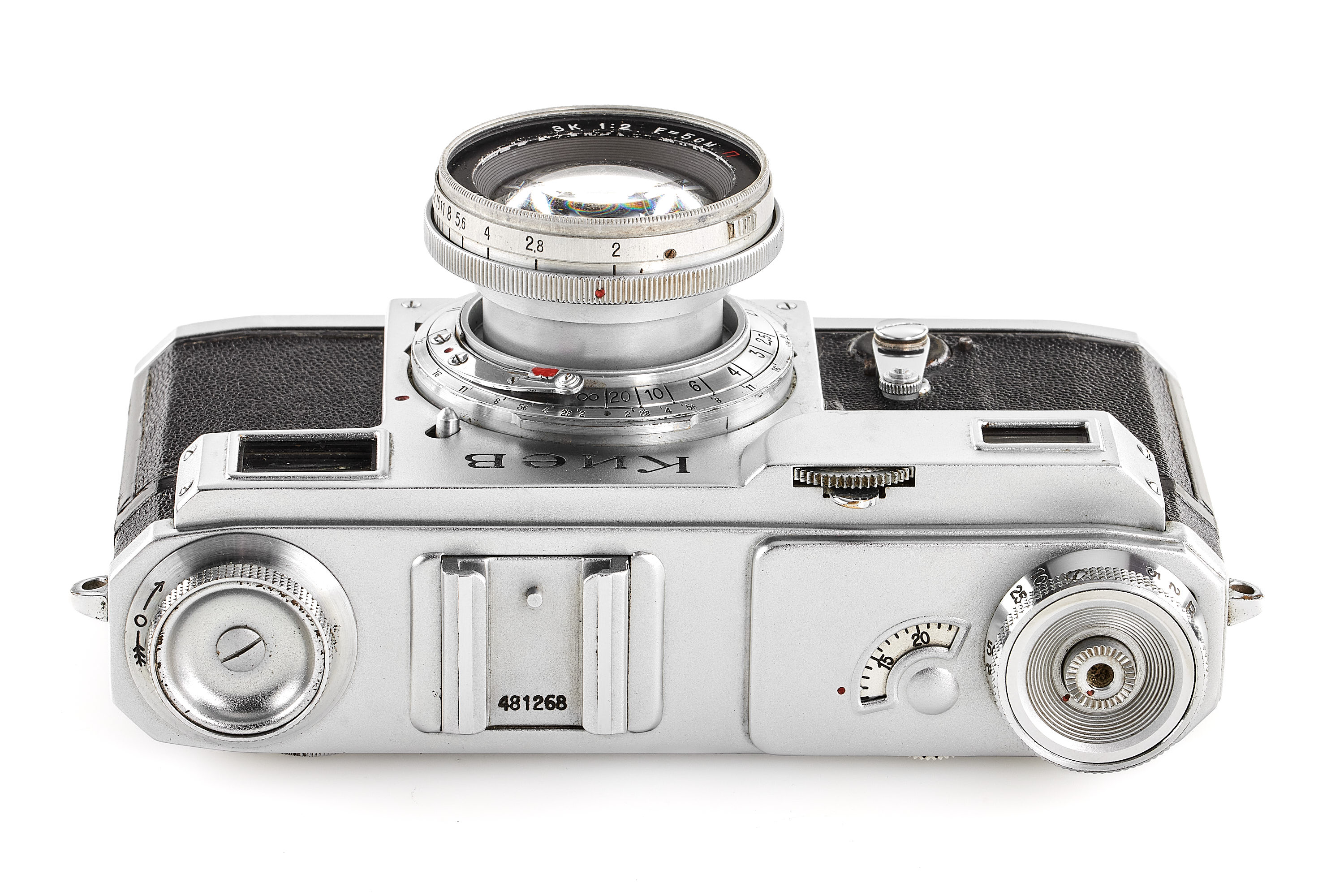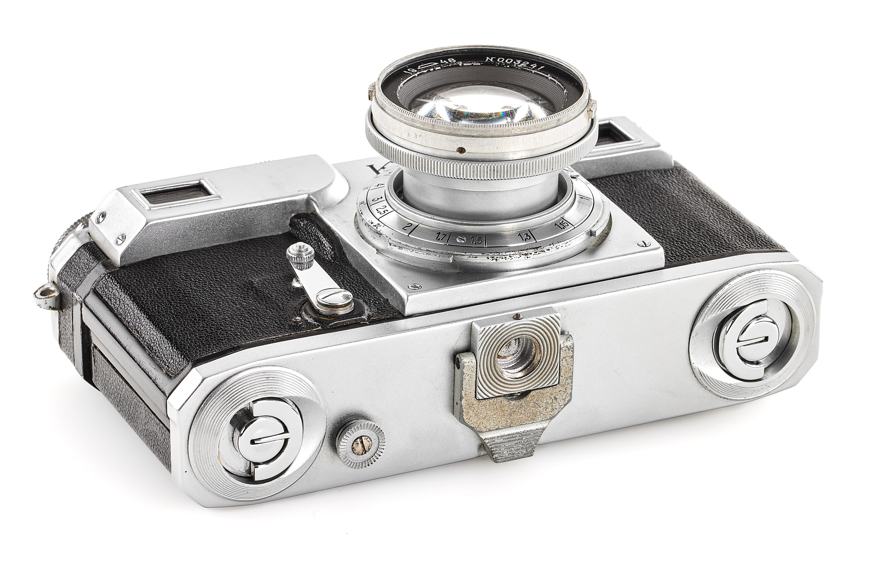 An early Kiev camera, assembled partially with Contax Jena parts, in good condition and working order (shutter speeds not accurate), with matching ZK 1948 2/5cm no.003241 (also assembled using Zeiss parts) showing cleaning marks, with original leather case, only around 2000 of these cameras have been released.