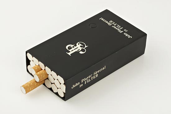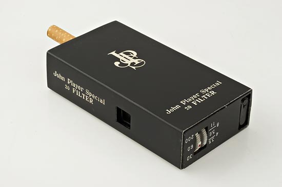 consisting of a metal replica of a pack of John Player cigarettes, with small opening for lens, irregularly protruding "cigarettes", with Kiev 303 16mm subminiature camera body, film is transported by pulling protruding cigarette; with 3.5/23mm Industar lens. With large cigarette box containing an extra film cassette and instruction leaflet. Ex Spira Collection.
