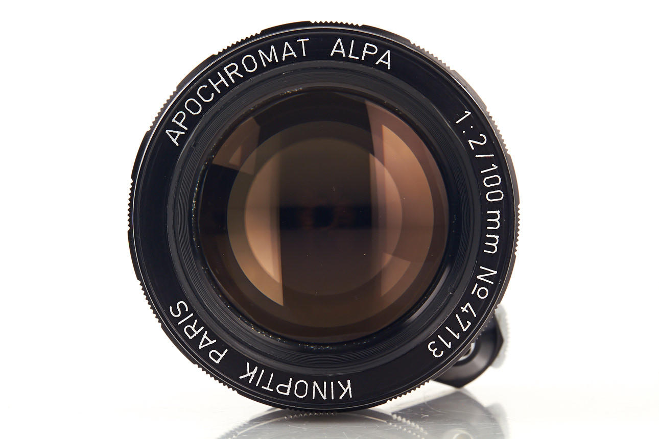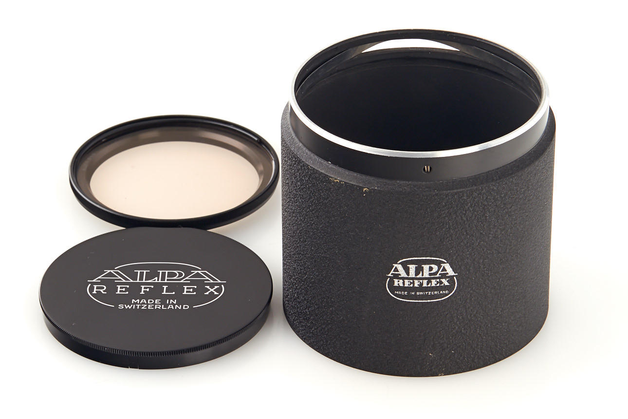 very rare black automatic Alpa lens in beautiful condition, clear optics, original UV filter, both caps, metal hood, leather case