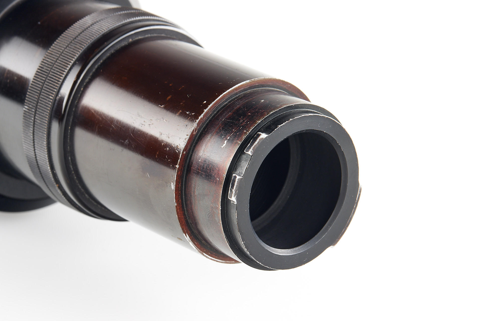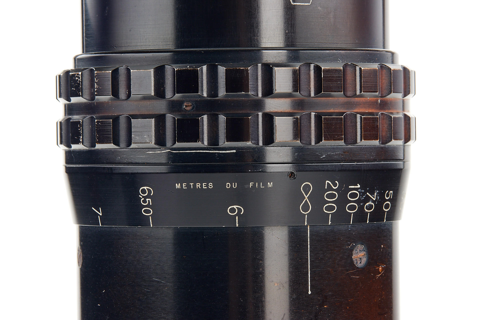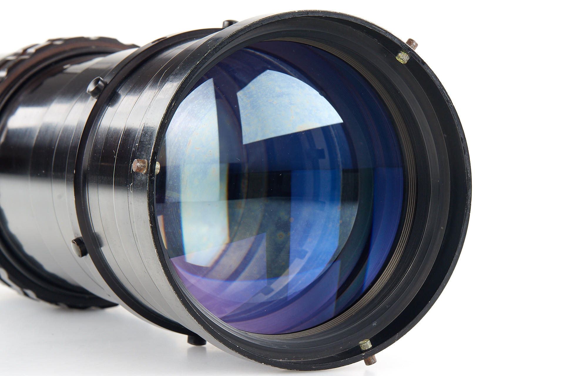 Quite rare 35mm French tele cine lens in Eclair Cameflex mount. Lenses in good condition but showing some degradation in the coatings, including both front and rear protection caps, and metal hood