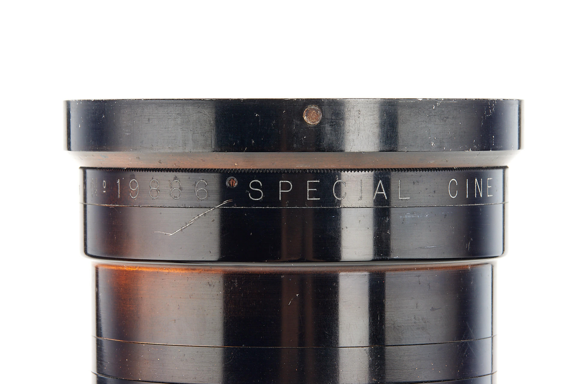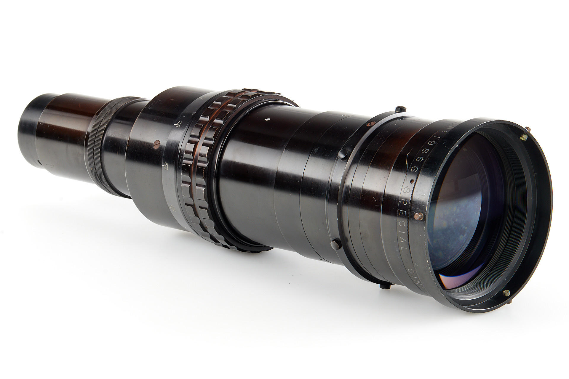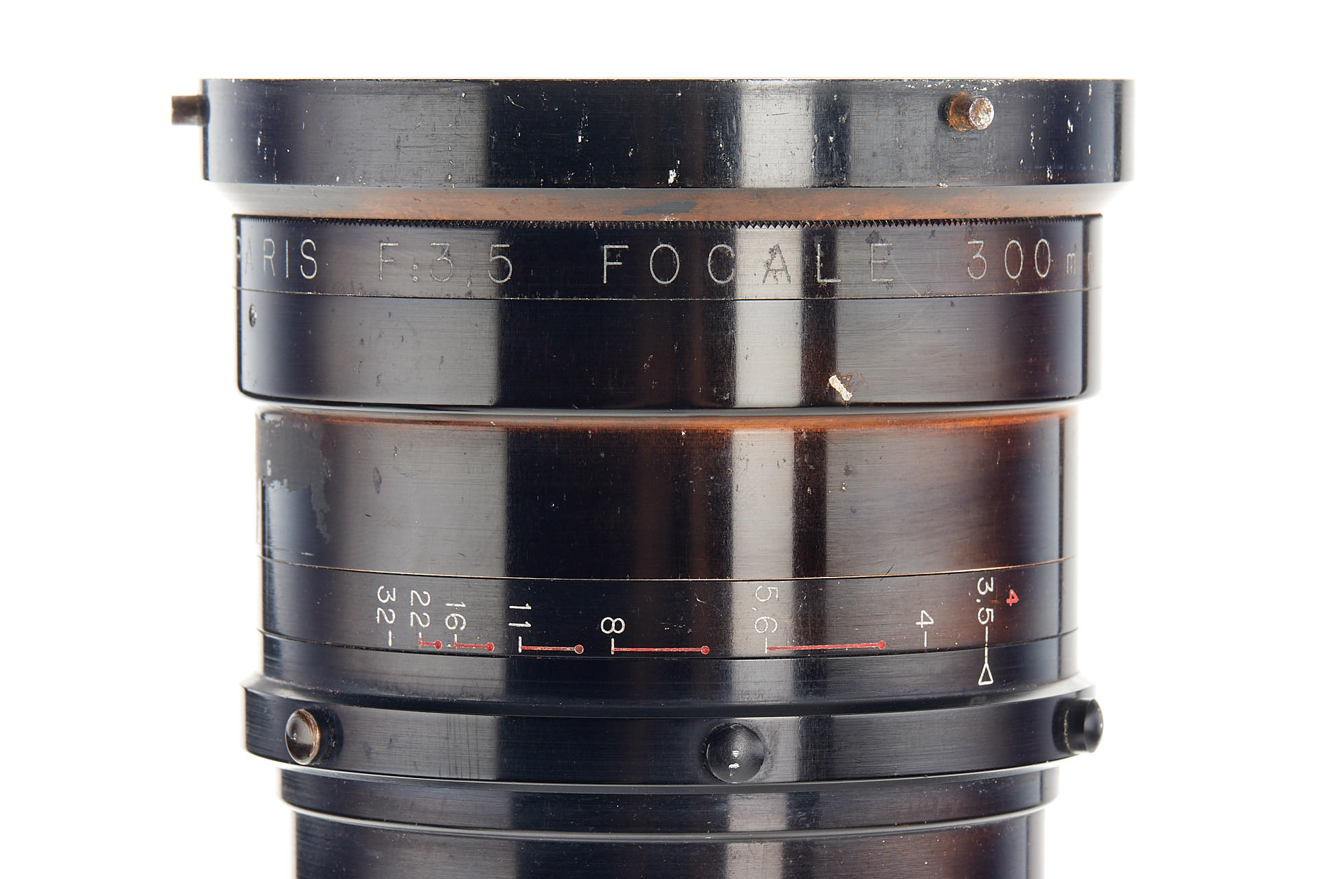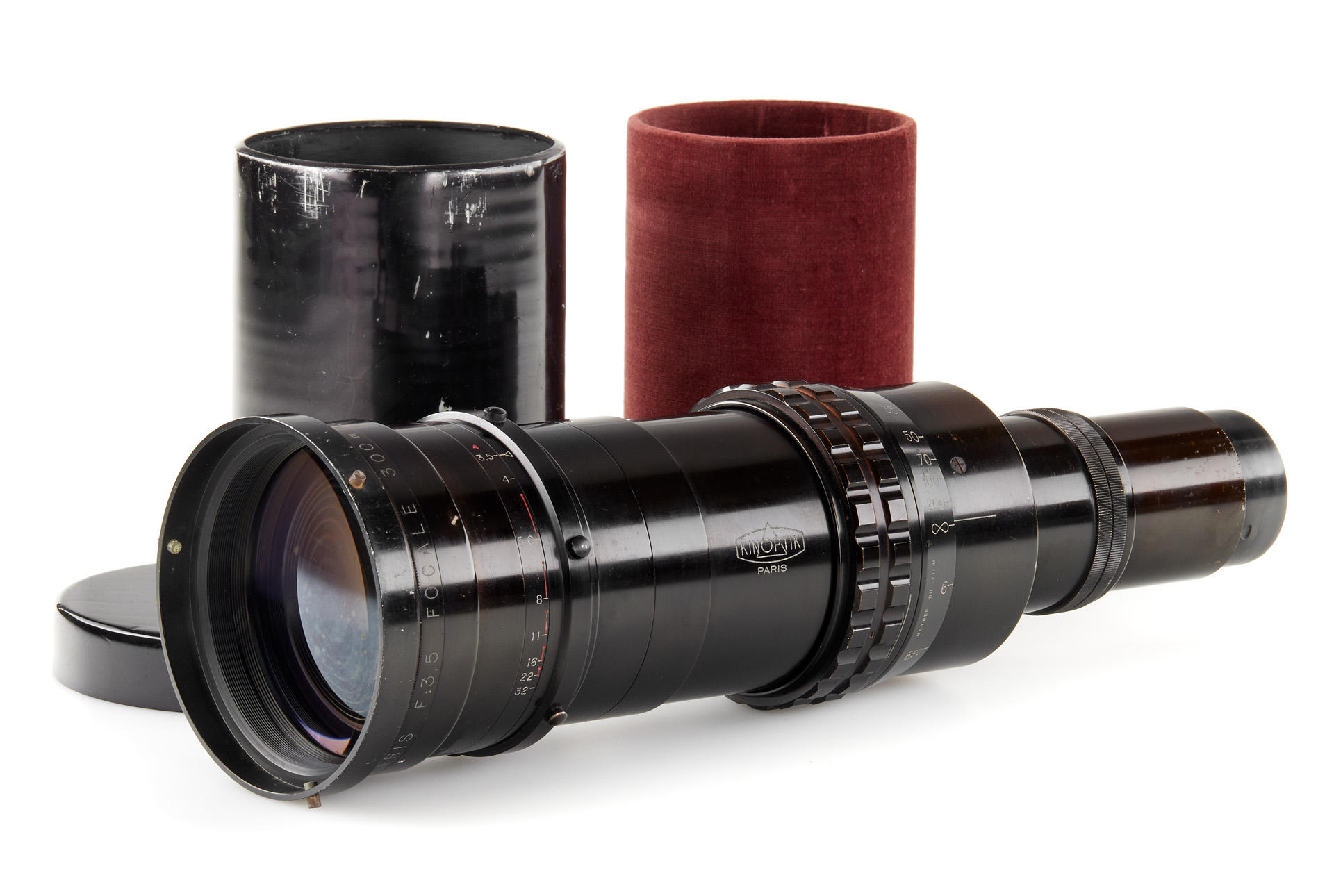 Quite rare 35mm French tele cine lens in Eclair Cameflex mount. Lenses in good condition but showing some degradation in the coatings, including both front and rear protection caps, and metal hood