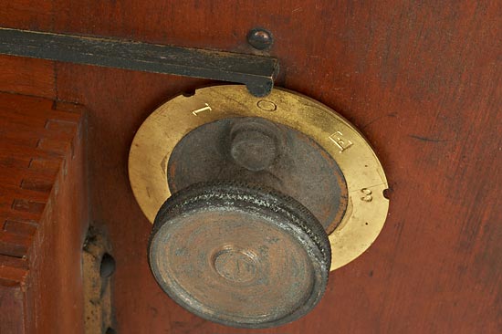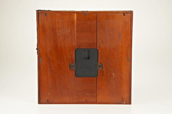 Rare American camera back 33x33cm produced in Bluffton, Ohio, patented February 21, 1893, for a combination of various sizes from 2 to 28 exposures on one plate 4 1/4 x 6 1/2" depending on the combination of rings and diaphragms. With the complete set of index rings and diaphragms. Ex Spria Collection.