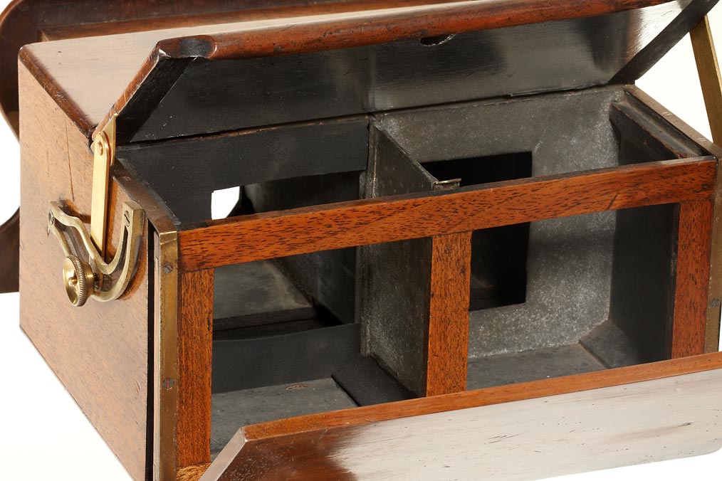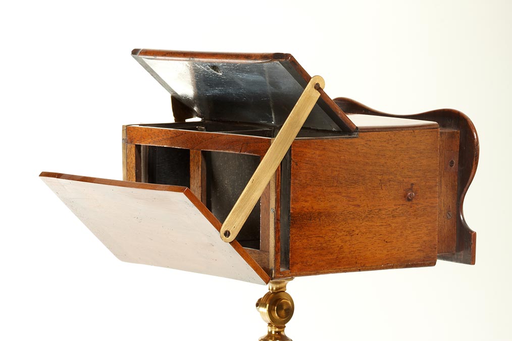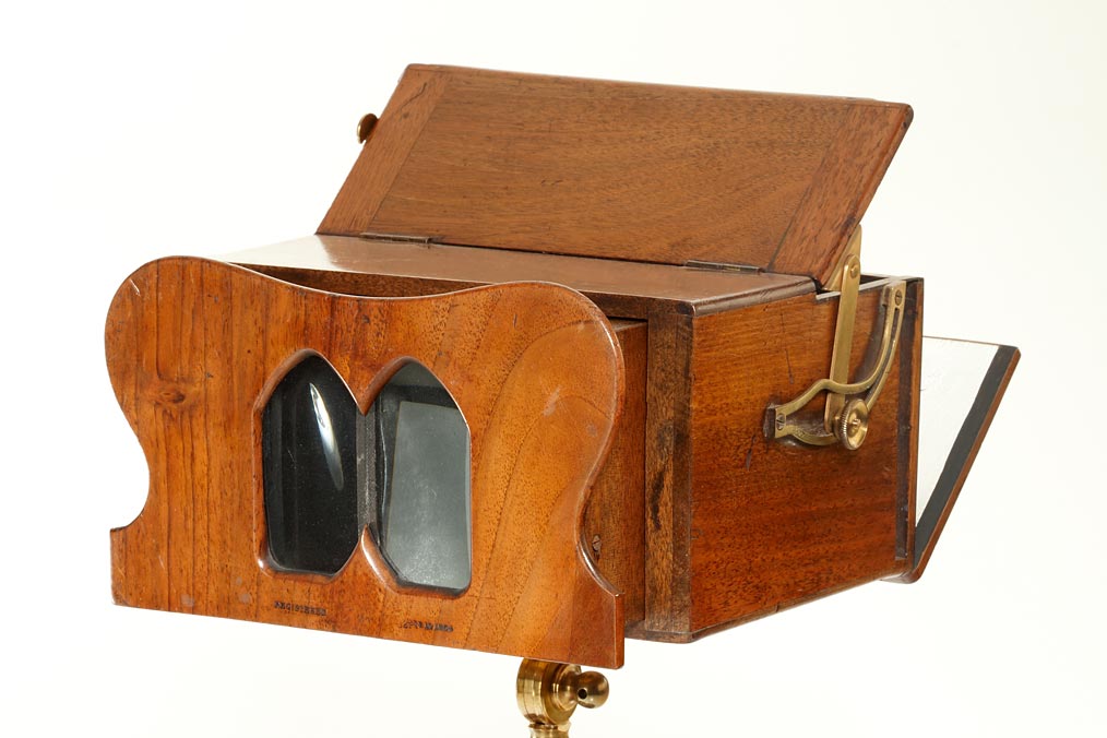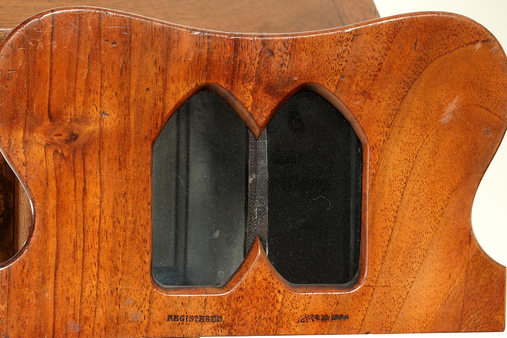 an important early English stereoscope with a characteristic Neo-Gothic design, built to take both slides and cards and to create day-and-night effects due the possibility of interconnecting the hinged mirror and the wooden rear cover, sliding box focus, the viewer and the turned stand are made of solid wood, all metal parts are of brass. The exact date of registration, the 15th September 1854, is embossed on the front. A rare and exceptional viewer from the days of the first public enthusiasm for stereo in the early 1850's.