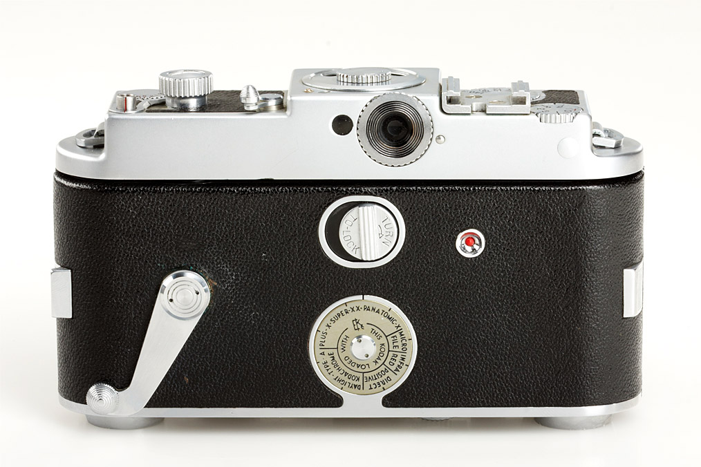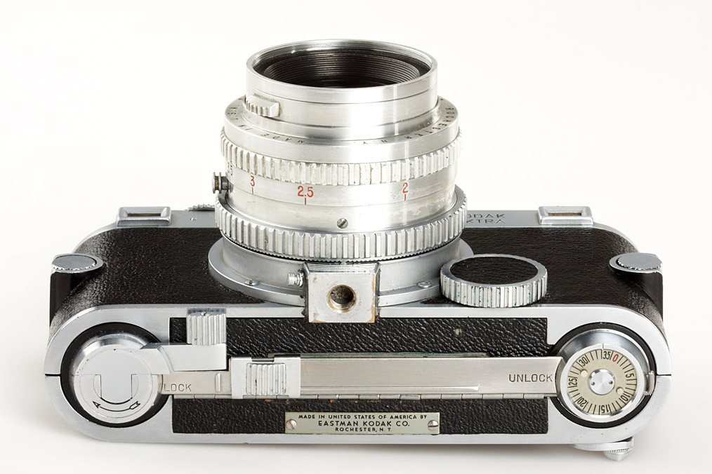 rare 35mm rangefinder camera in very good cosmetically condition, Ektar 1.9/50mm no.1052 (cap), Ektar 3.5/50mm no.EY368 (keeper), Ektar 3.3/35mm no.EO268 P537 (cap, mask, keeper), Ektar 3.5/90mm no.EY215 (cap, keeper), Ektar 3.8/135mm no.EC156 (cap, keeper), very rare Ektar 4.5/153mm no.EY135 (caps), high-low angle finder (very rare), prism finder, close-up rangefinder, both magazines with the matching body number, brown outfit leather case, all lenses in a separate outfit case - the most complete outfit we have seen