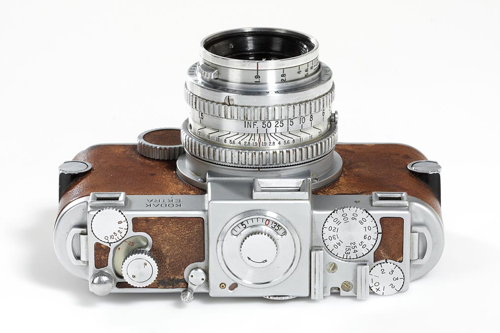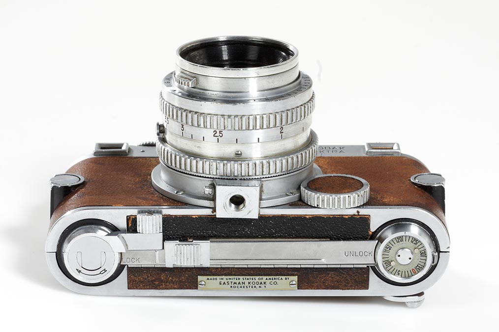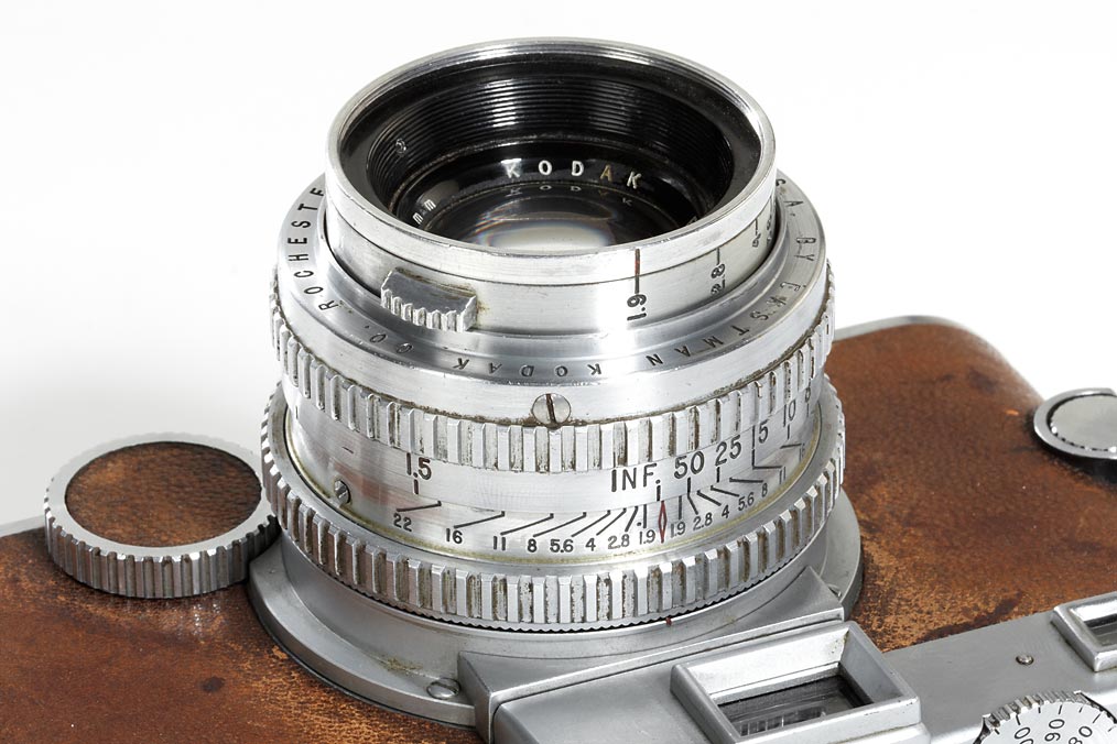 body in good optically condition, leather is used, shutter needs attention, with Ektar 1.9/50mm no.ER492 and Ektar 3.5/50mm no.EY472, magazine no.2549, with outfit case and instruction book