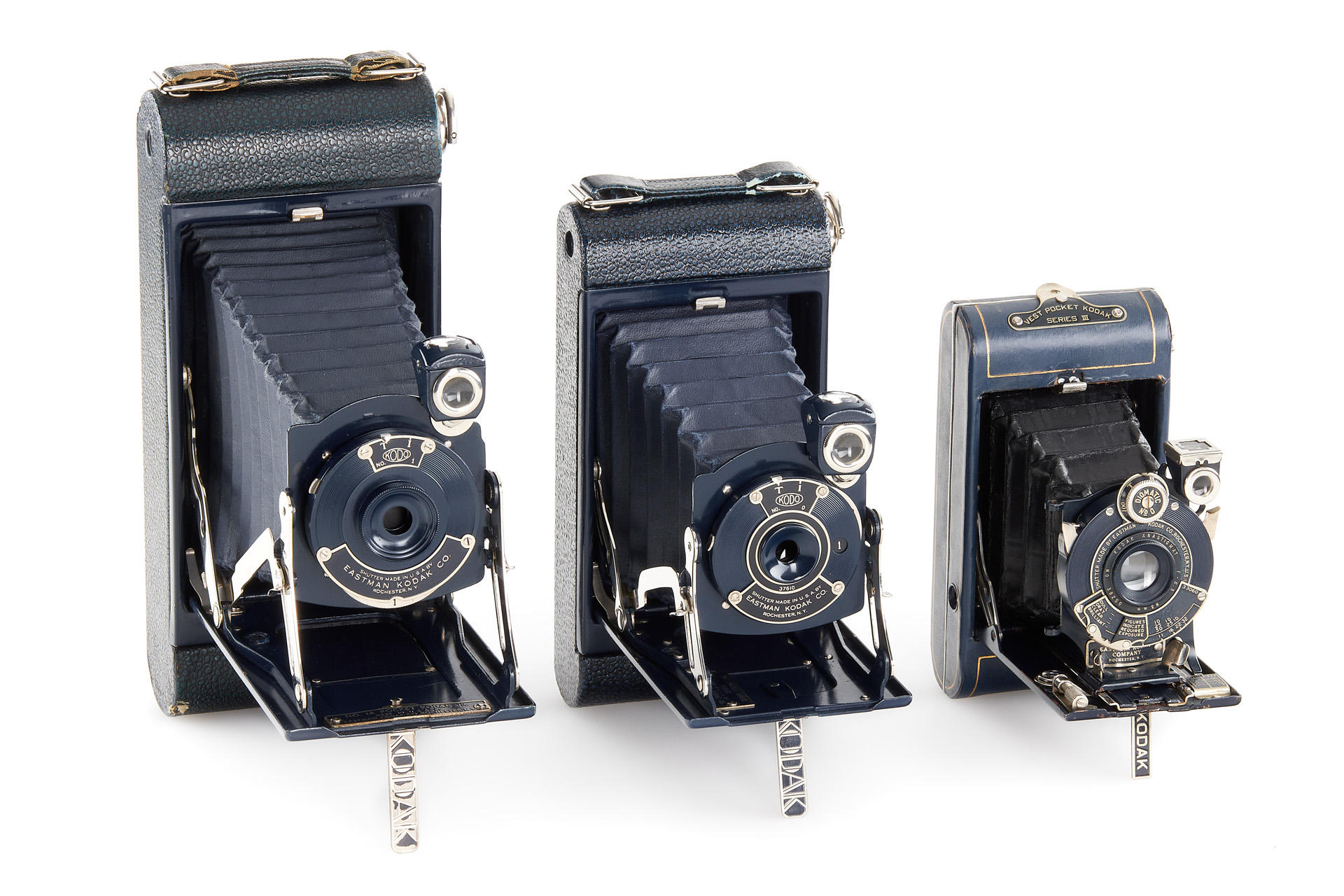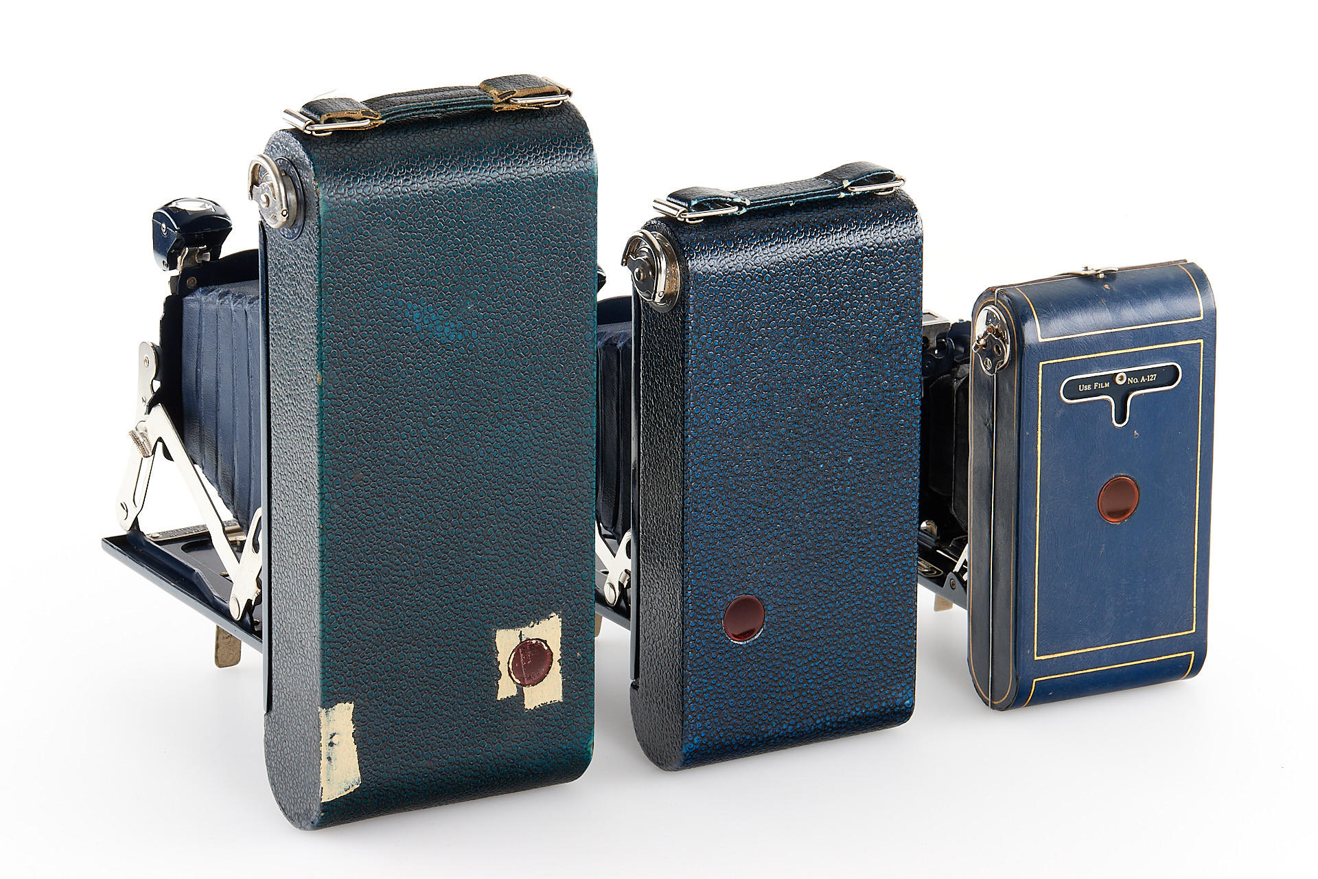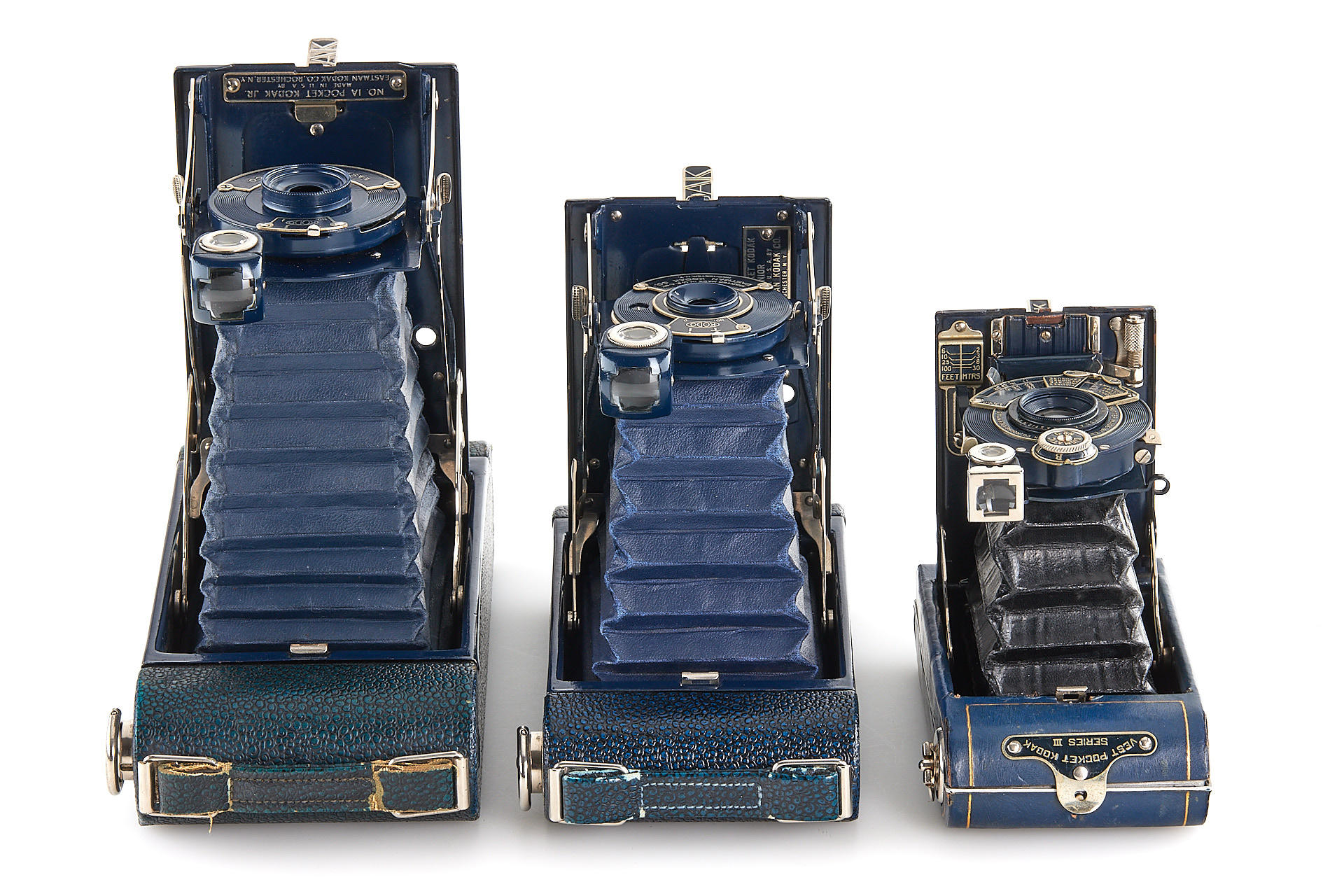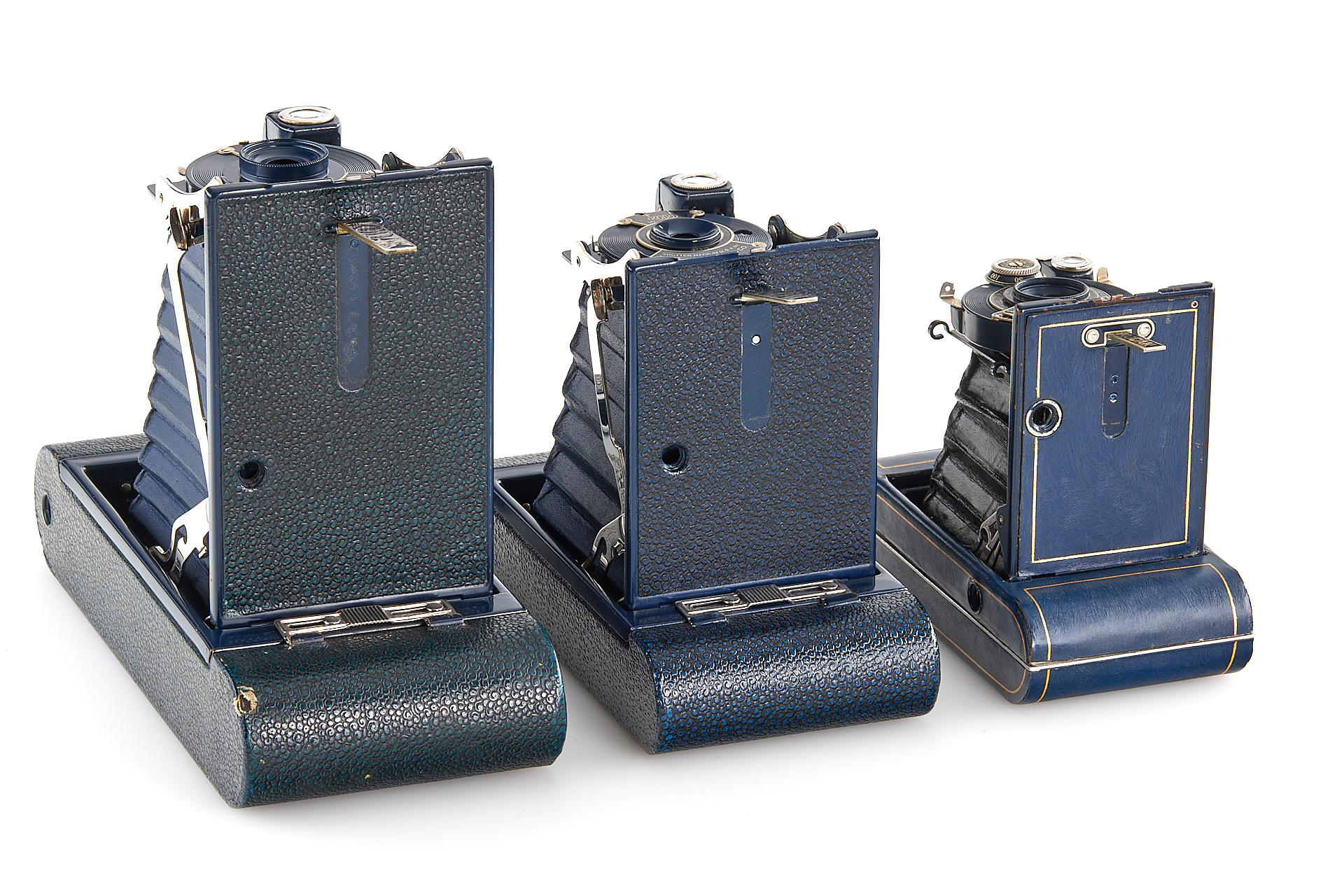 set of three uncommon Kodak folding-bed rollfilm cameras in blue finish: (1) Vest Pocket Kodak Series III, (2) No.1 Pocket Kodak Junior, (3) No.1A Pocket Kodak Junior; each with matching blue case