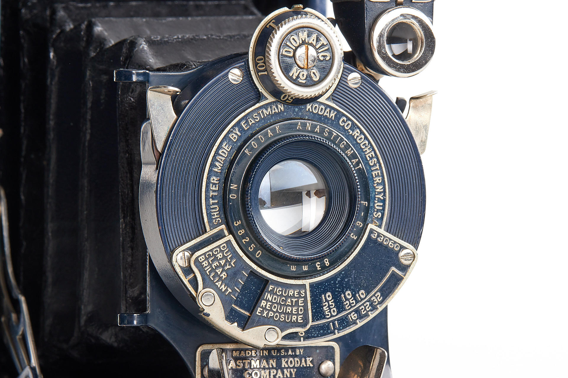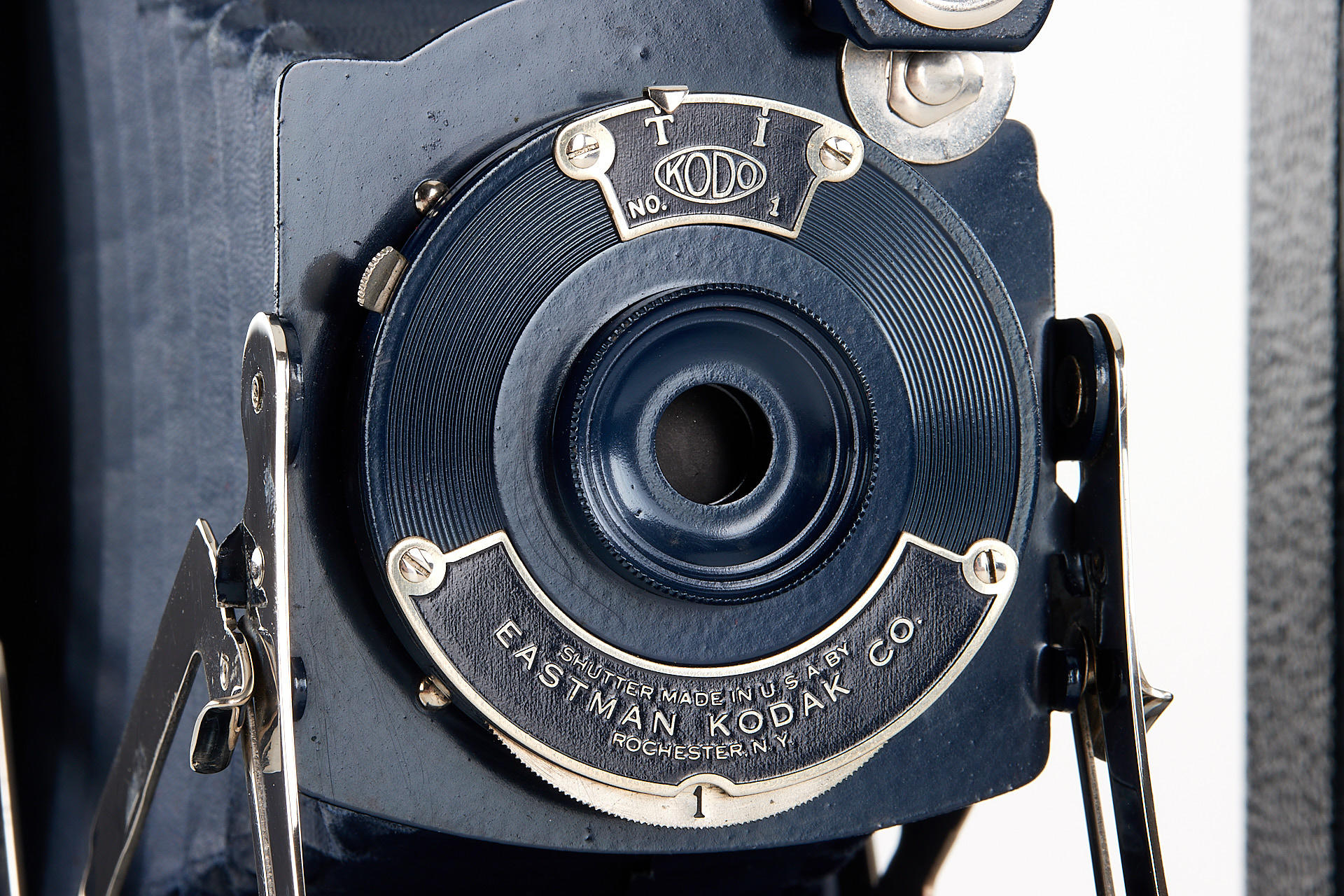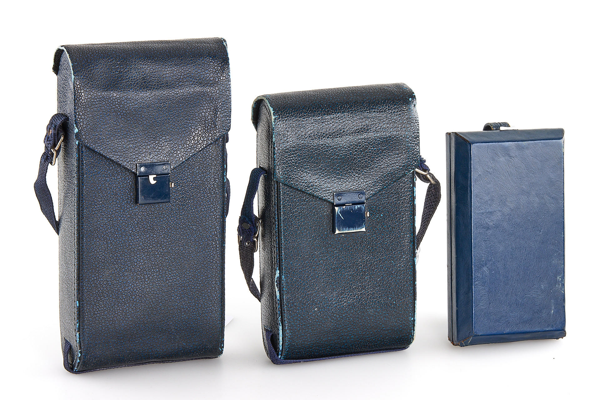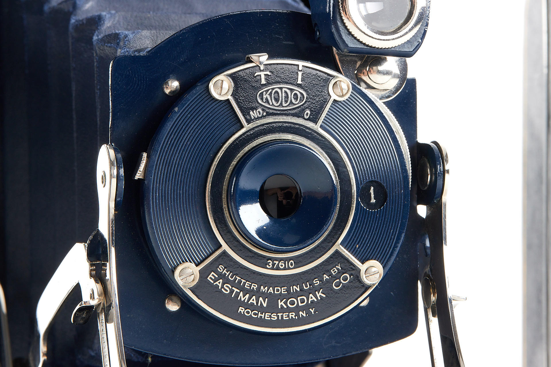 set of three uncommon Kodak folding-bed rollfilm cameras in blue finish: (1) Vest Pocket Kodak Series III, (2) No.1 Pocket Kodak Junior, (3) No.1A Pocket Kodak Junior; each with matching blue case