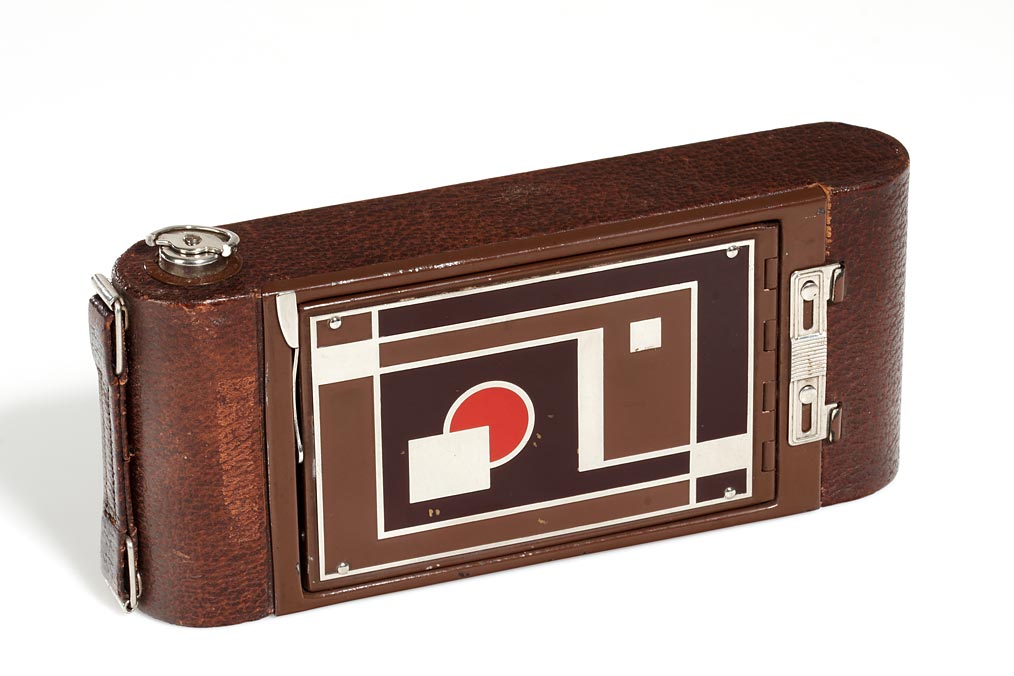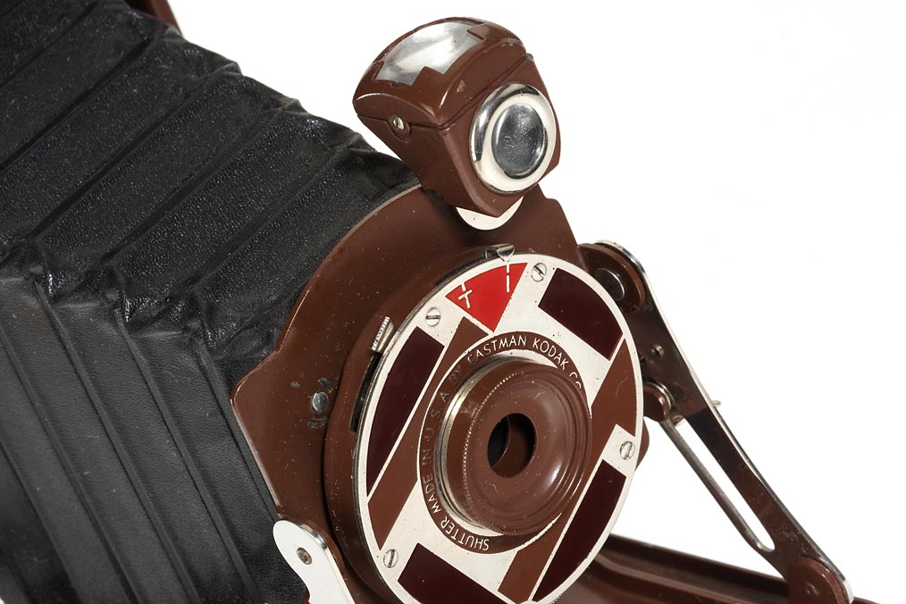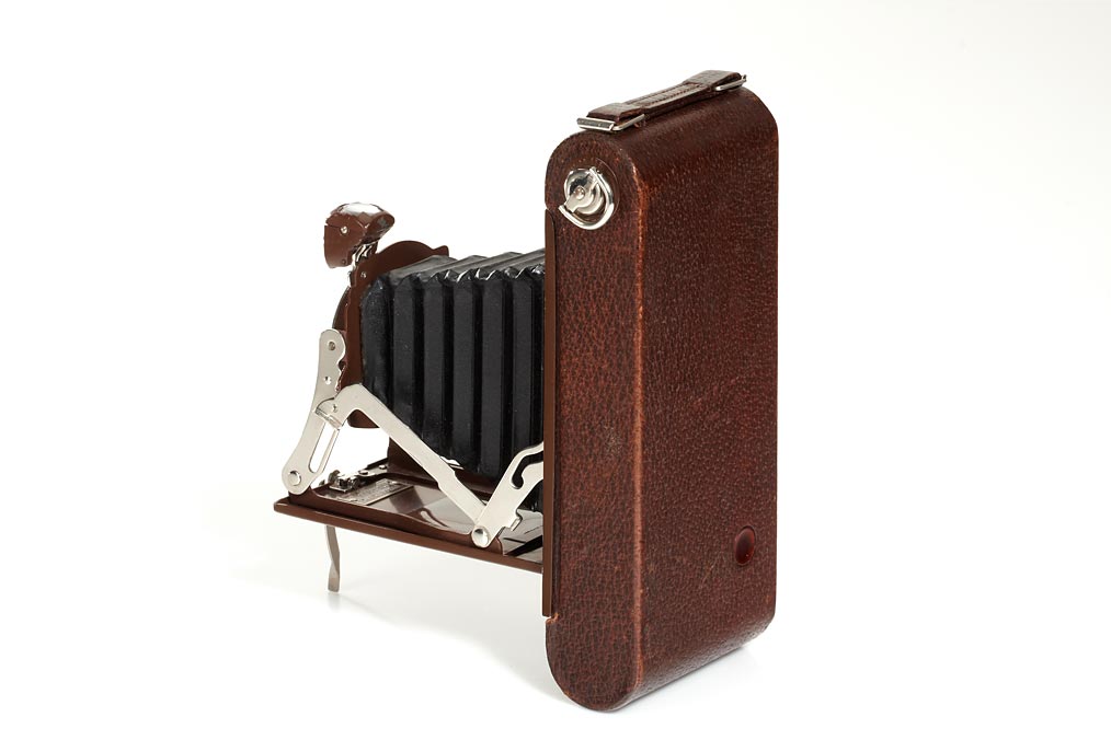 classic camera in original condition, covered with brown genuine leather, black bellows