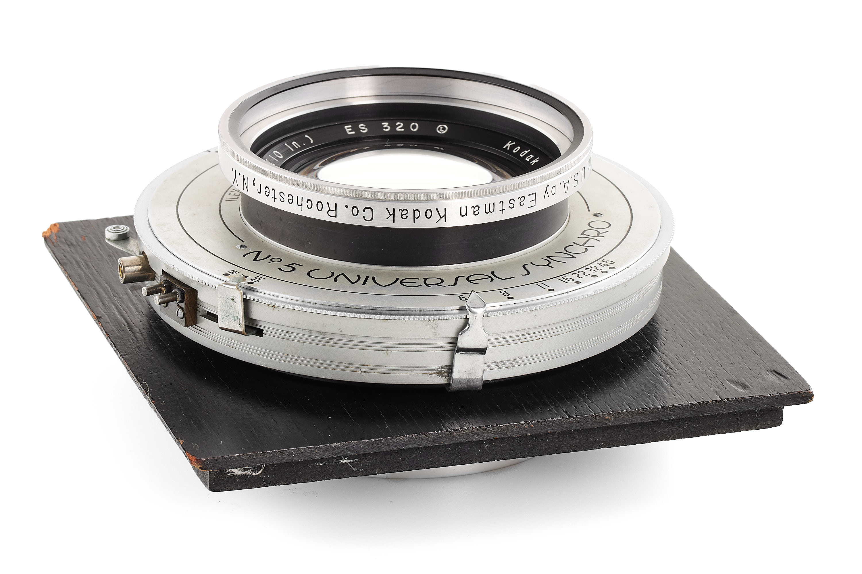 Very rare wide-angle Kodak lens for large format, mounted in Ilex No5 shutter, in good condition and working order, coated optics only showing some flakes and light cleaning marks, covering up to 11x14", with 15x15cm wooden lens board and both Aluminium caps.