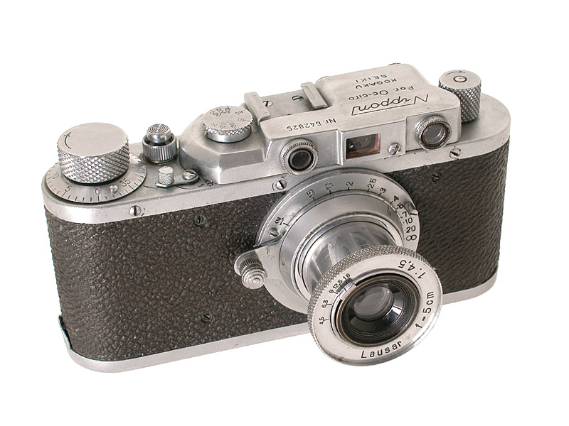 Leica II Kopie mit Gravur auf Deckkappe: Nippon For.Oc-ciro KOGAKU SEIKI, Lausar 4,5/5cm Nr.2006, Gravur auf Bodenplatte: MADE IN OCCUPIED JAPAN, wir konnten keine Information über diese Kamera bekommen (Prototyp ?)