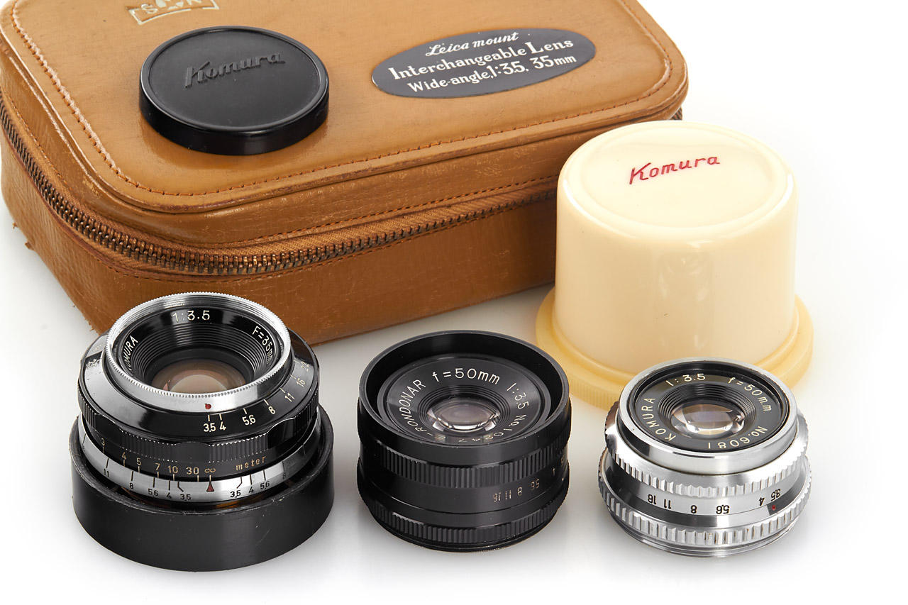 uncommon black paint, M39 rangefinder-coupled version in very good condition, clean optics, with front and rear cap, original leather case, together with enlarging Komura 3.5/50mm no.6081 (in keeper) and enlarging E-Rondonar 3.5/50mm no.10247