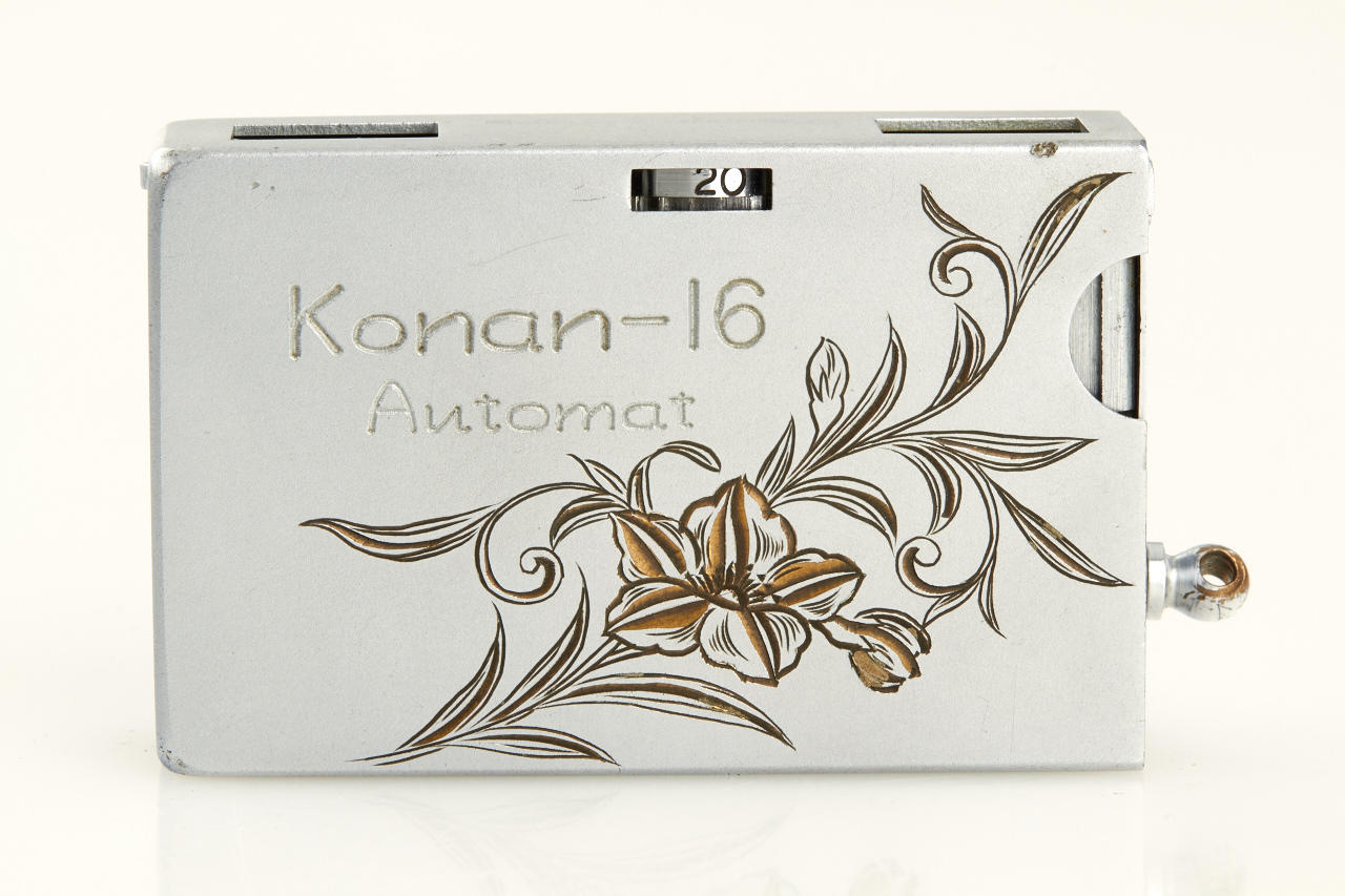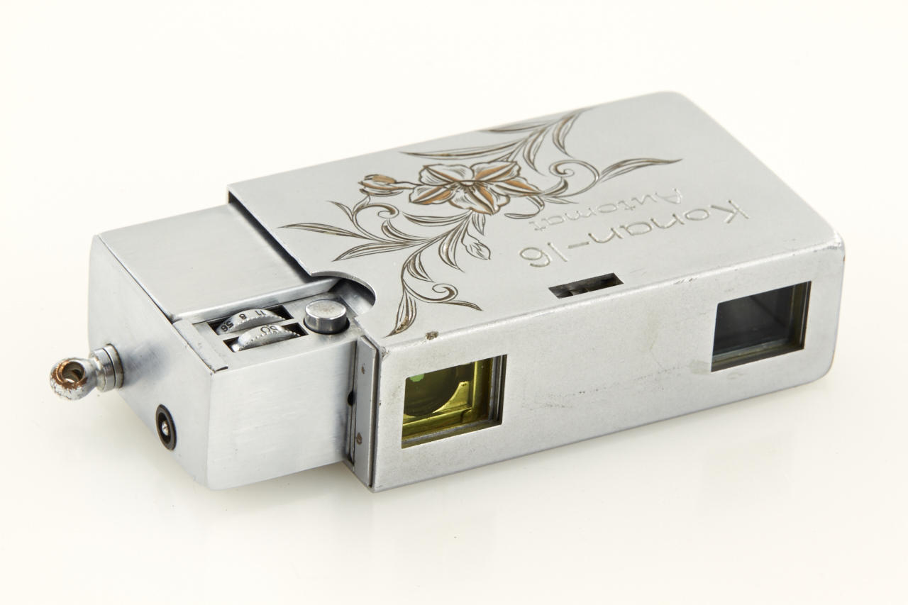 Made in Occupied Japan, rare subminiature camera for 16mm film, precursor of the Minolta 16, very good condition, flower design engraving on top, inclusive leather case, orange filter and close-up lens