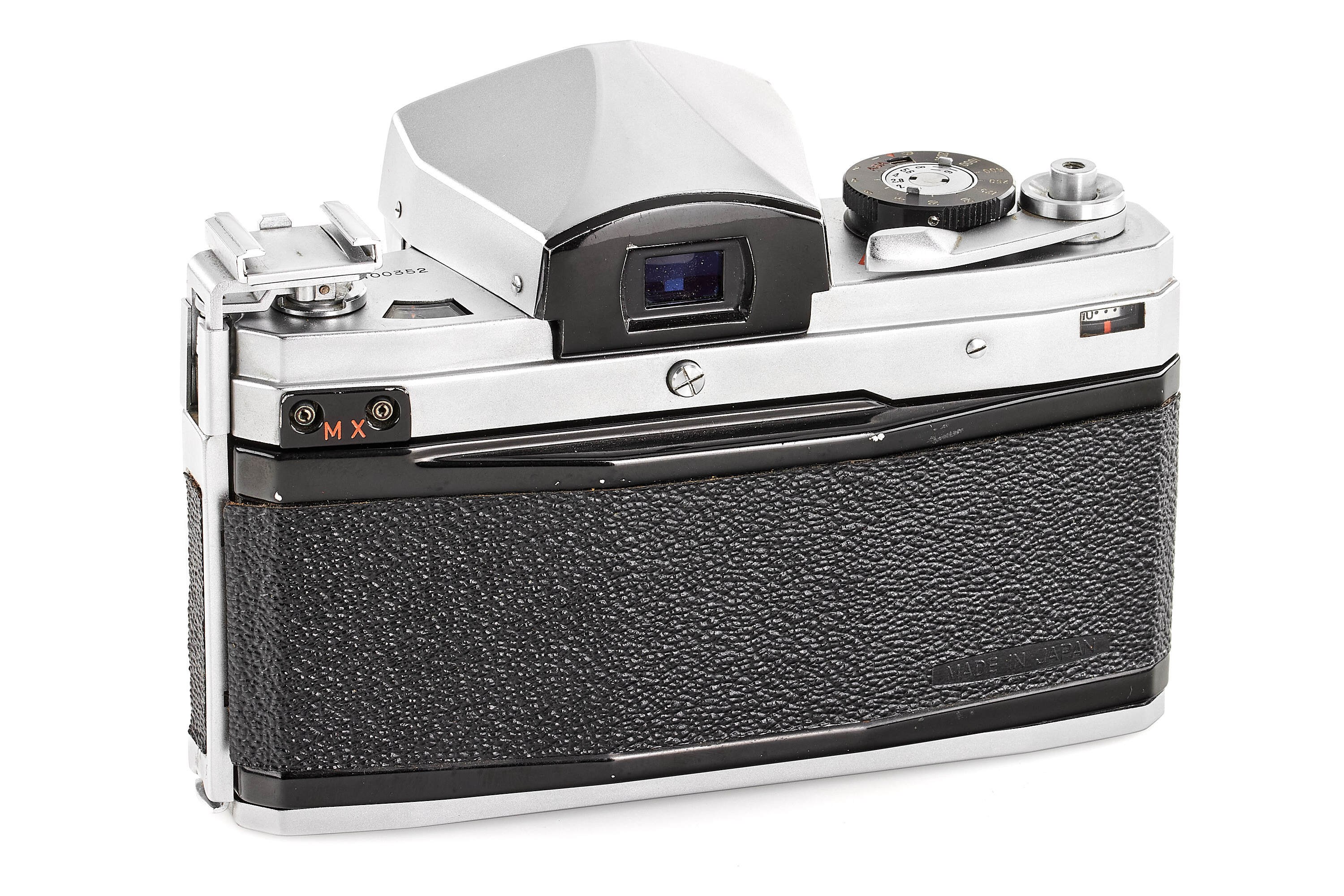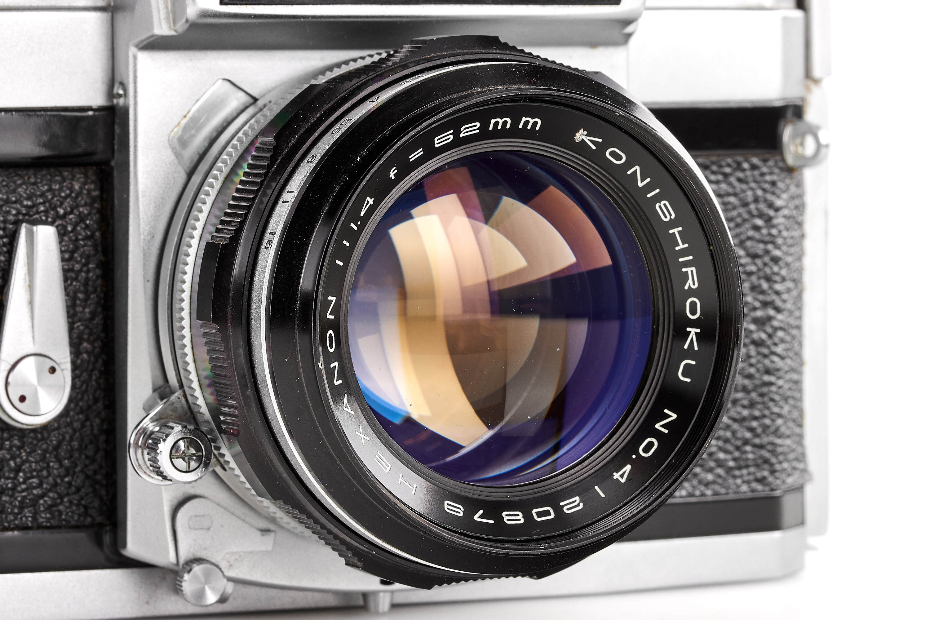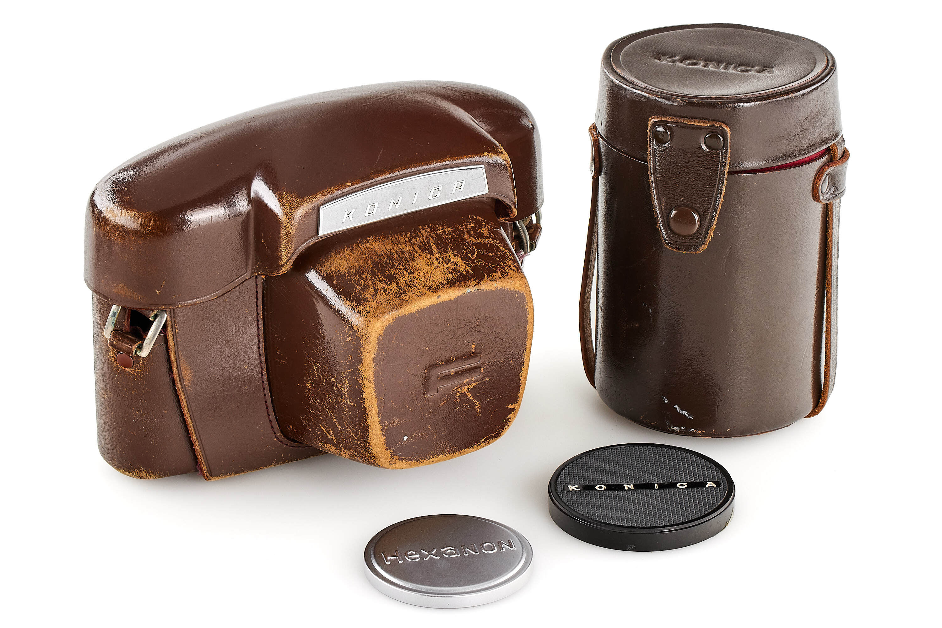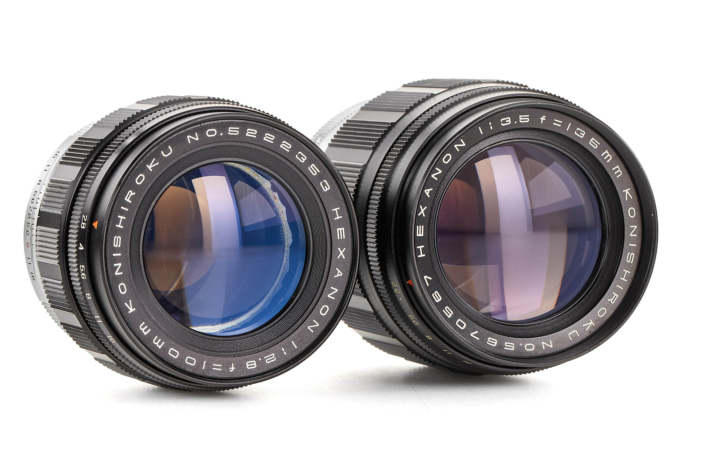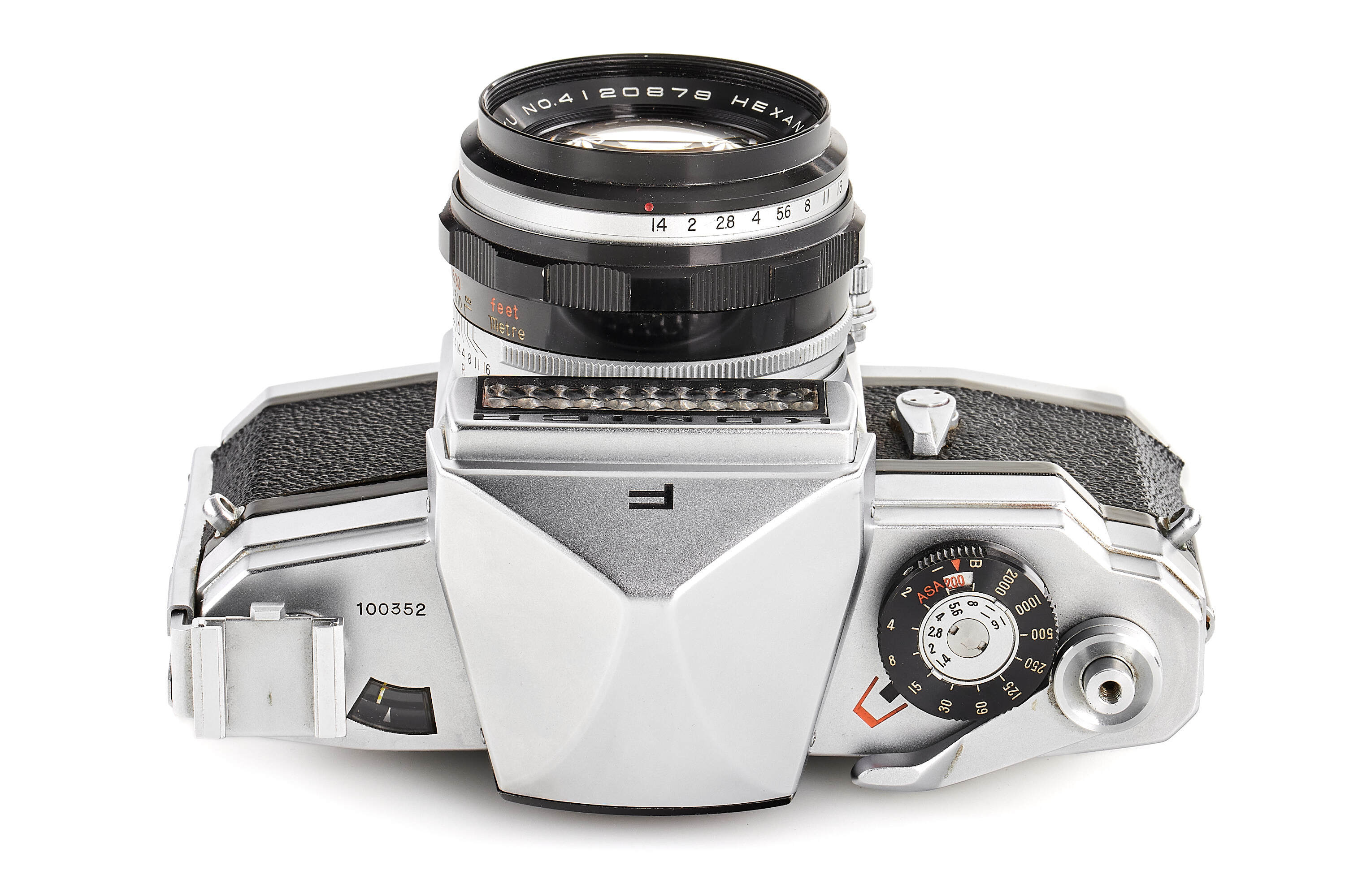 The camera features a robust die-cast body, a newly developed bayonet mount, and advanced shutter speeds up to 1/2000 s – a remarkable achievement at the time. Offered here in beautiful, near-mint condition with well-preserved mechanics, including the standard Hexanon 1.4/52mm no.4120879, Hexanon 2.8/100mm no.5222353, a Hexanon 3.5/135mm no.5670567 and a leather case. It is an excellent example of a landmark model in the history of Japanese SLR development, and an important piece for any serious collector of early post-war cameras.