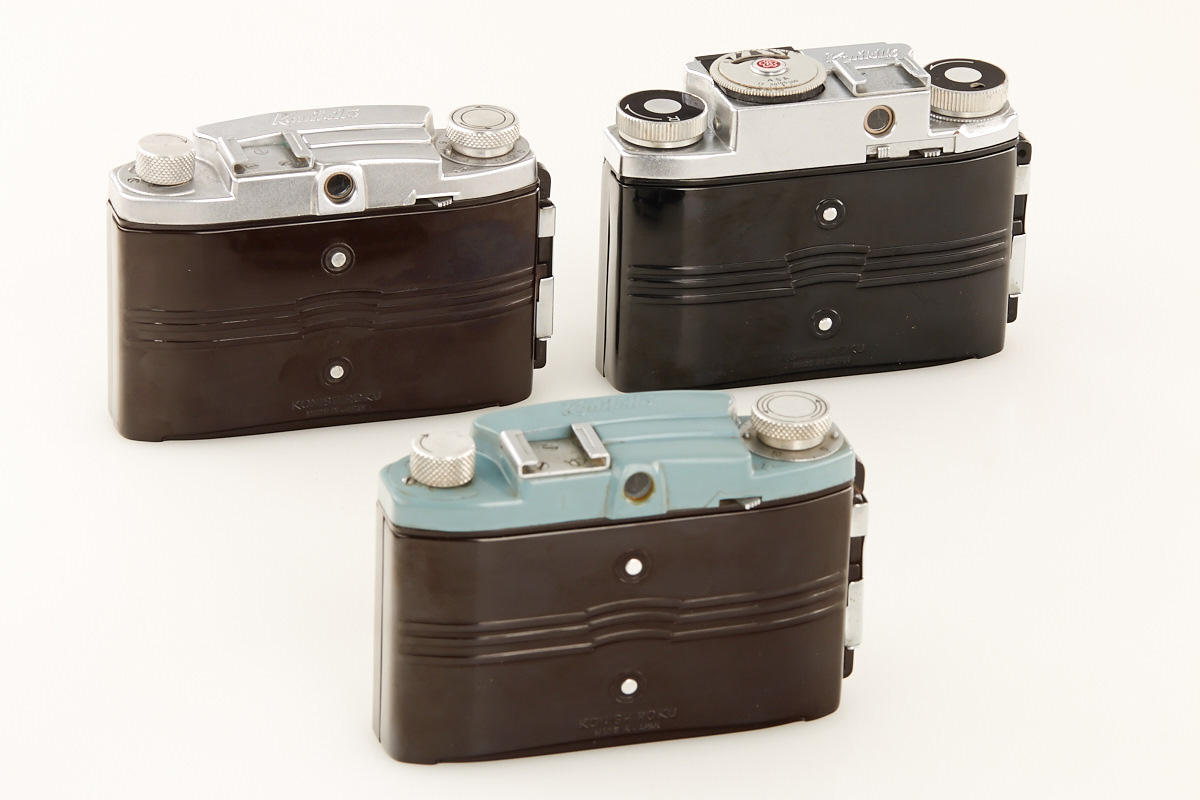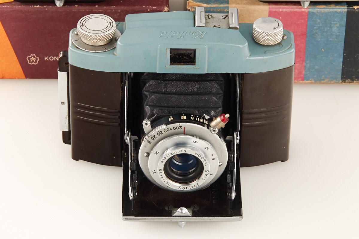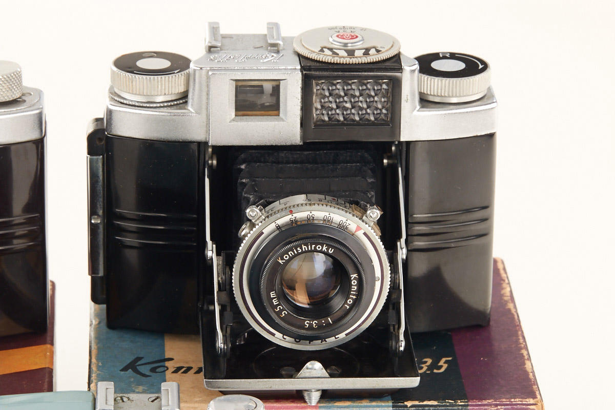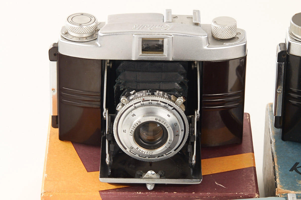 lot of three rare bakelite cameras for unperforated 35mm film, all in near mint condition: (1) Konilette - first version with Konitor 3.5/50mm no.131070 incl. boxed everready case, strap, hood, bellows needs replacement (2) Konilette II with Konitor 3.5/50mm no.231427 incl. matching maker's box and Japanese manual, (3) Konilette IIM with Konitor 3.5/55mm no.217667 in matching maker's box with all papers