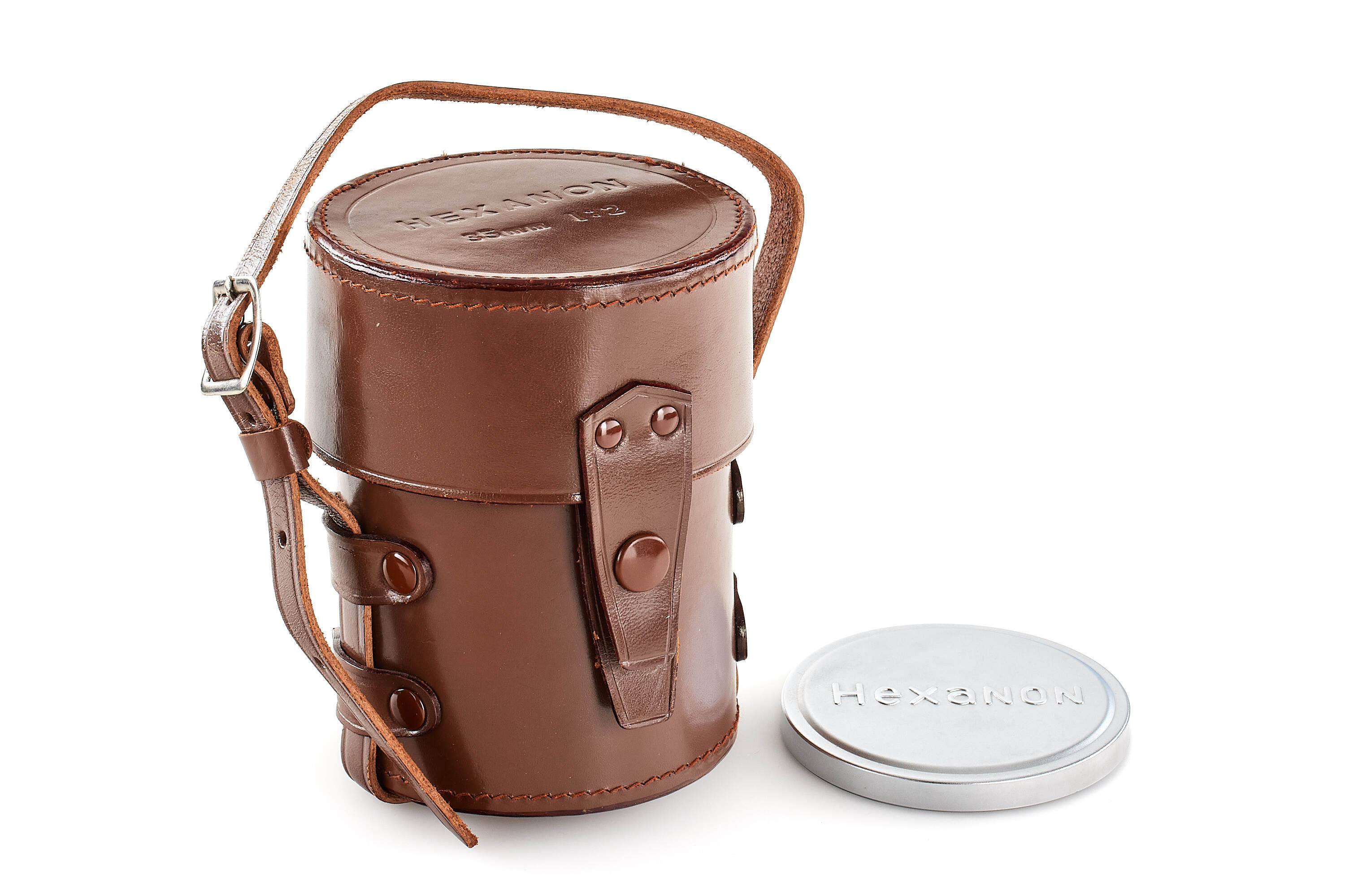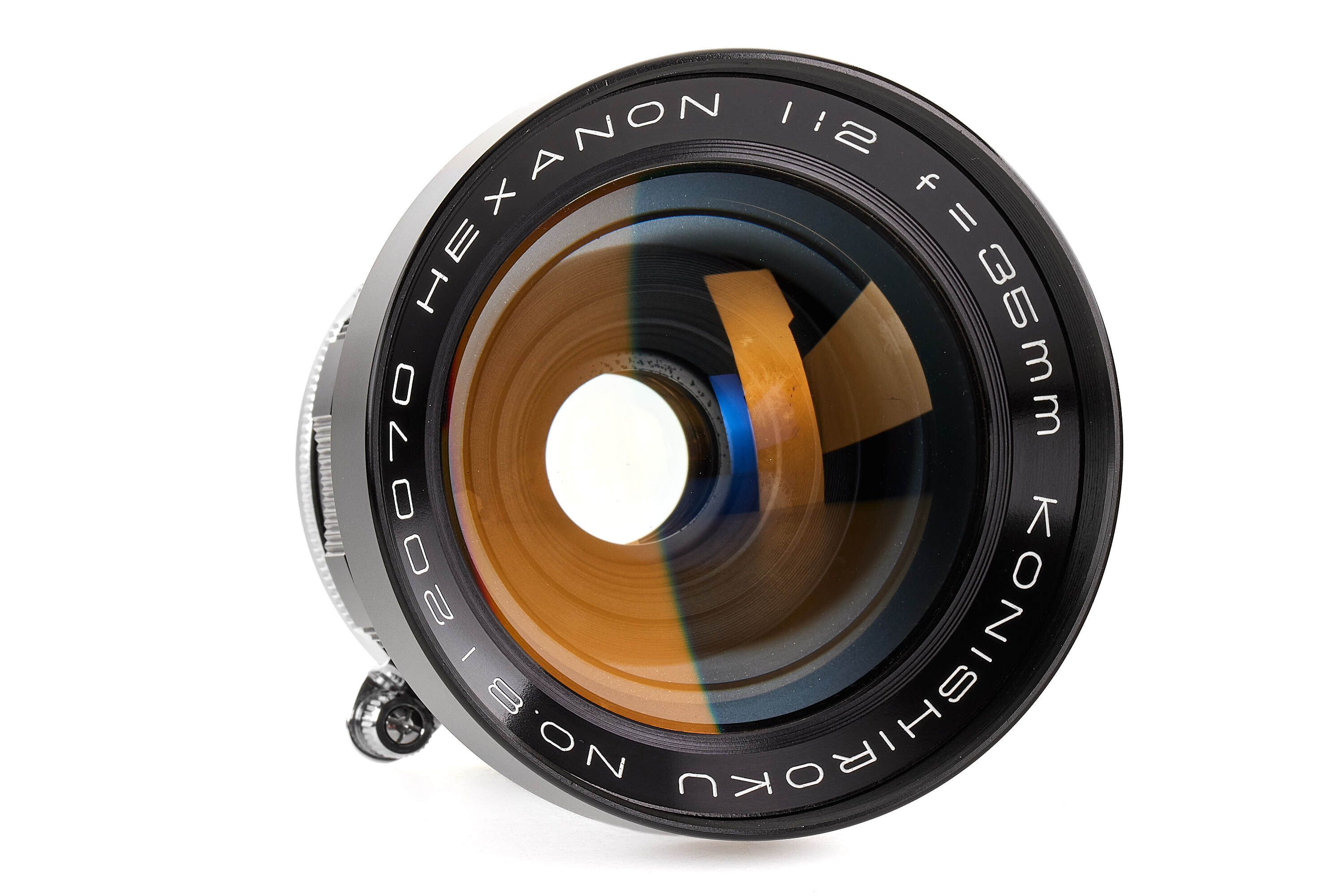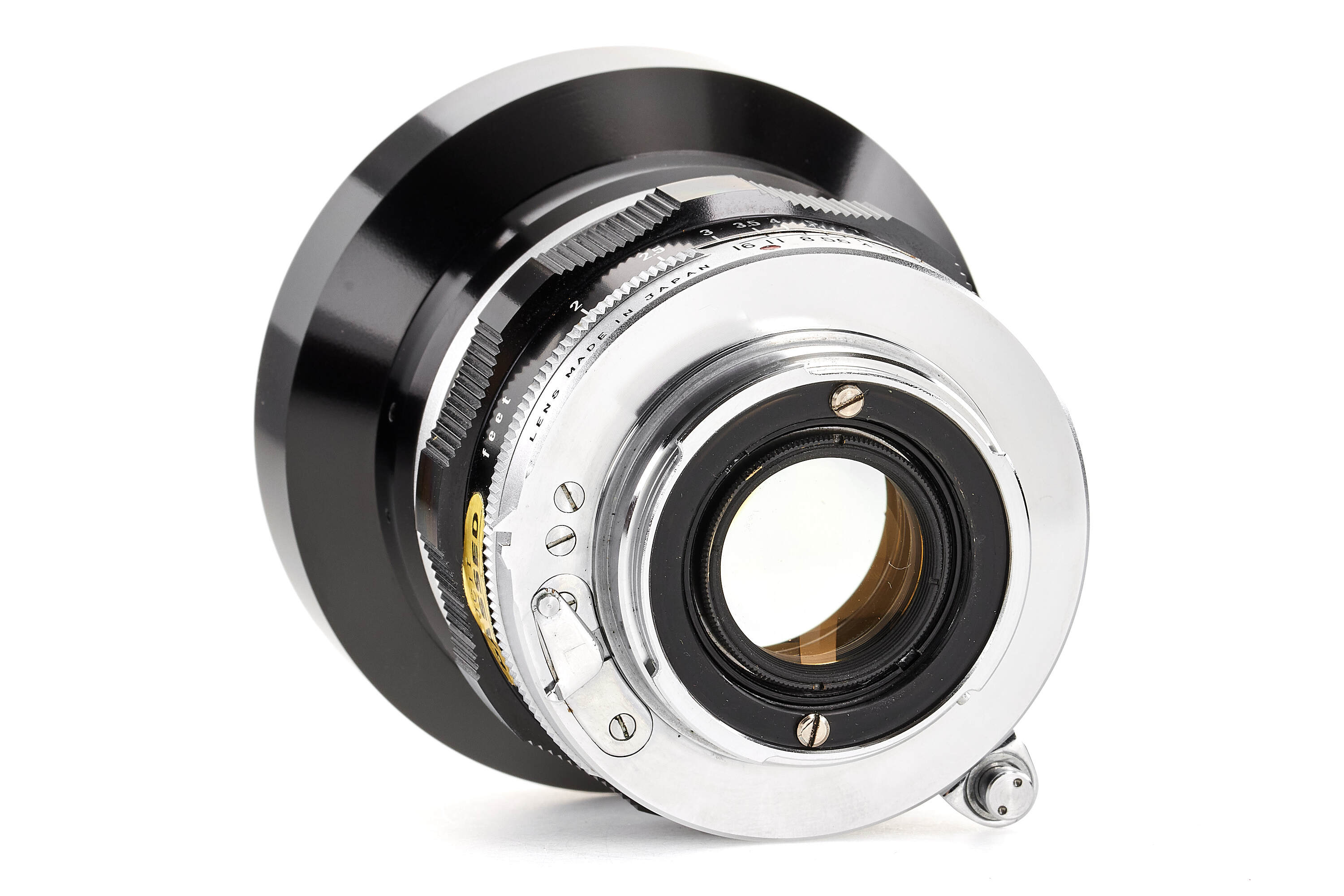 Extremely rare fast wide angle for the iconic Konica F, first 35mm SLR camera to reach 1/2000 sec. shutter speed, only produced in very small quantities (between 600 and 1500), it never came onto the market, in mint condition, with front lens cap and original leather case.