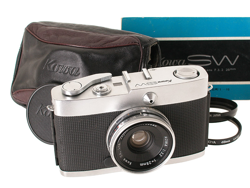 Chrom Version, seltene Weitwinkelkamera mit 3,2/28mm Kowa Nr.700289, Filter, Blende, Deckel, Tasche, Anleitung