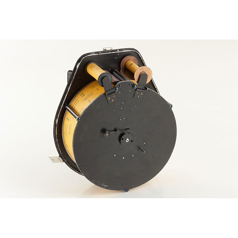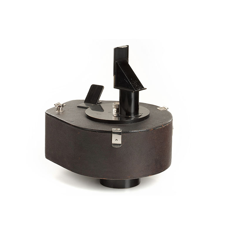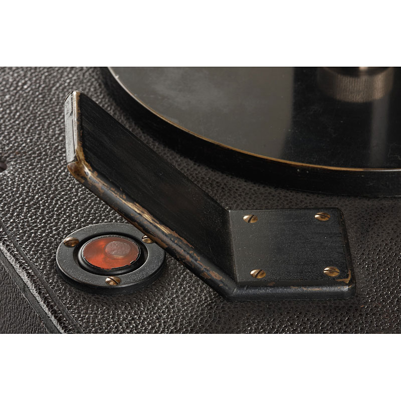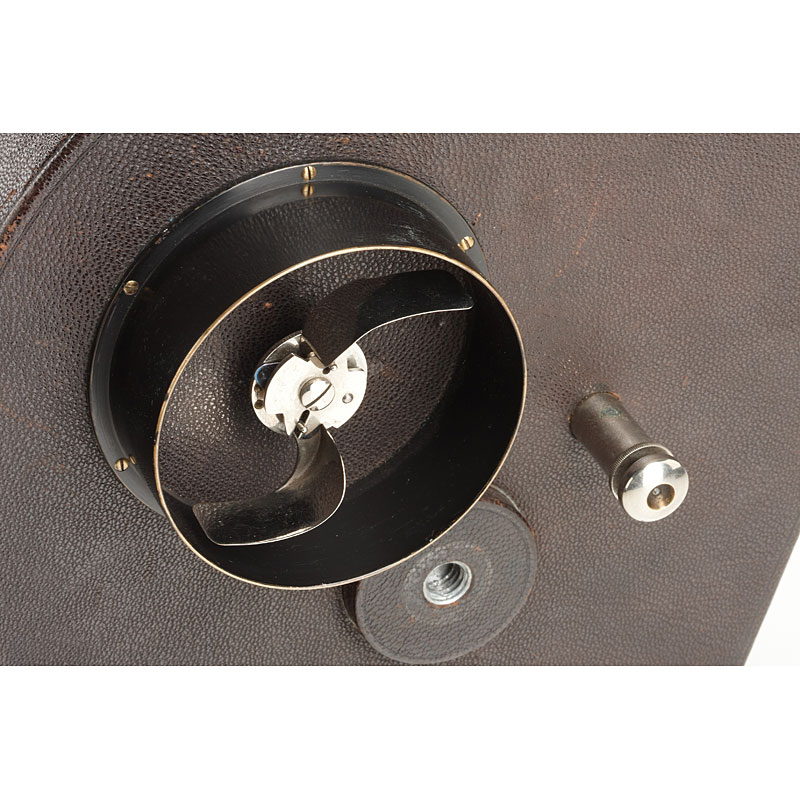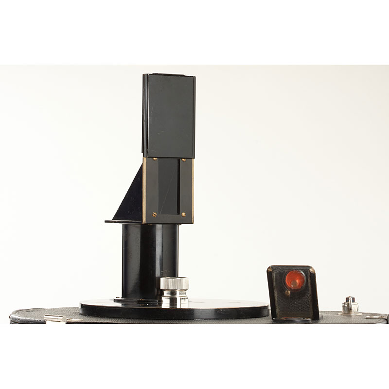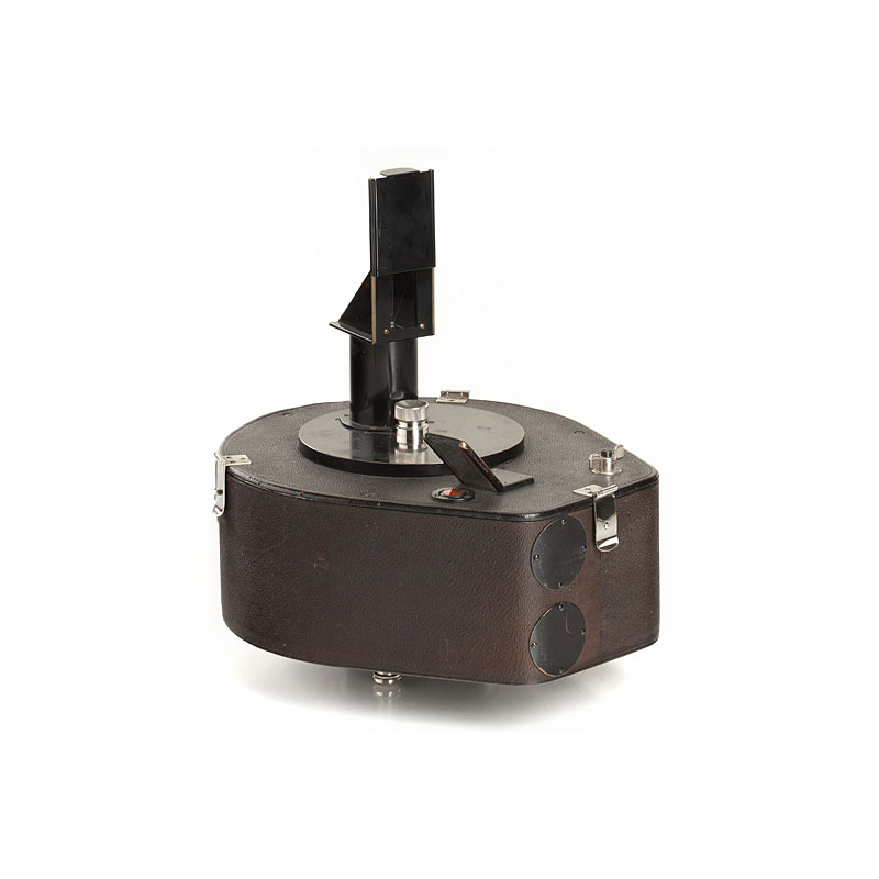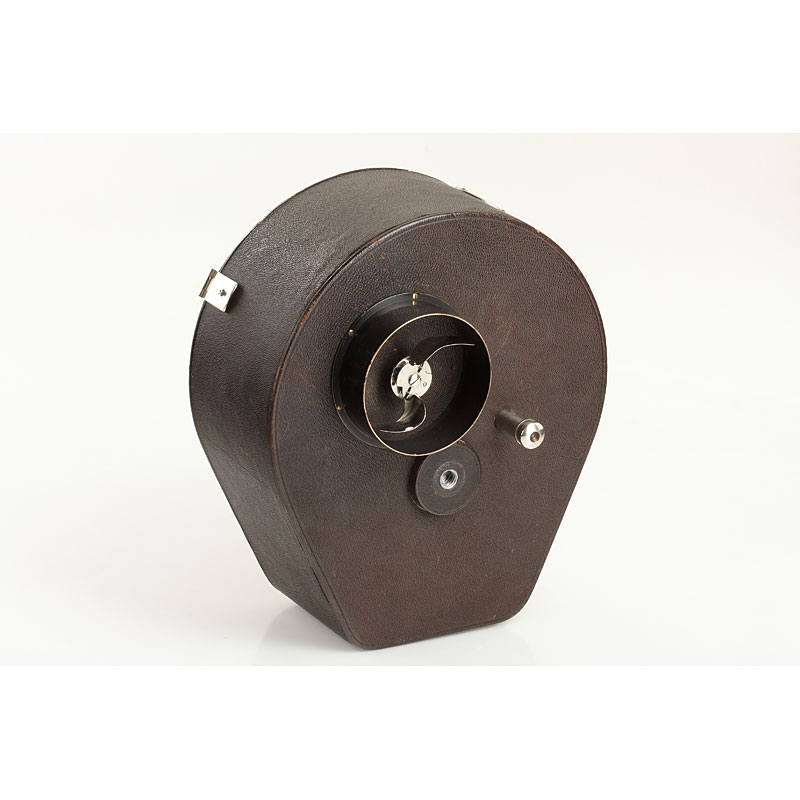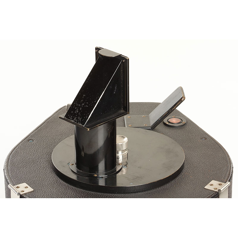 Unique portable panoramic camera for 359° images on rollfilm. The camera was built by Krauss, based on the patent of M. Achille-Victor-Emile DAUBRESSE. The patent was granted on October 29th, 1903. Extremely interesting design, employing two right-angle prisms with a lens between them. The optical axis of the lens is vertical. The ensemble acts as a combination of lens and periscope, projecting the image outward to the periphery of the film chamber. The central portion of the camera rotates manually to tension the spring, and the release button on the bottom of the camera starts the exposure (the photographer must sit below the camera to push the button, and also to stay out of the picture). Technically advanced camera, still in nearly new condition after more than 100 years. The camera design was only known from the patent from 1903 (included is a copy of the patent) and early literature until 1993 when it was dicovered by the prominent collector Adrien Meaght, mid of 1990s it was acquired by the McKeown collection. It is still the only known example with serial number 001. More than 50 years later, the Panorax camera from Japan employed the same principle in 1959.