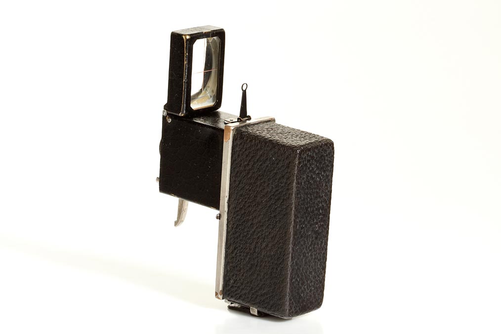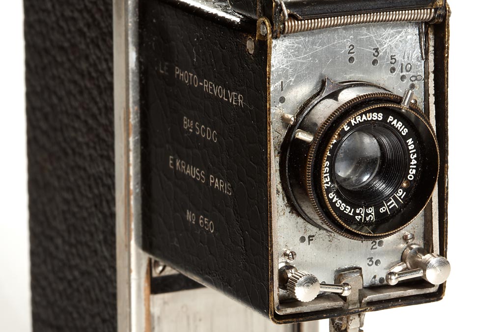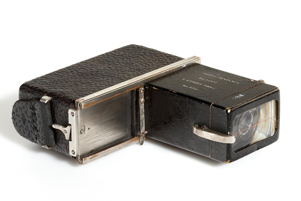 rare revolver shaped camera in completely original condition with magazine back for 48 exposures on plates 18x35mm, Krauss Tessar 4/40mm no.134150