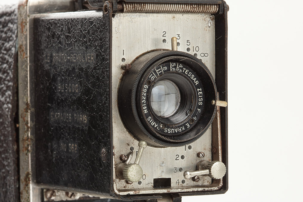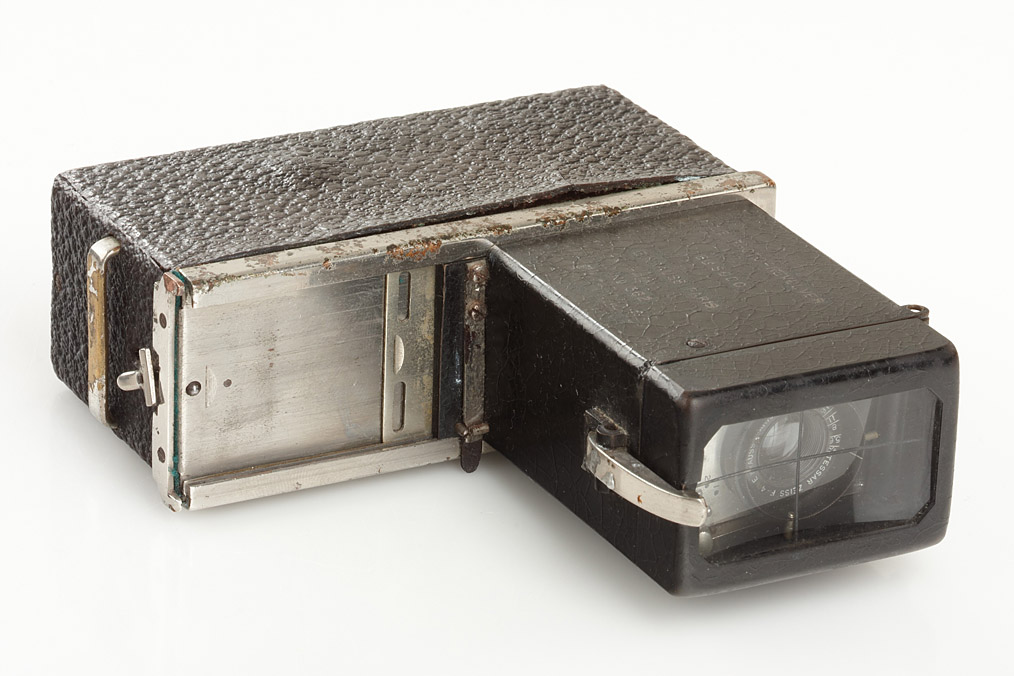 rare camera in completely original condition with magazine back for 48 exposures on plates 18x35mm, Krauss Tessar 4.5/40mm no.132269, with original leather case with strap