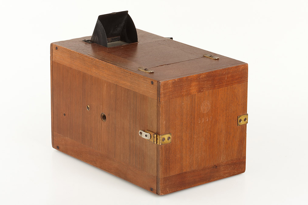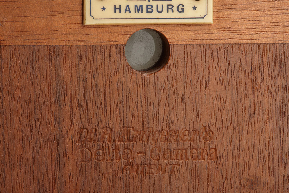 9x12cm detective camera, polished wood with magazine for 12 plates, stamped: Dr.R.Krügener's Delta-Camera Patent, dealers plaque: TIETGEN & Co. PHOTOGR.ARTIKEL HAMBURG