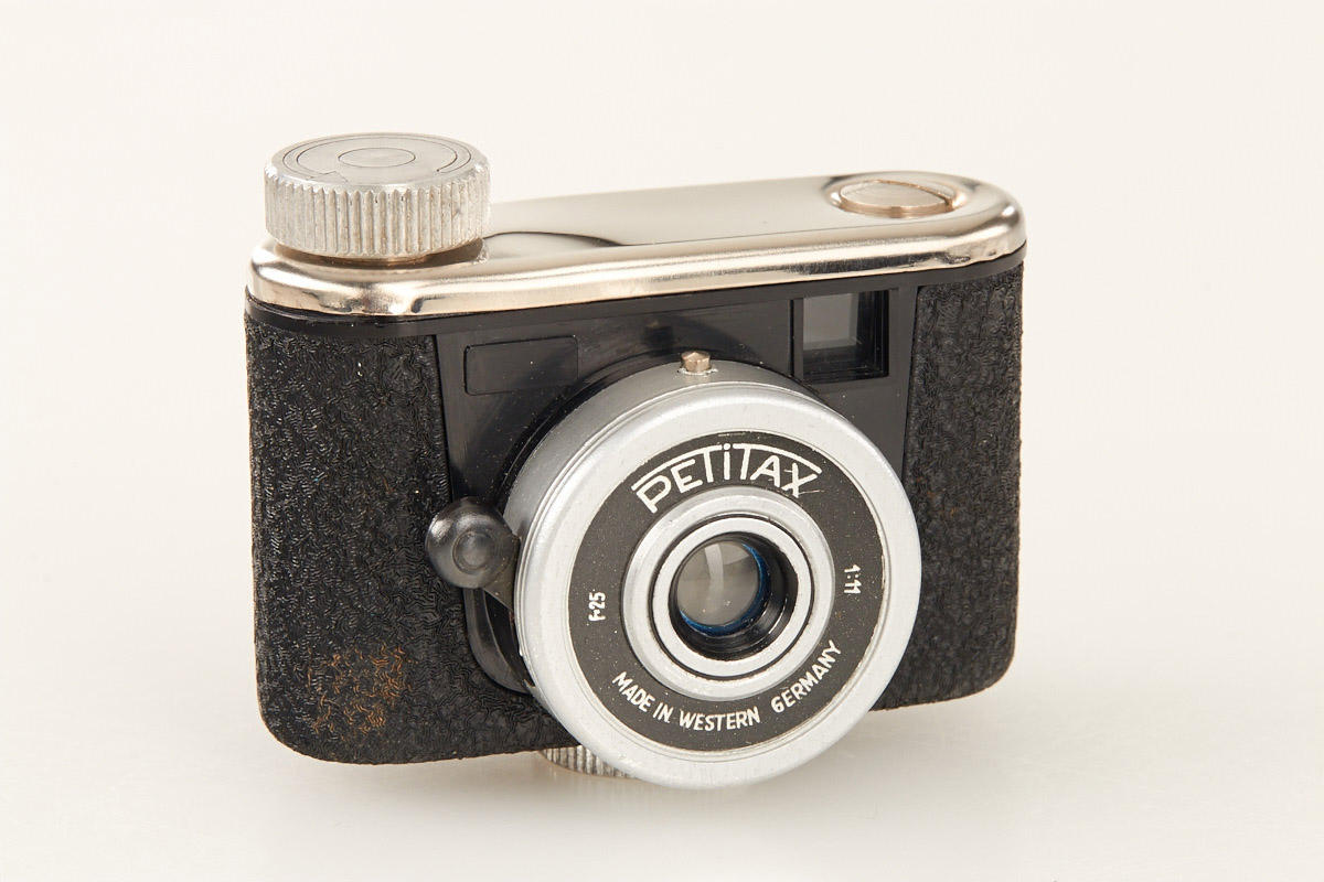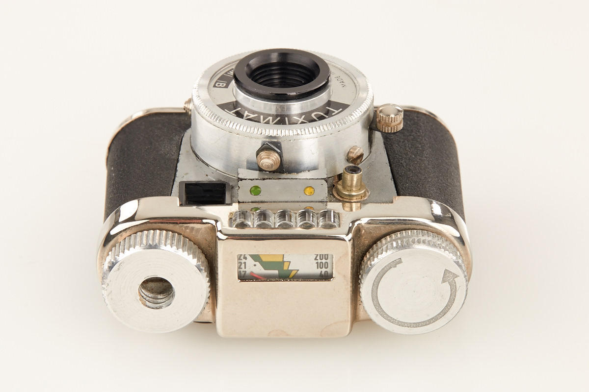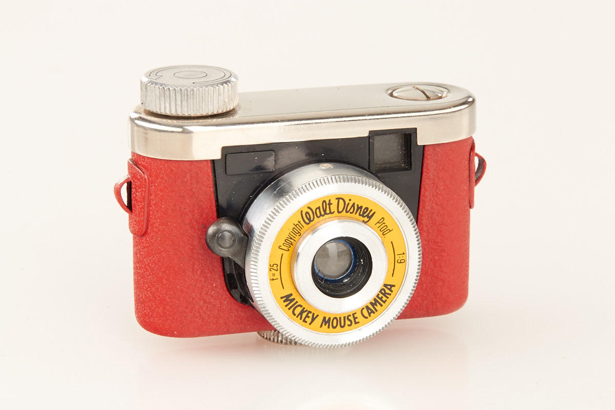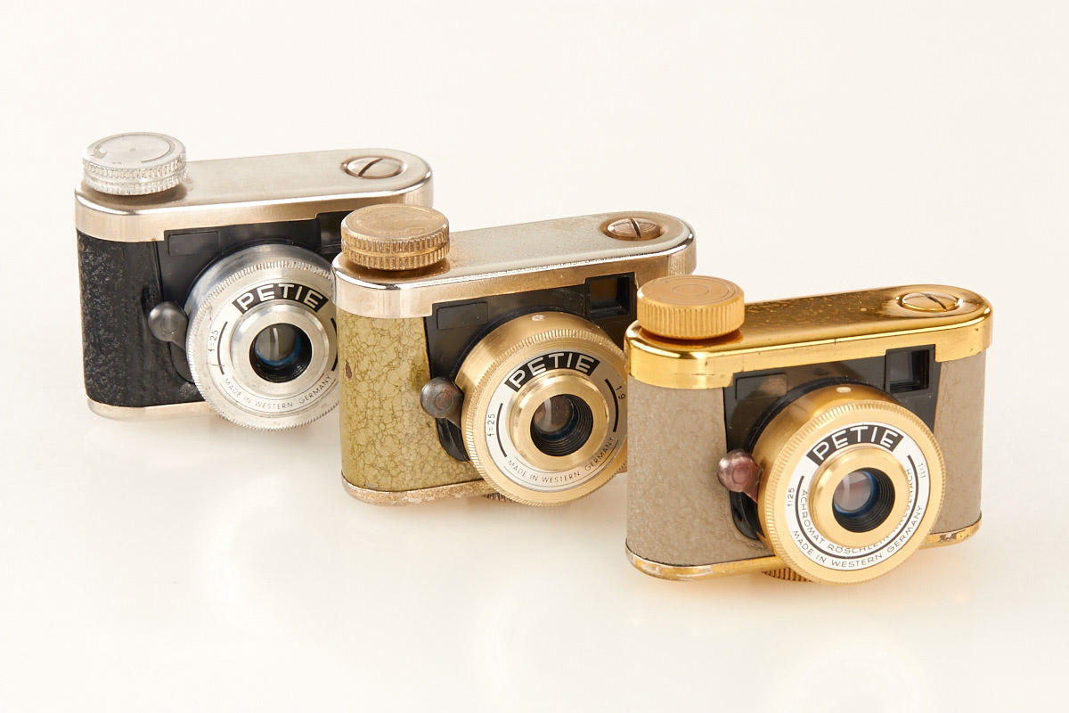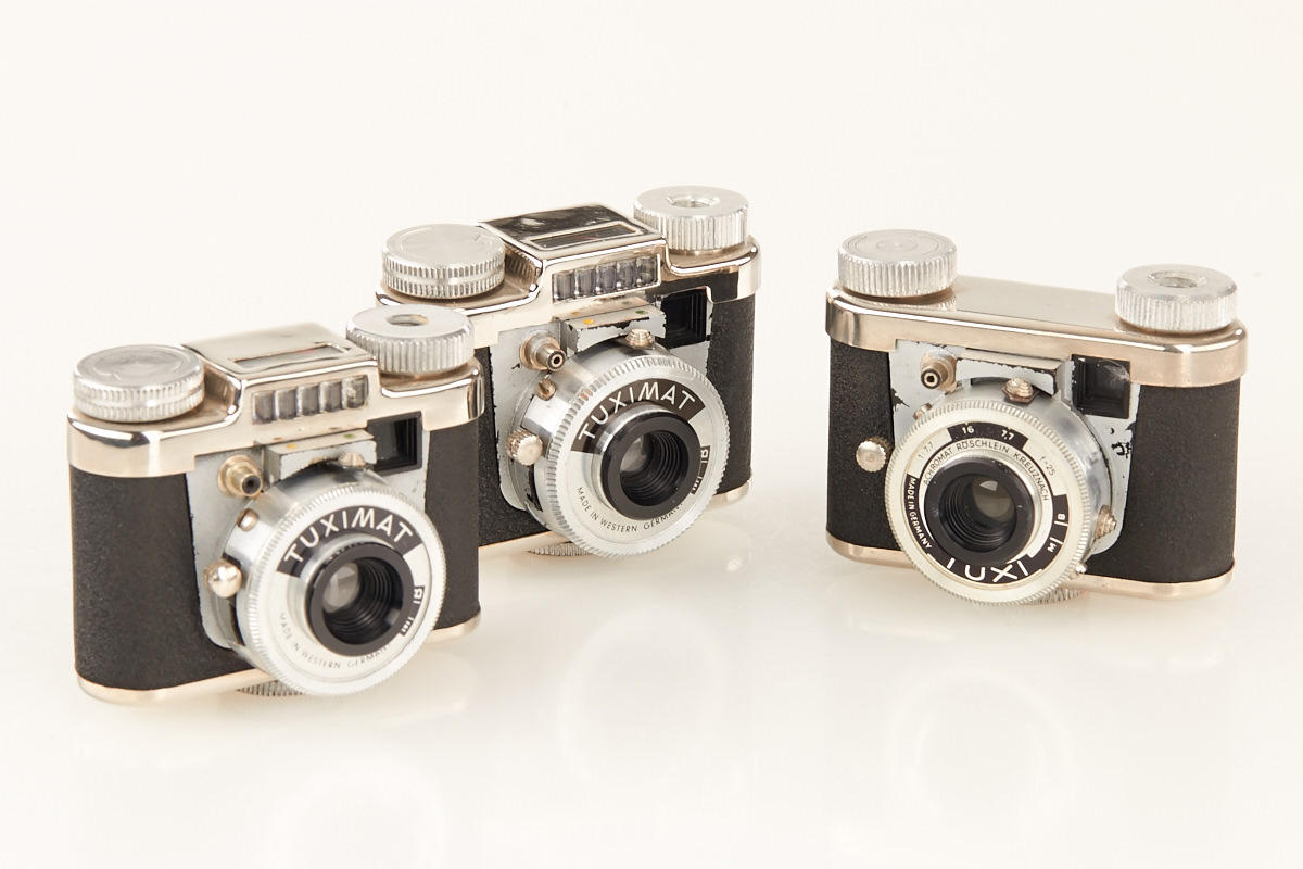 small collection of 8 different Kunik miniature cameras for 14x14mm exposures on 16mm film, incl. rare Mickey Mouse Camera, two Petie in gold finish, one Petie in black, two Tuximat, One Tuxi and one Petitax, all in good condition