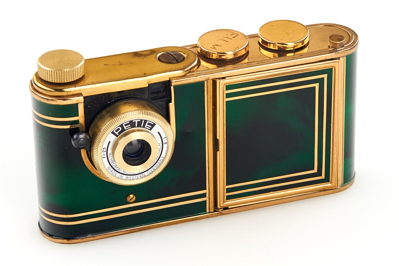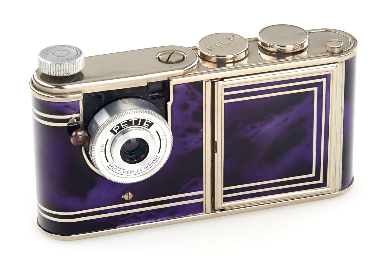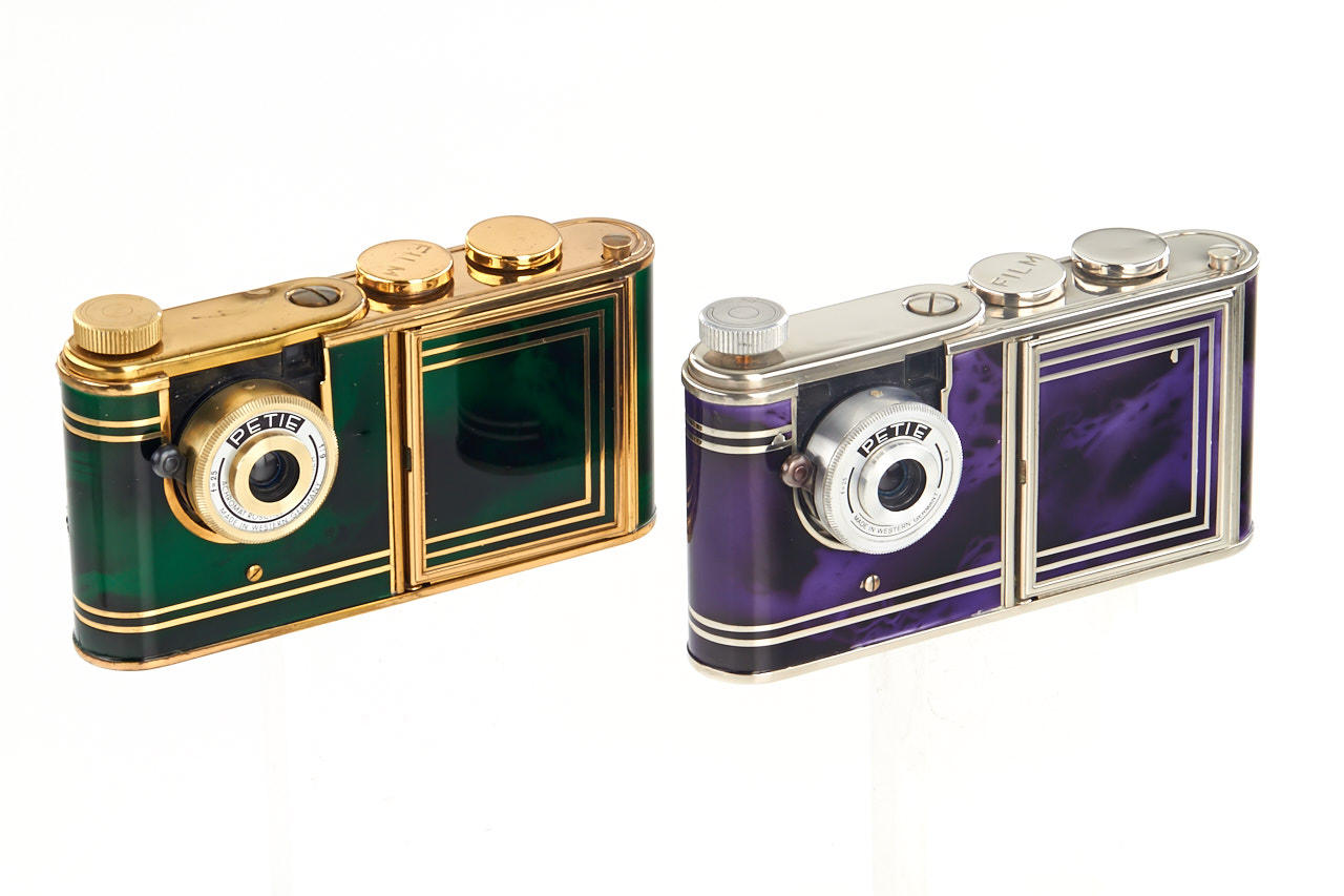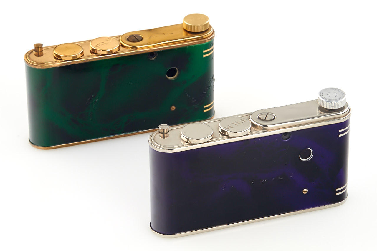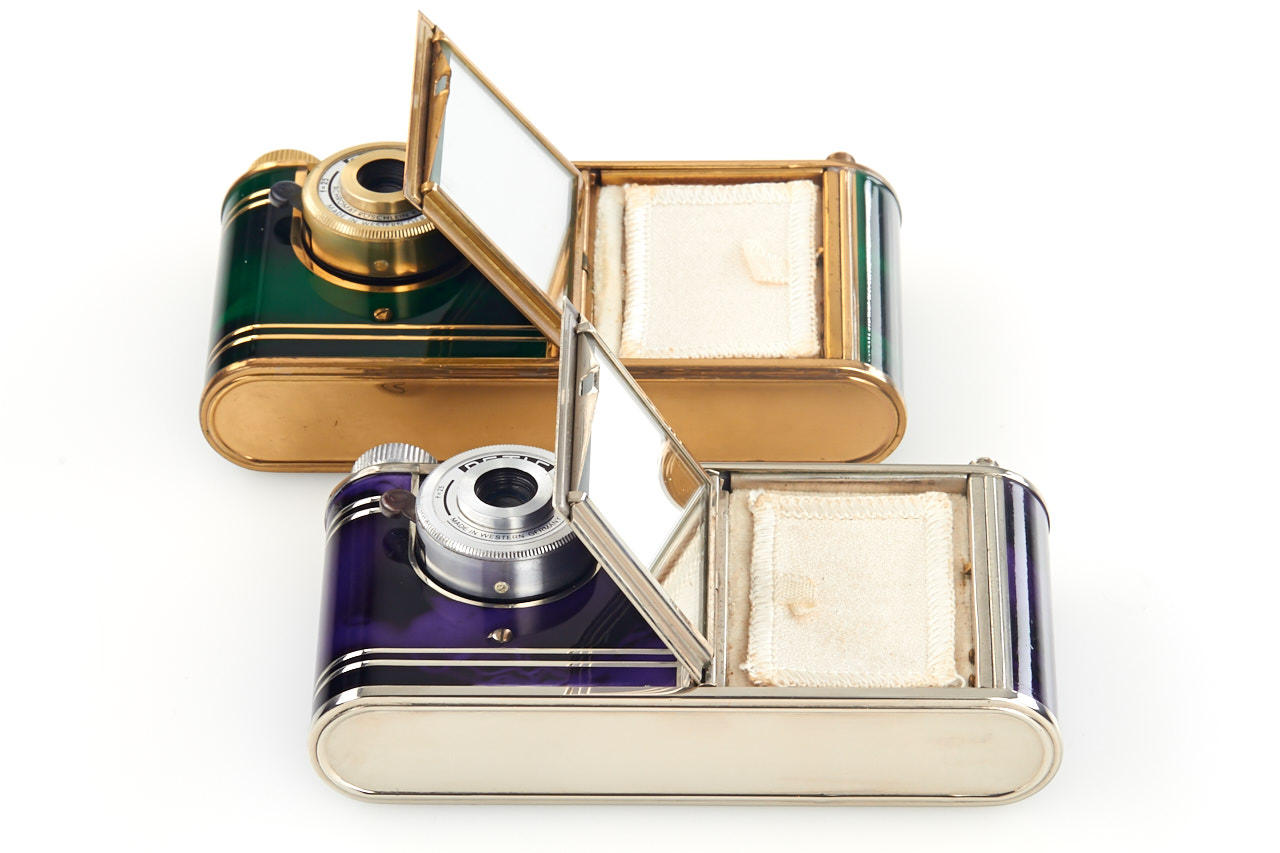 2 Petie camera housed in a make-up compact, front door opens to reveal mirror and powder, one of the top knobs provides a space for lipstick, the other one for a spare roll of film, both in beautiful condition one finished in green, the other in violet