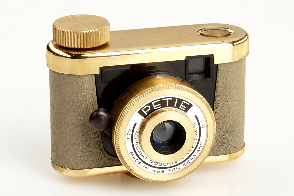 mint Petie Gold with grey body, Achromat Roeschlein Kreuznach 11/25, case, 3 unused films in maker's boxes, instructions