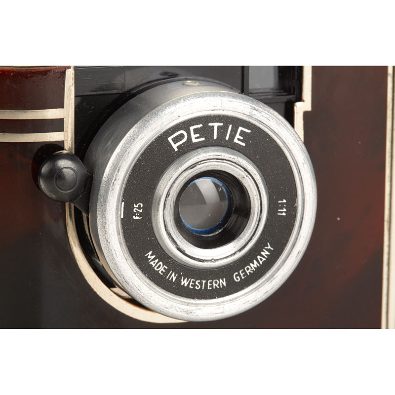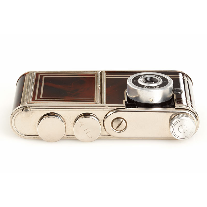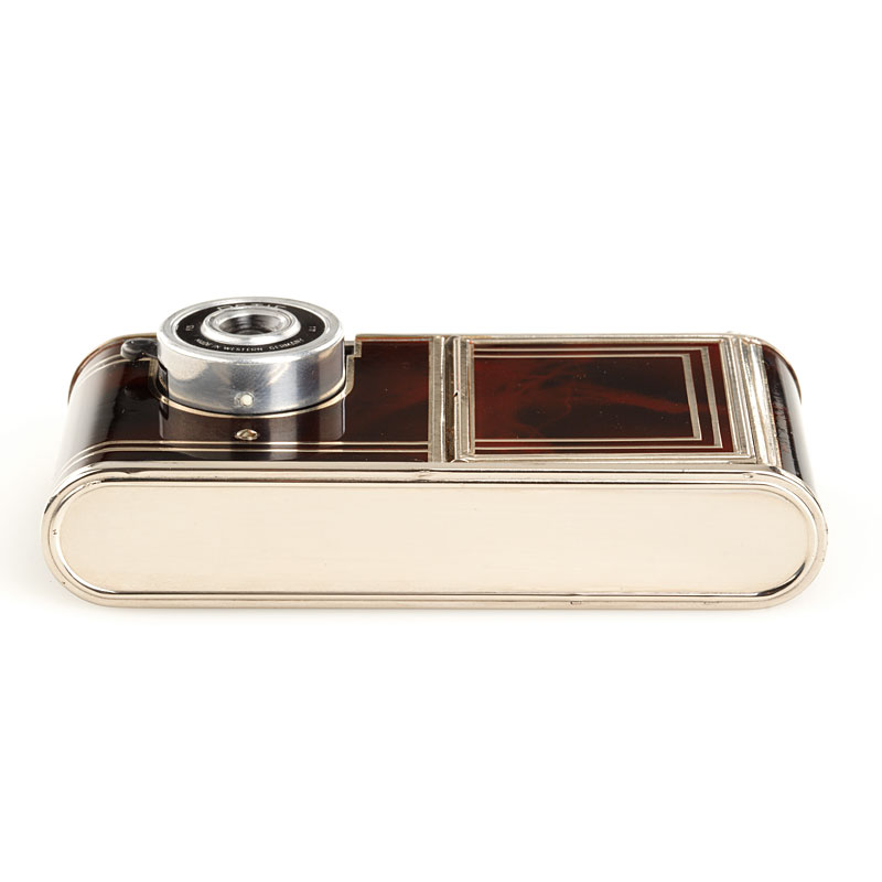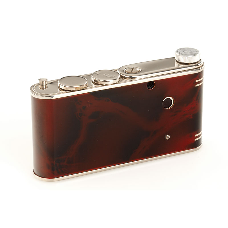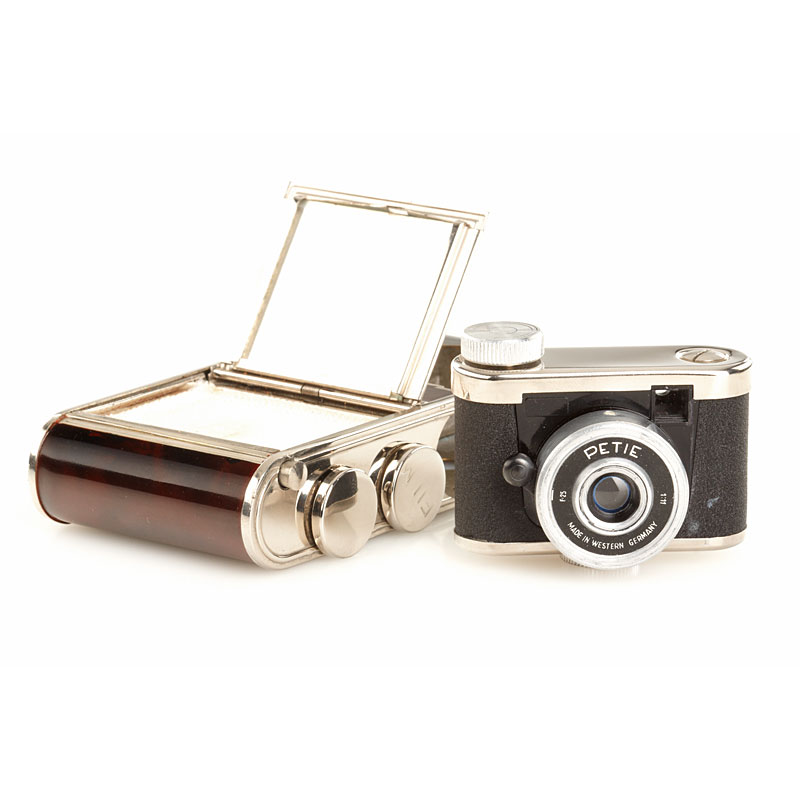 rare Petie camera for 16 exposures 14x14mm with Röschlein Kreuznach Achromat 9/25mm housed in a make-up compact with mirror, red-silver art-deco marbleised finish