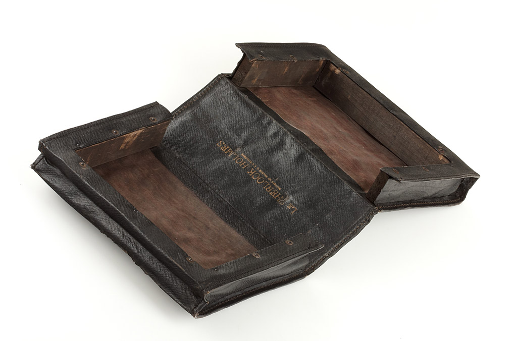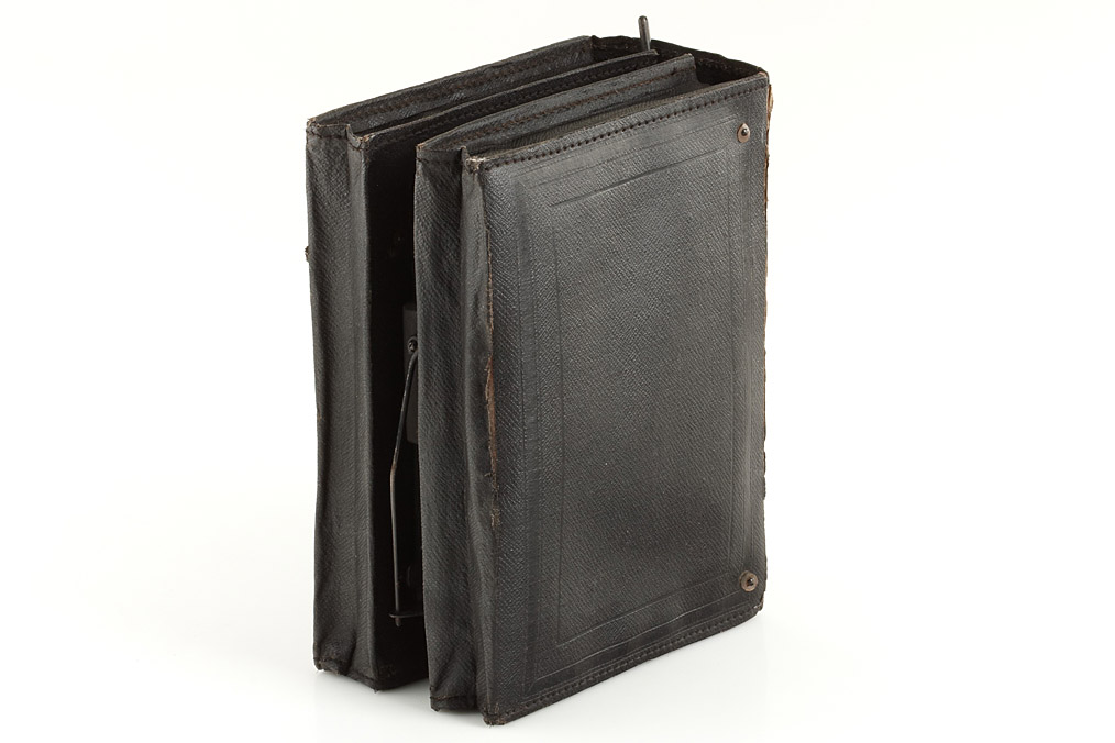 Edmund & Leon Bloch were specialists in disguised and hidden “detective” cameras. The best known of their cameras are the Physiographe cameras disguised as monocular and binoculars. Their Photo-Cravate is a classic, with the camera hidden behind a necktie. But the rarest of their designs is also the simplest. Le Sherlock Holmes is a magazine box camera disguised as a small briefcase. The camera can be operated with the briefcase held at your side. The shutter release is below the camera, totally out of sight, and a small lever at the rear advances the plates. Very rare. Only a handful of examples known worldwide, nearly all in museums. This one is in completely original condition with no restorations - ex collection Jim McKeown