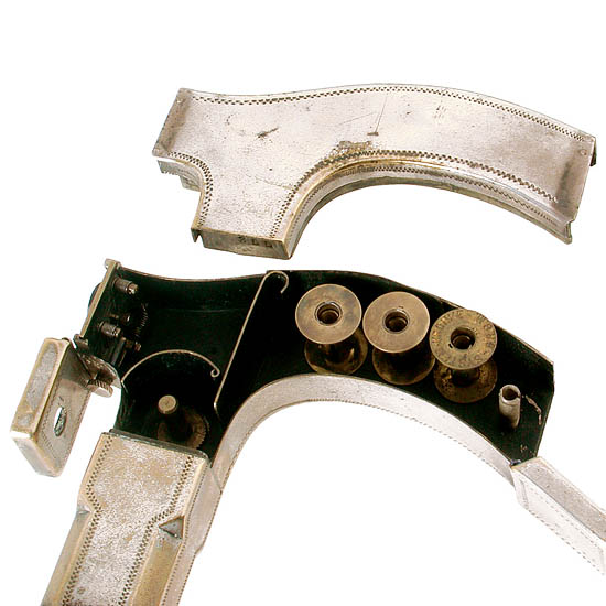 Walking stick camera, nickel plated brass body, with filmspools, original lens, replica cane. Emil Kronke patented his cane handle camera in Britain (1902), Germany (1903) and the United States (1904). It was manufactured by A. Lehmann of Berlin and marketed as the Ben Akiba walking stick camera. Literature: Eaton S. Lothrop (1973), A Century of Cameras p102