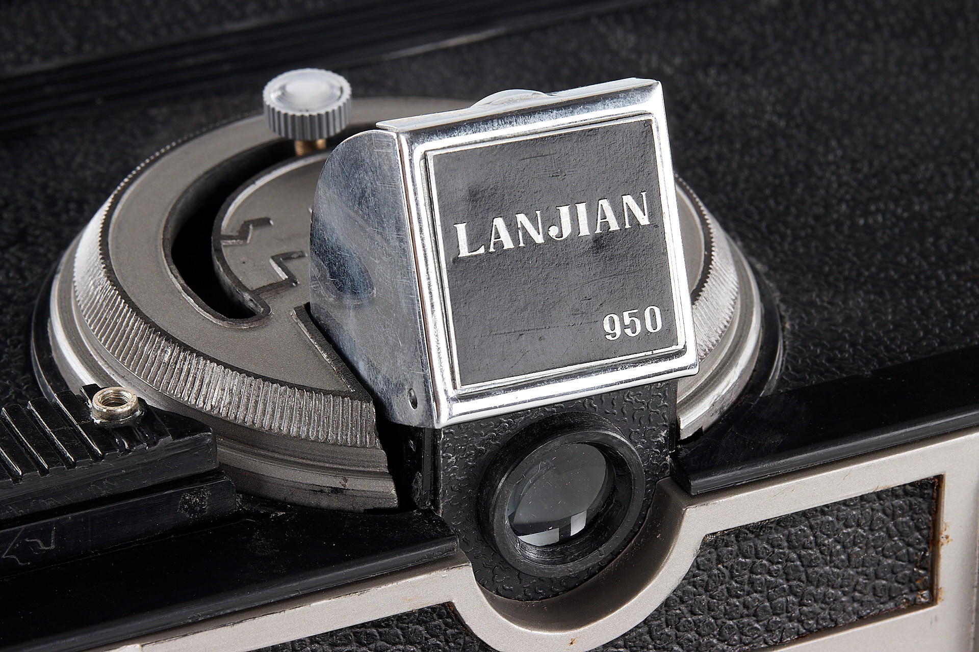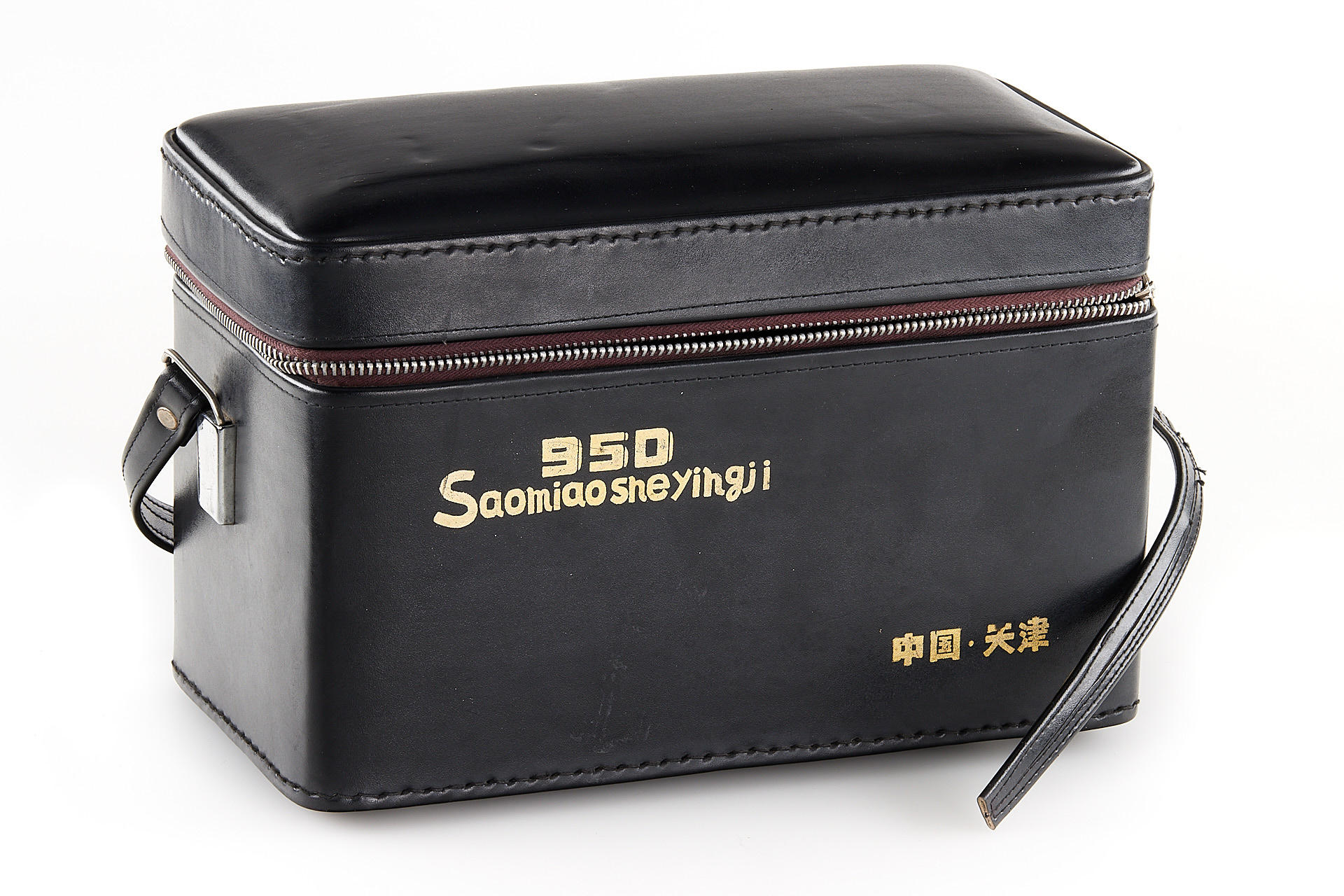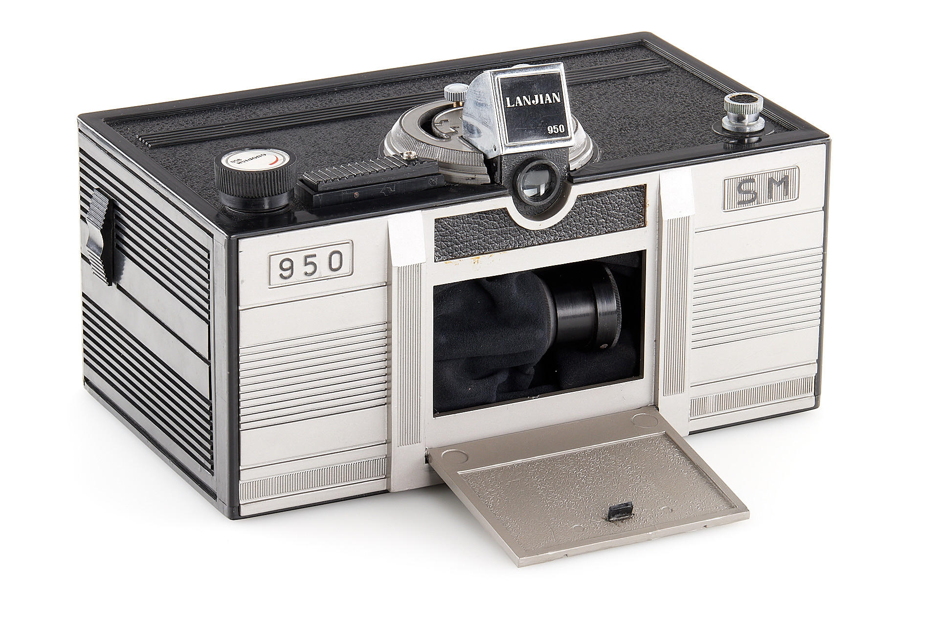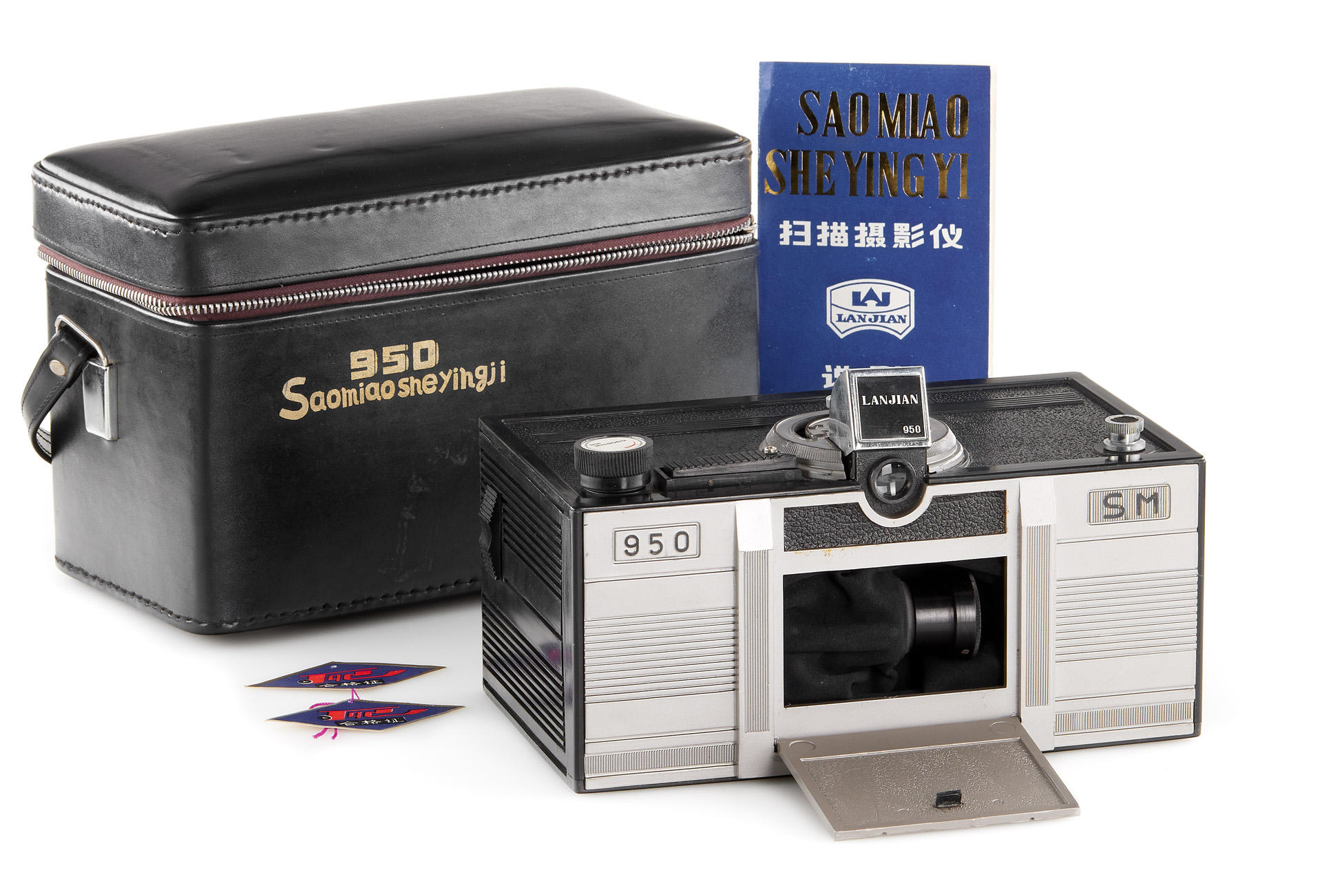 Extremely rare Chinese medium format panoramic camera, in mint condition and working order, working on similar principle as the Kodak-Panoram cameras, 140° swinging 135mm lens, for 950 Aerofilm format 90x160mm or 90x300mm, plastic body, front marked 'LANJIAN Soamiao She Yingyi 950 SM', 2-speed shutter (1/60, 1/125), winding knob marked 'GUOPIAN 950', with papers and rare original leather carrying case, very few of these cameras are known to exist