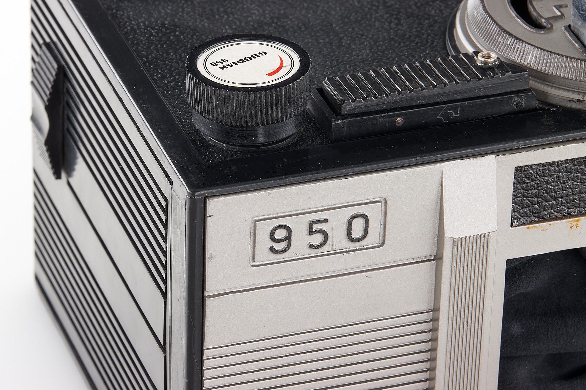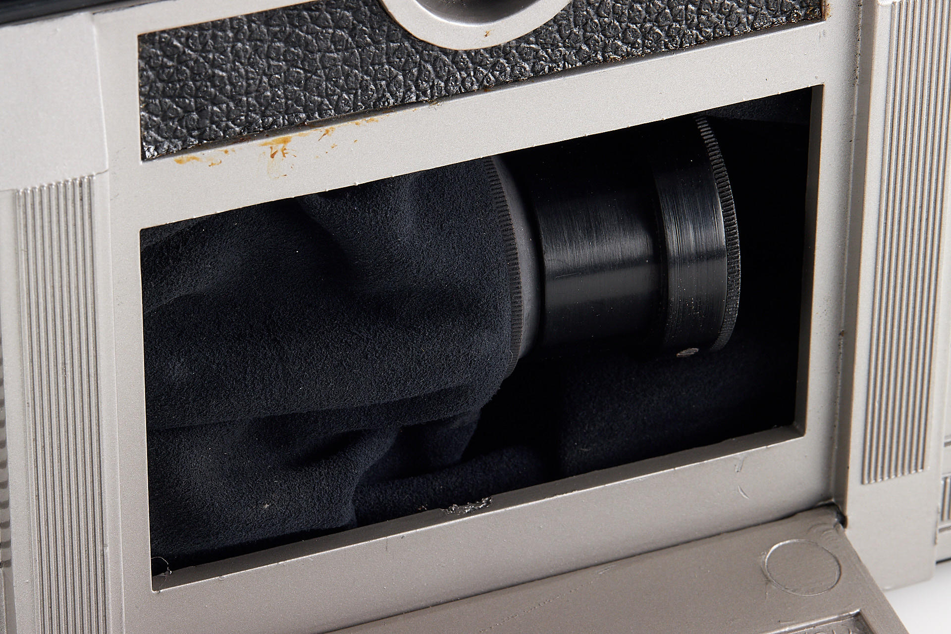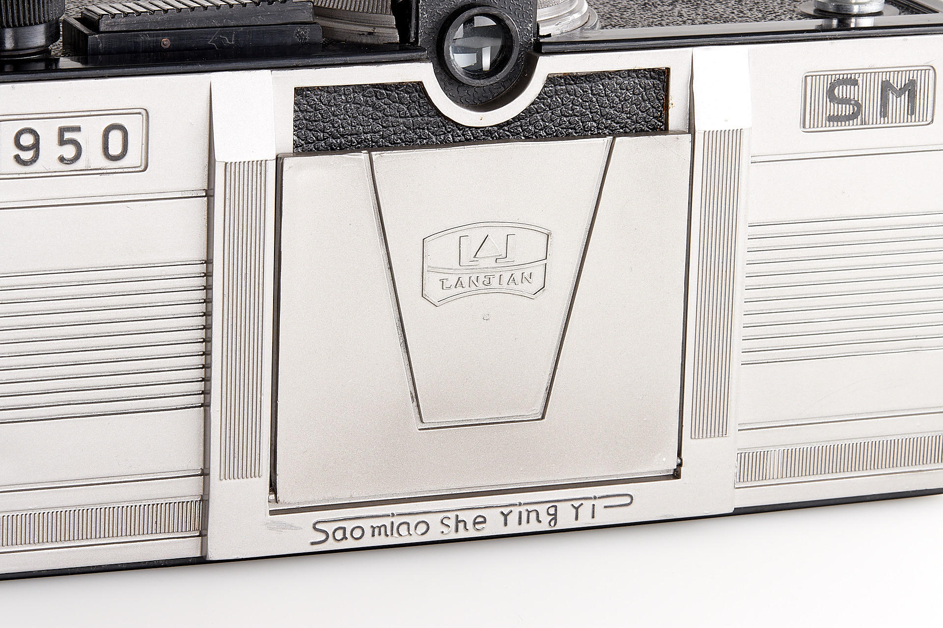 Extremely rare Chinese medium format panoramic camera, in mint condition and working order, working on similar principle as the Kodak-Panoram cameras, 140° swinging 135mm lens, for 950 Aerofilm format 90x160mm or 90x300mm, plastic body, front marked 'LANJIAN Soamiao She Yingyi 950 SM', 2-speed shutter (1/60, 1/125), winding knob marked 'GUOPIAN 950', with papers and rare original leather carrying case, very few of these cameras are known to exist