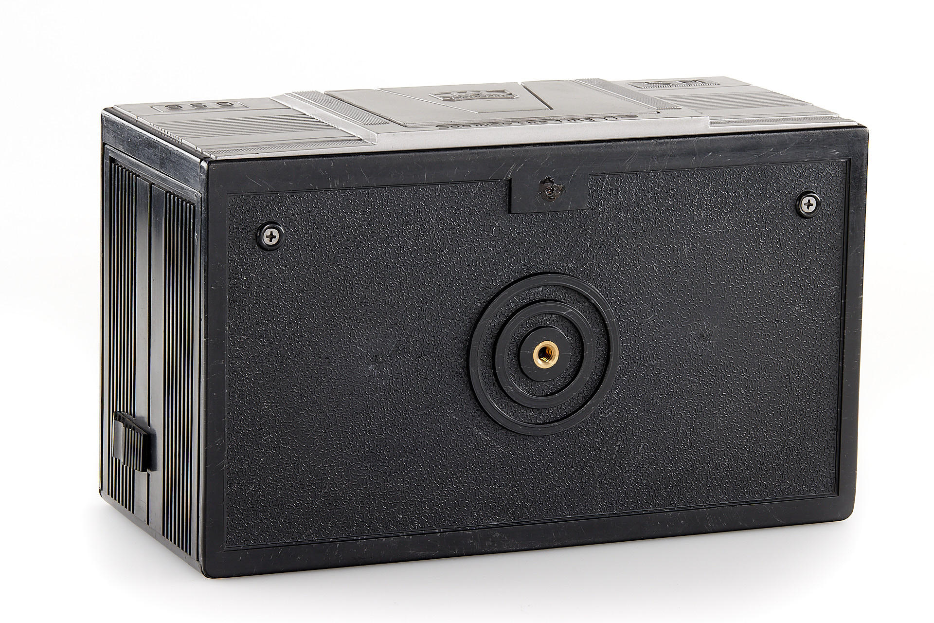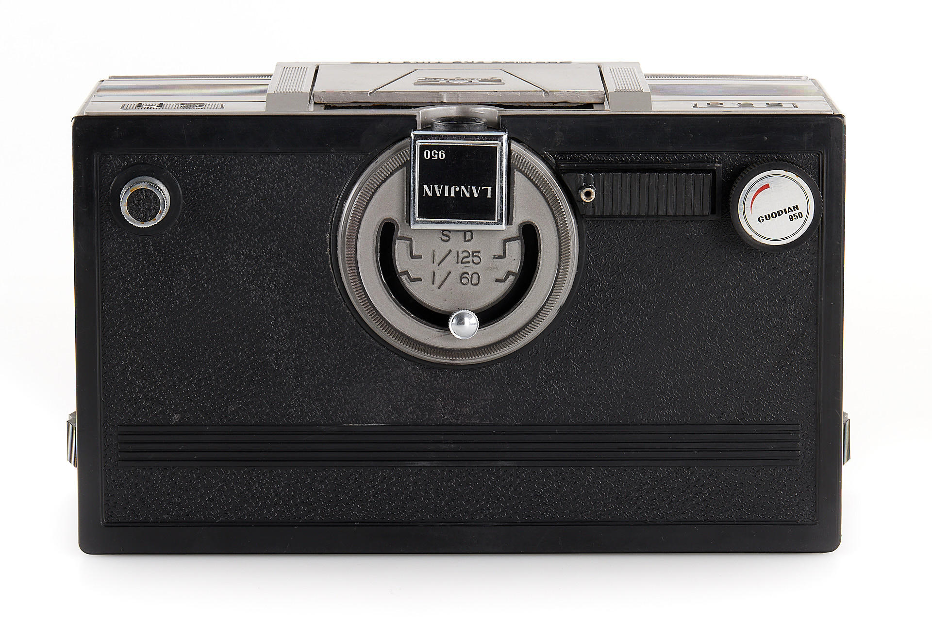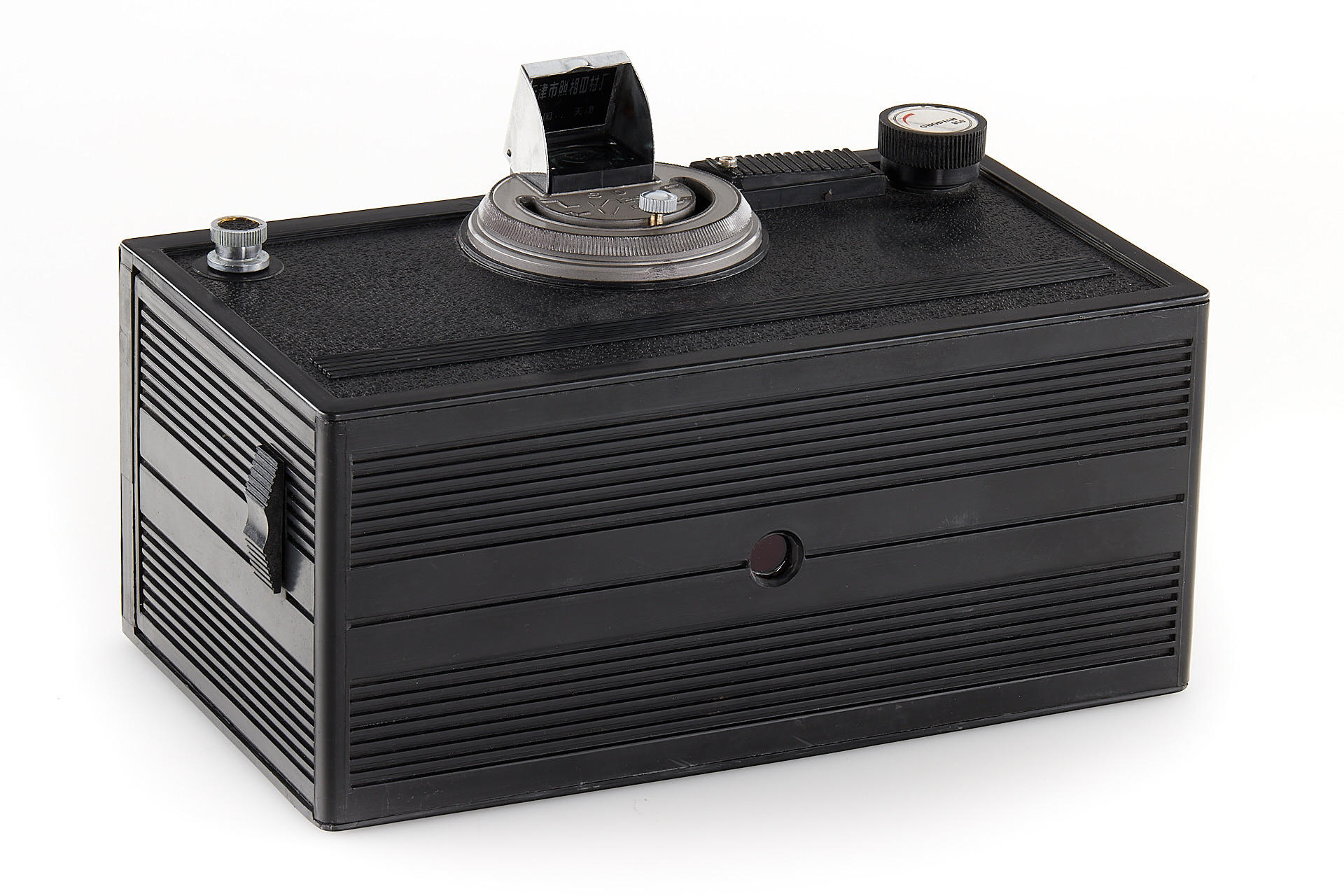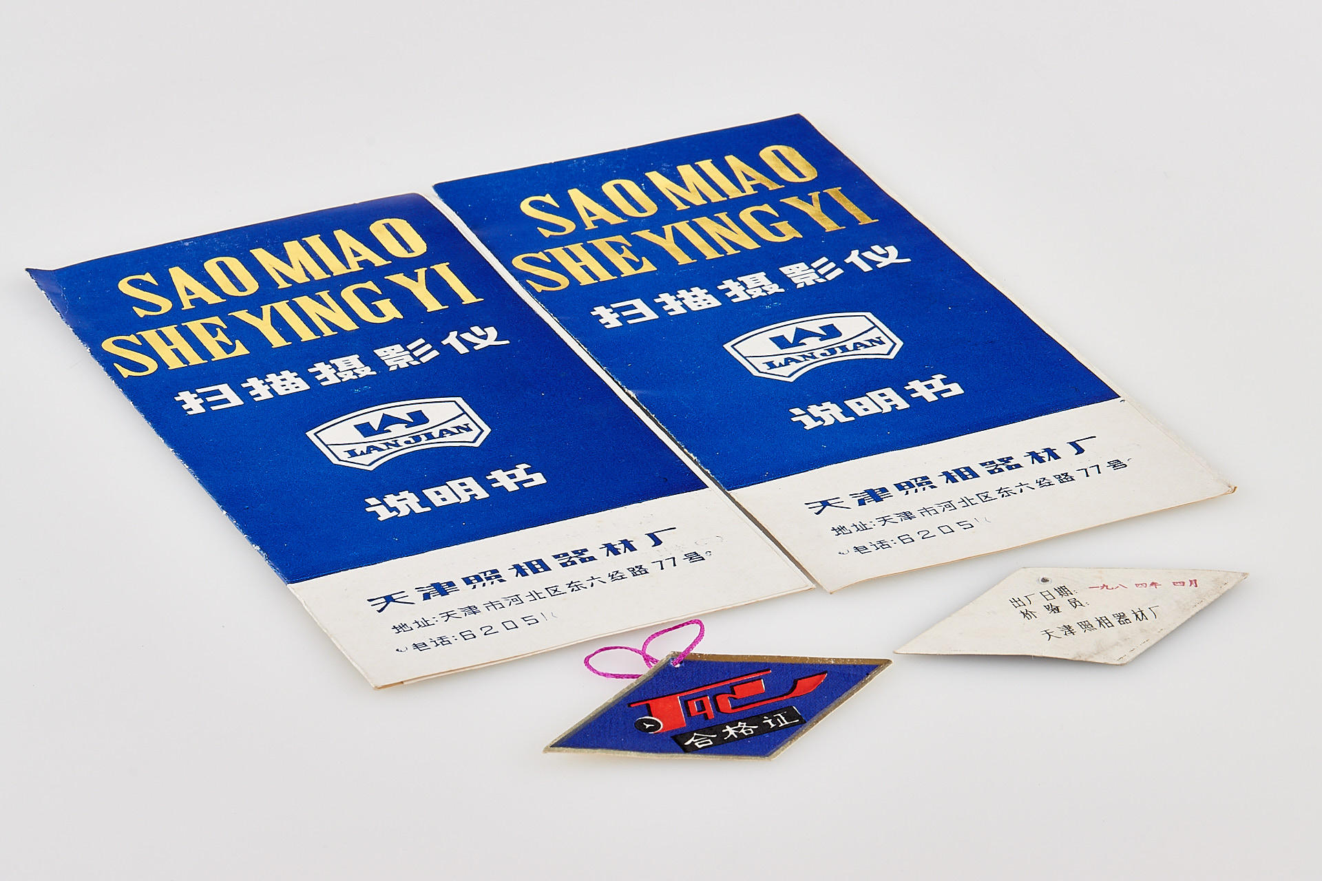 Extremely rare Chinese medium format panoramic camera, in mint condition and working order, working on similar principle as the Kodak-Panoram cameras, 140° swinging 135mm lens, for 950 Aerofilm format 90x160mm or 90x300mm, plastic body, front marked 'LANJIAN Soamiao She Yingyi 950 SM', 2-speed shutter (1/60, 1/125), winding knob marked 'GUOPIAN 950', with papers and rare original leather carrying case, very few of these cameras are known to exist