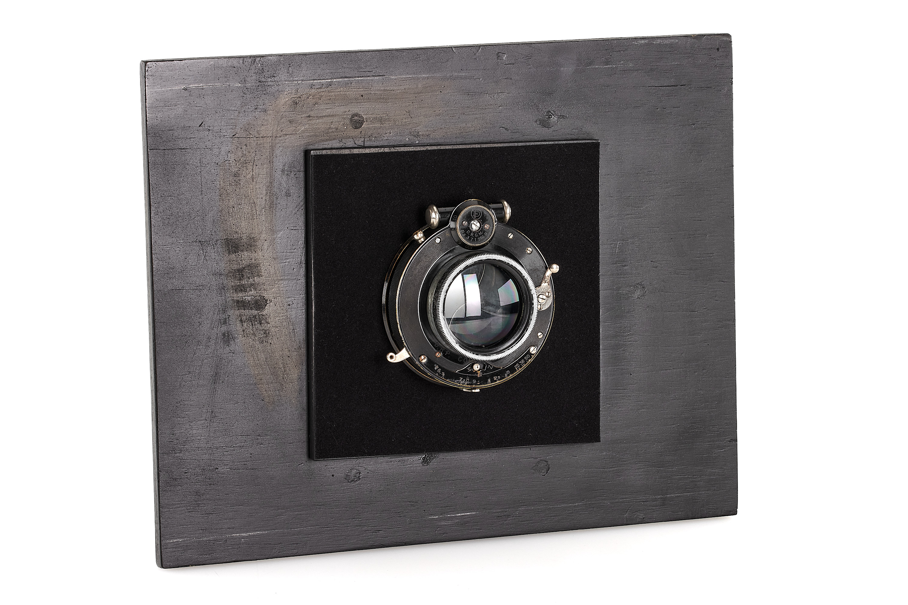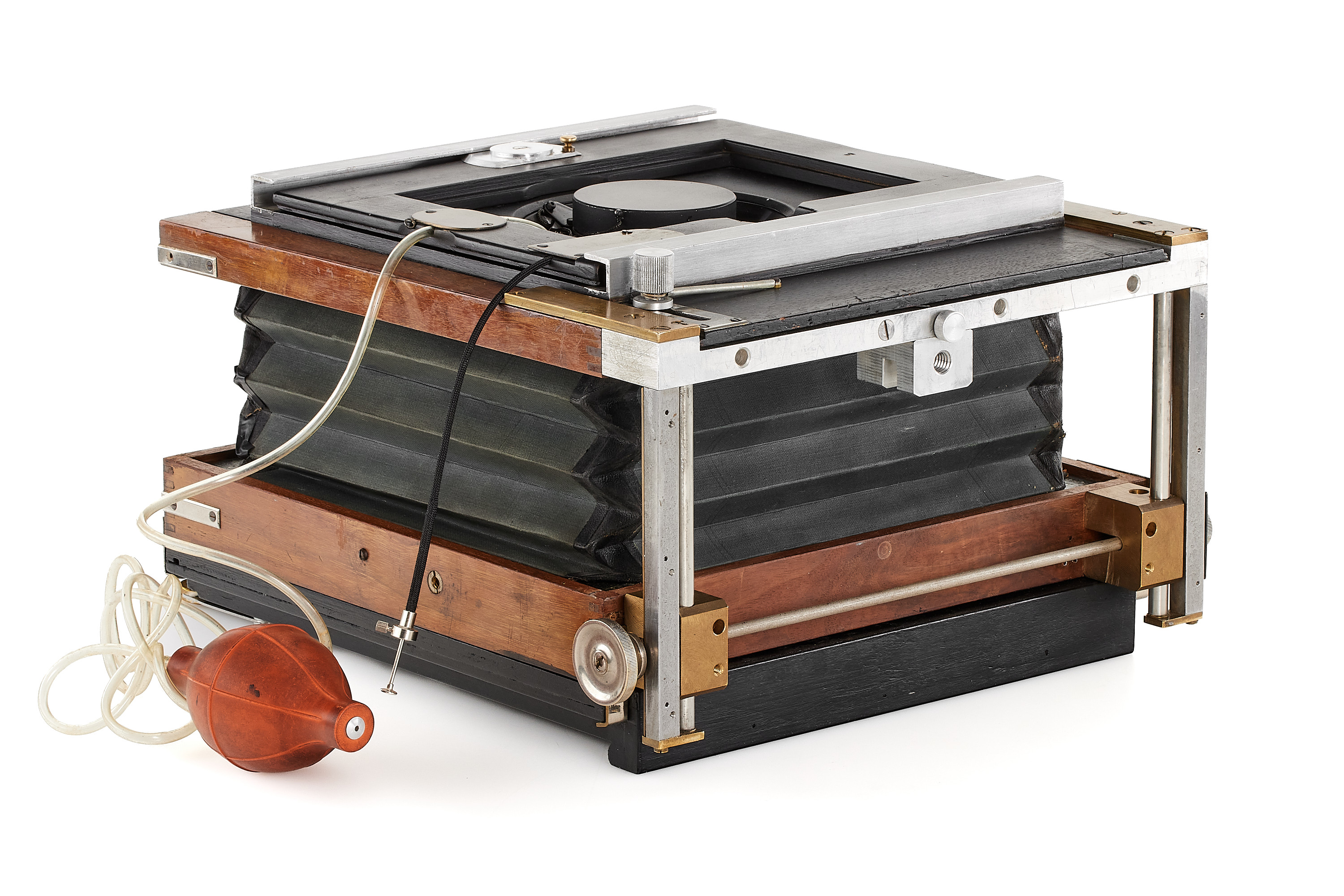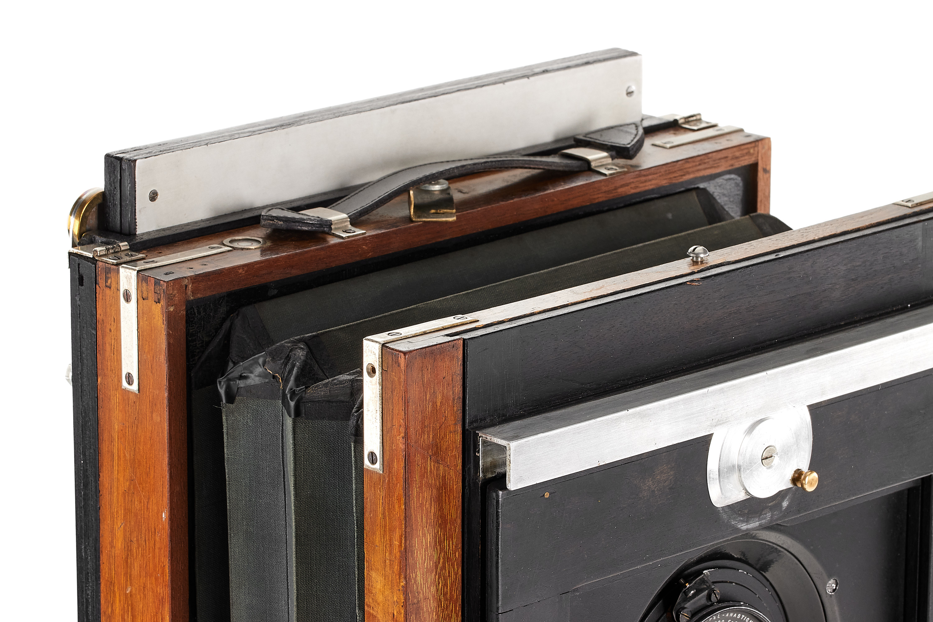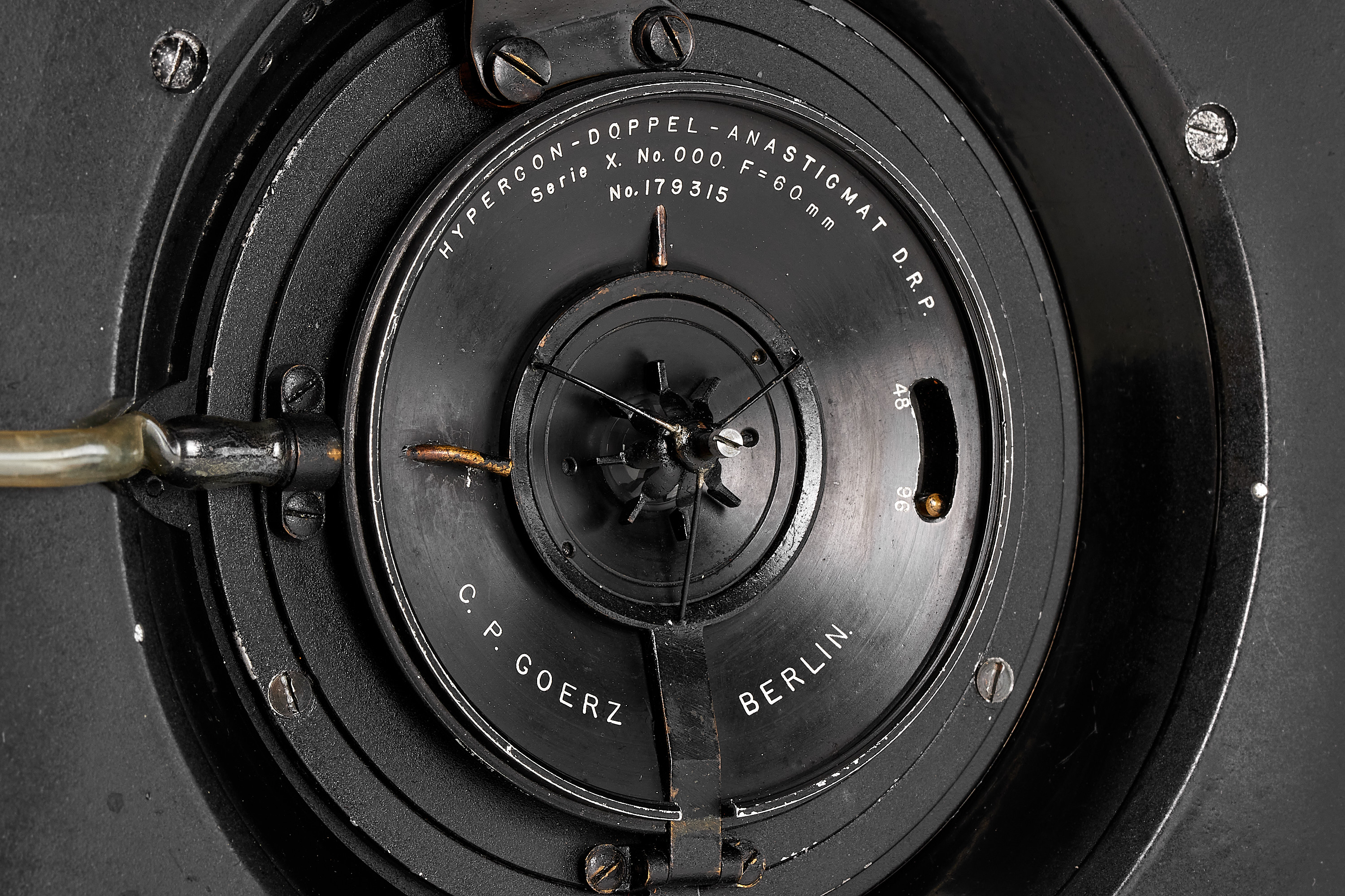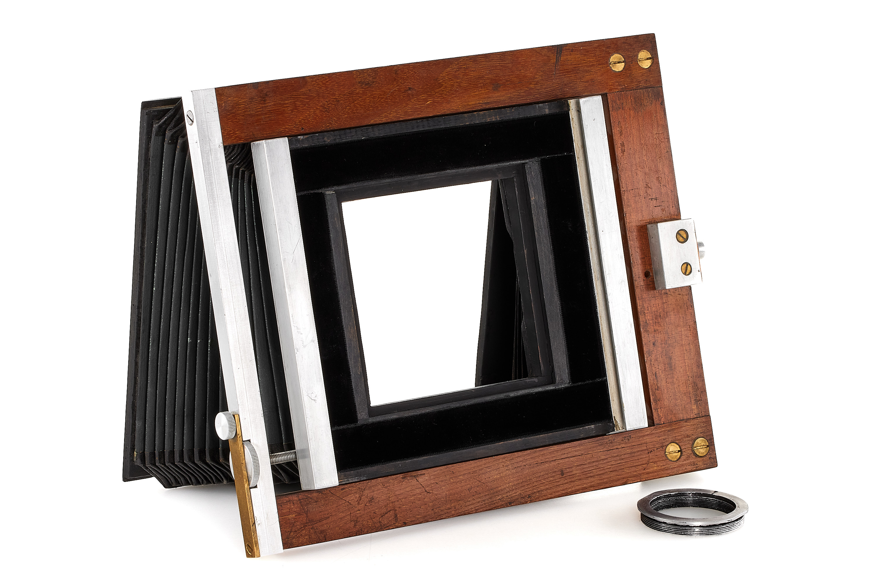 Very well made 18x24cm unbranded vintage camera specially adapted (in ca. 1990-2000) for use of the Goerz Hyperon-Doppel-Anastigmat Serie X No.000 n0.179315 (ca.1900), famous early ultra-wide angle lens with rotating 'star' in the middle to allow an even exposure across the frame, here in the very rare 60mm version, in very good original condition and working order, mounted on wooden lens board (with pump, lens cap and shutter), together with Meyer Doppel-Anastigmat No.3 5.5/210mm no.159535 from ca. 1920, mounted in Compound shutter (optics showing significant cleaning marks), with additional focussing bellows and focussing screen.