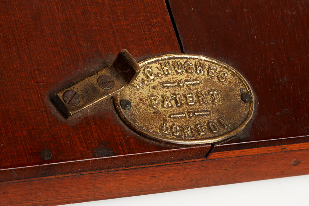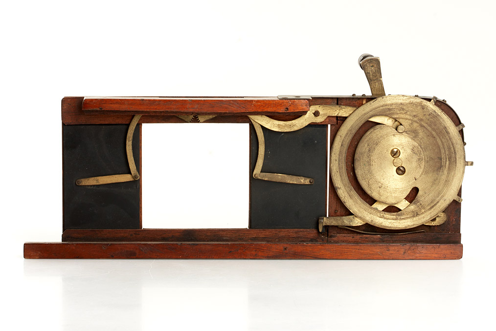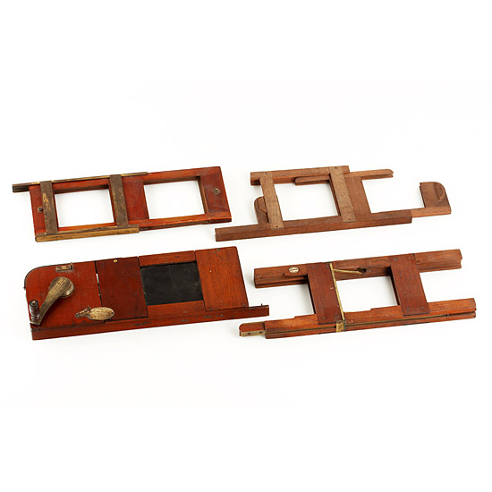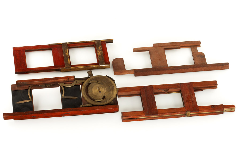 four slide stages for a professional Laterna magica (1) lever operated shutter patented by W.C. Huges of London, ingenious brass made mechanism to cross fade two slides, (2) interesting mechanism to automatically change 85x85mm glass slides, made by R.R. Beard of Bedfordshire, (3,4) two unlabeled slide stages, one with brass fittings, the other one entirely made of wood. All items are in very good and working condition – a great opportunity to complete a Laterna magica collection!
