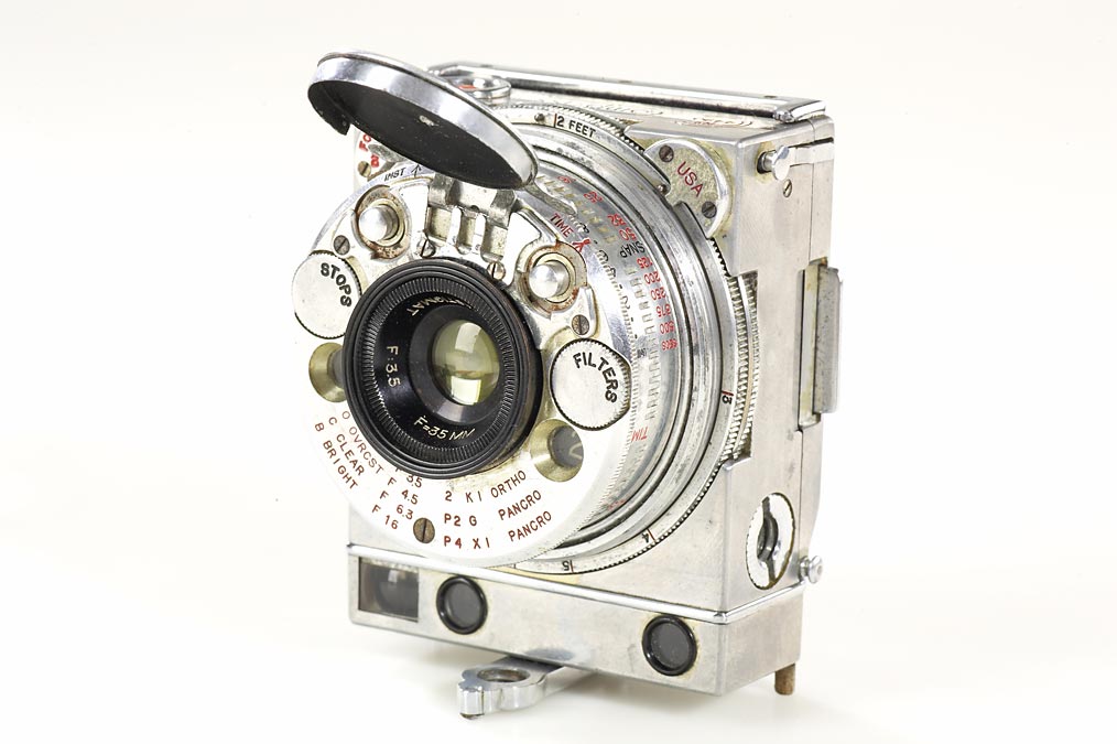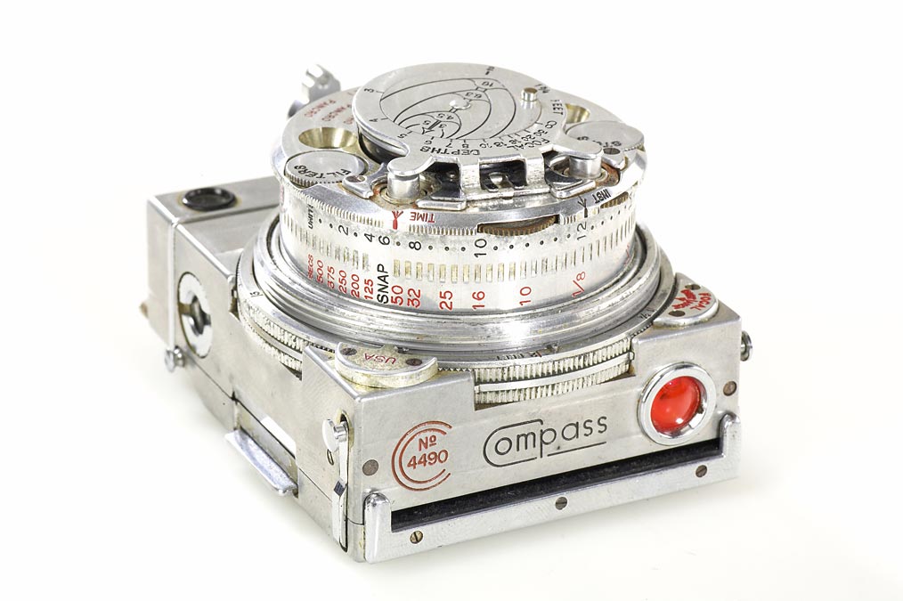 very rare Compass set (English version) in good working order, with ground-glass back, Le Coultre rollfilm adapter, 5 film spools, instructions, very rare original brown maker's box