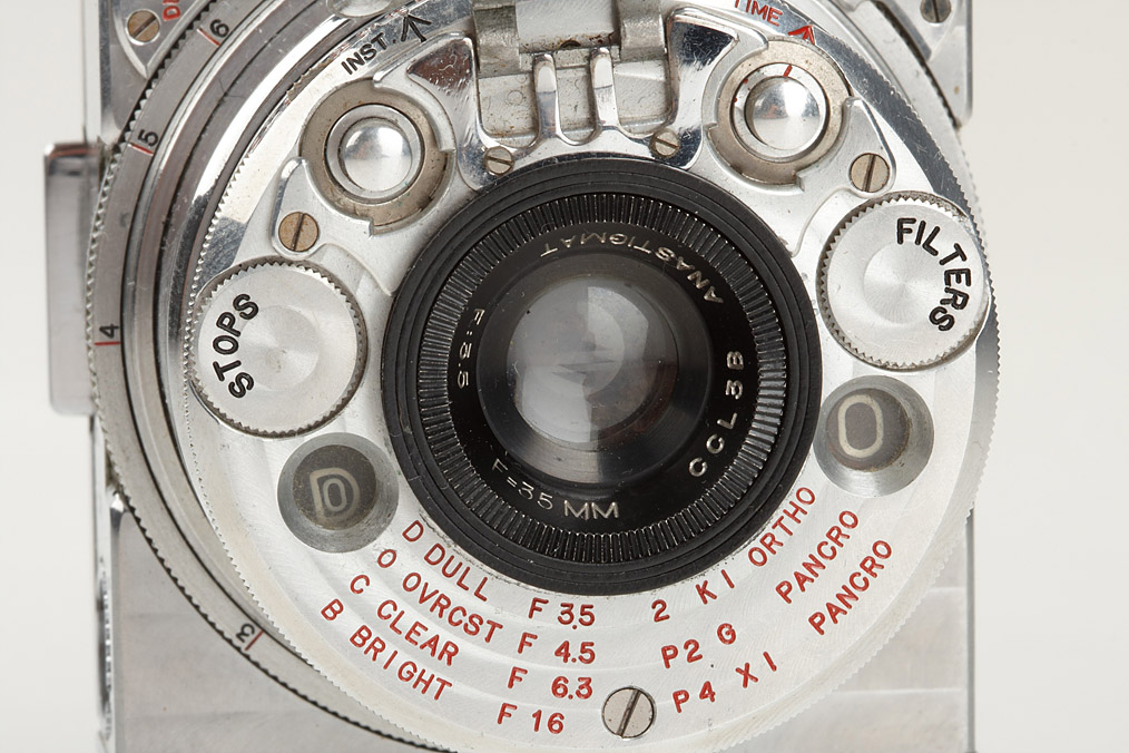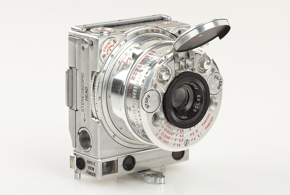 beautiful Compass outfit (English version) in good working order with ground-glass back, in blue maker's box, Le Coultre rollfilm back, 2 film spools, 4 original rollfilms, very rare original tripod in blue maker's box, extremely rare cable release adaptor, rare large brochure and instruction book