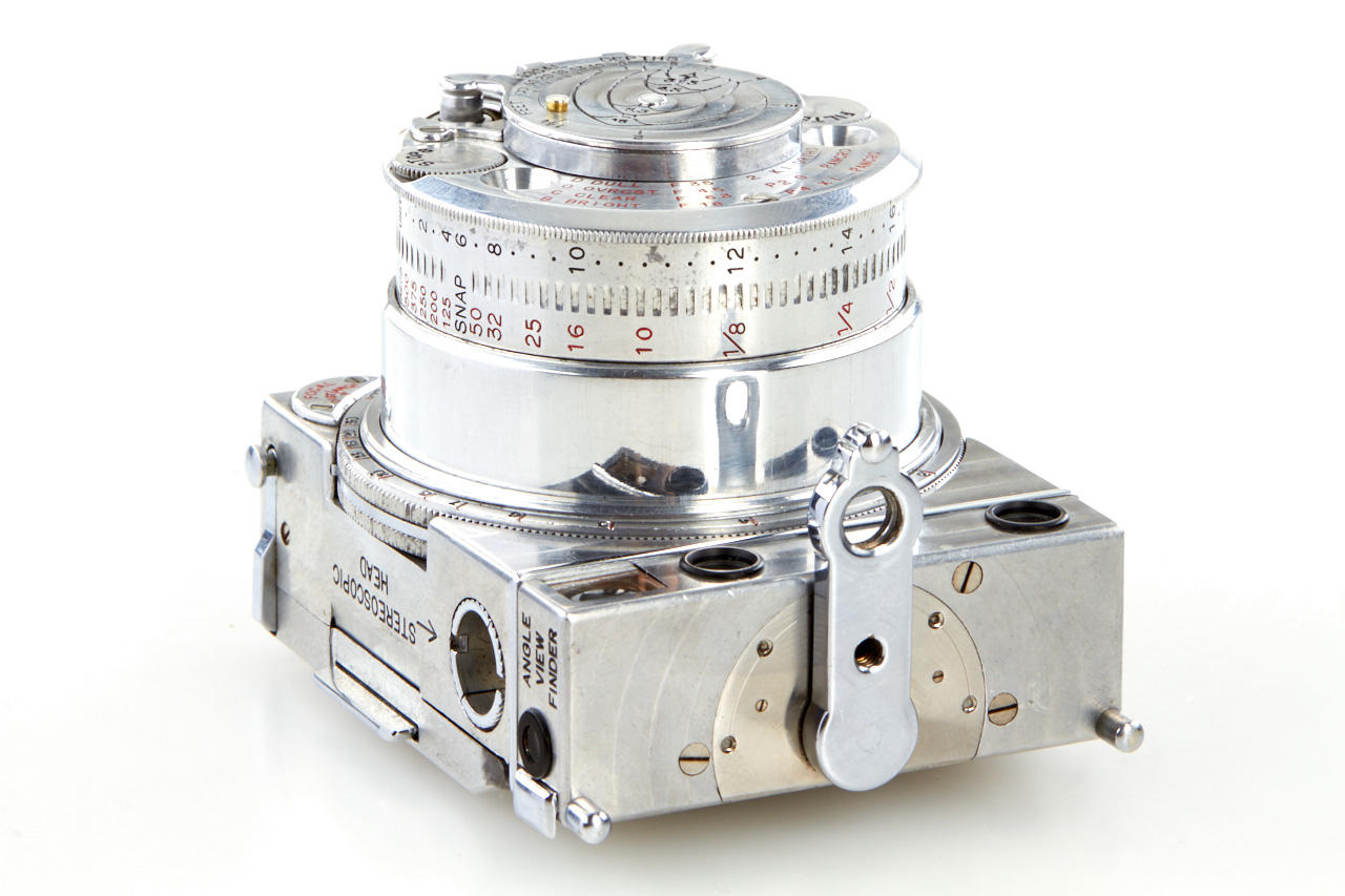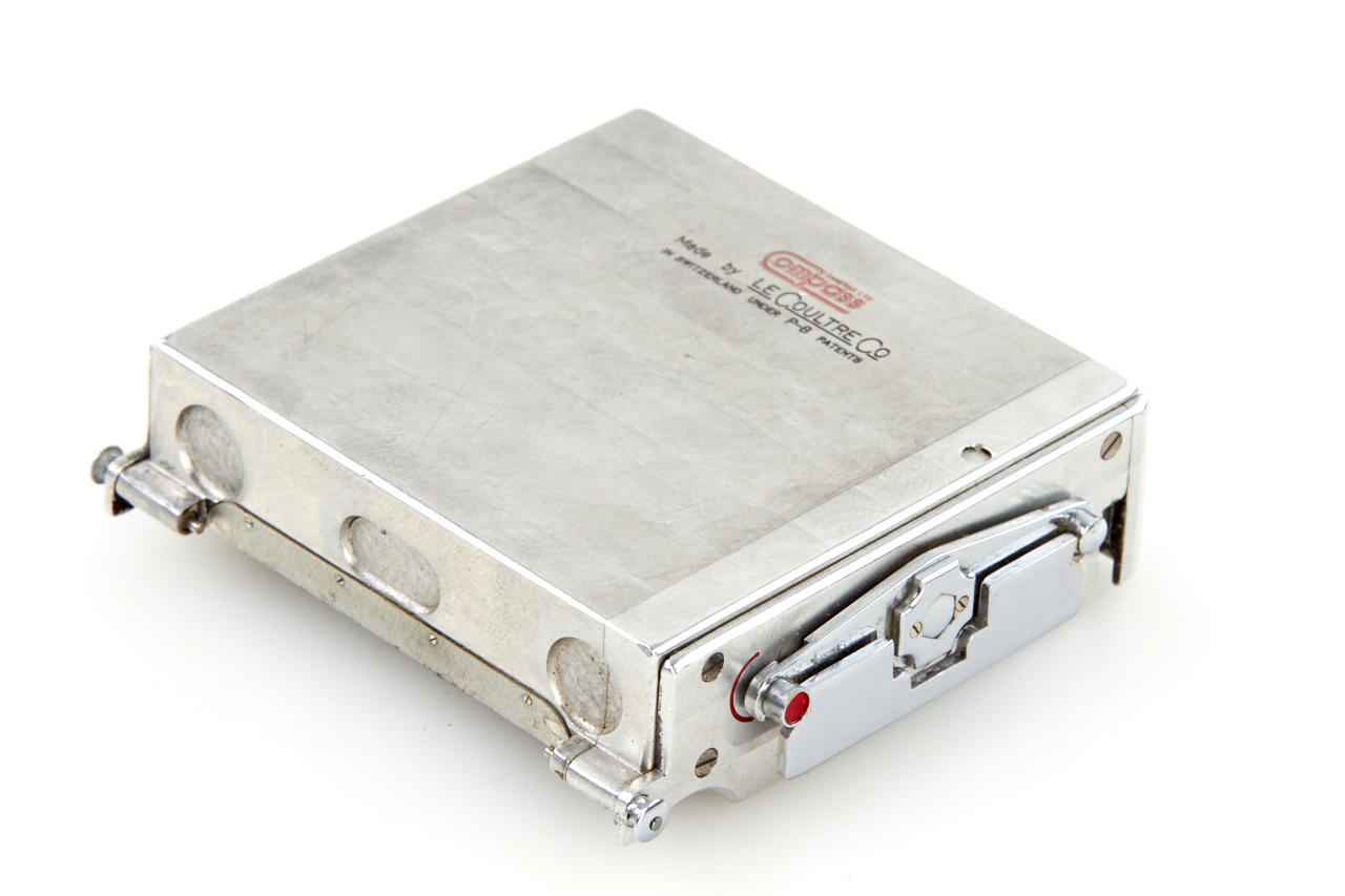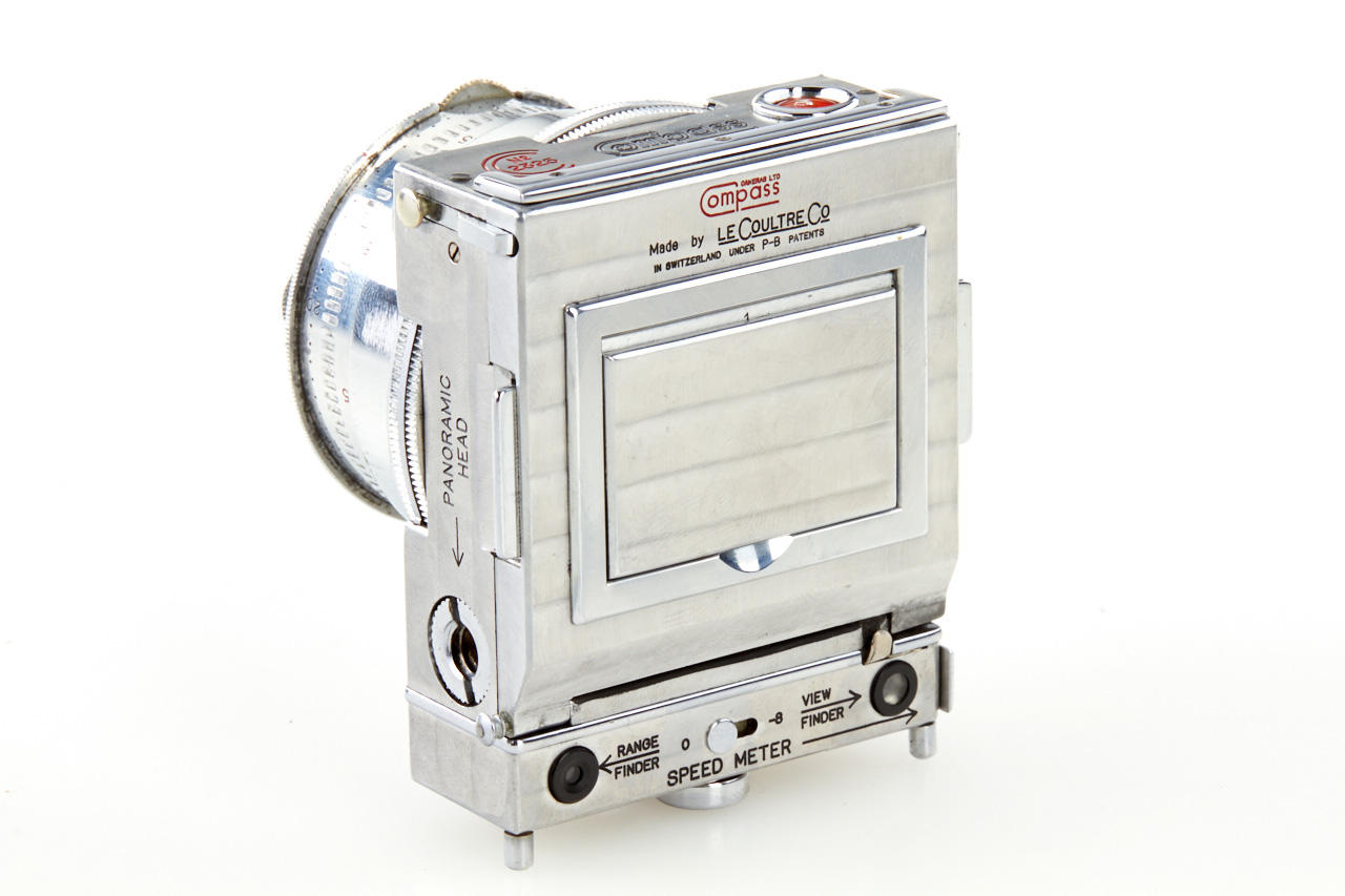 classic miniature camera, made by famous Swiss watch manufacturer Jaeger LeCoultre, English version in very good condition, nice outfit with focusing screen back, roll film back with take-up spool, original chain, in brown fitted outfit case, incl. English instructions