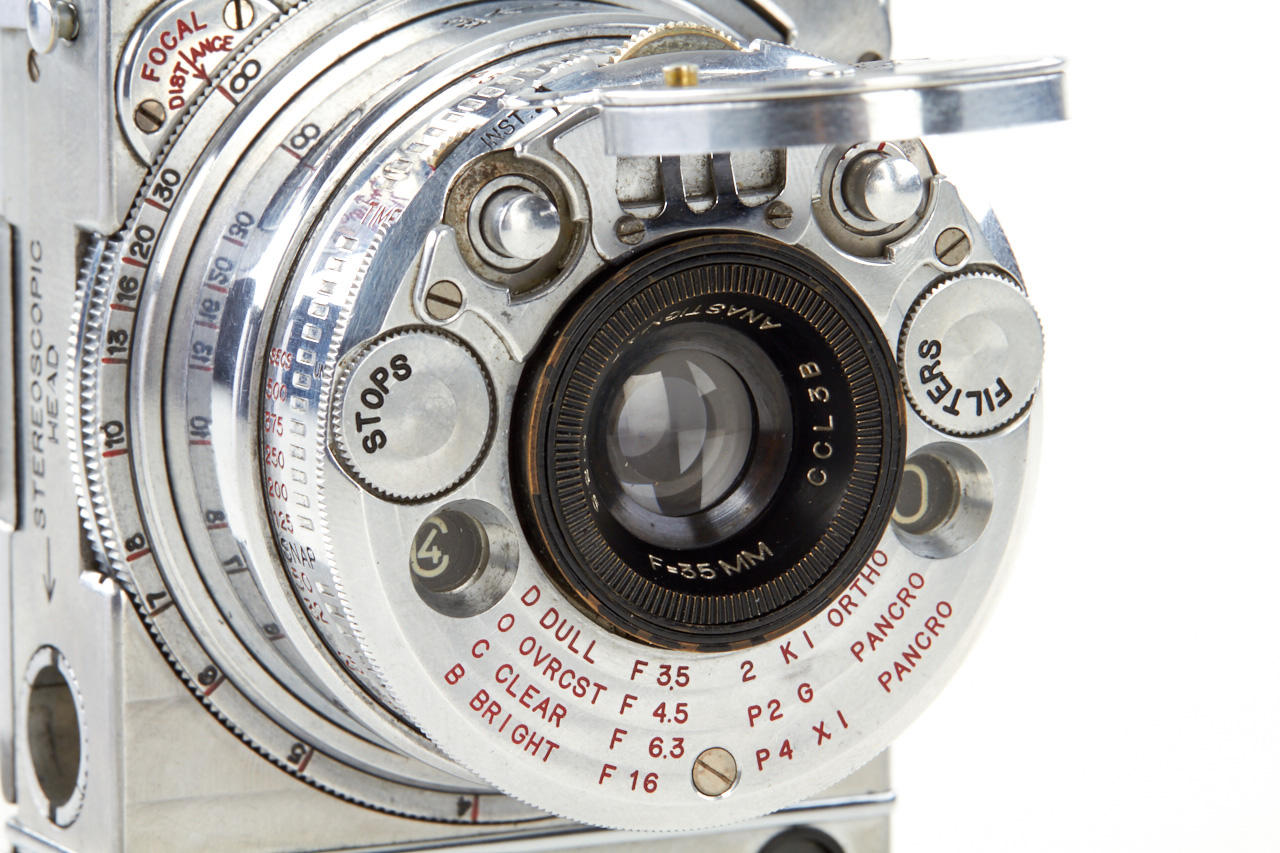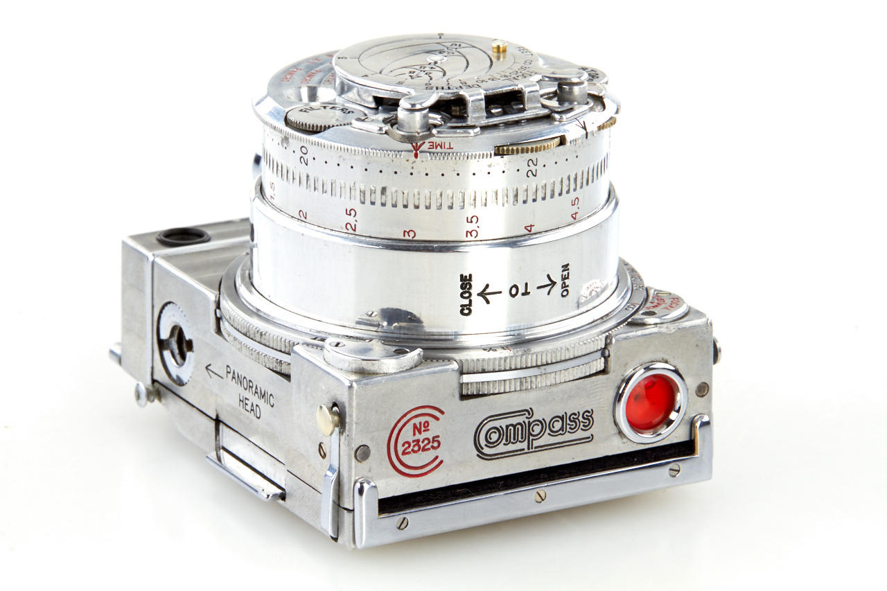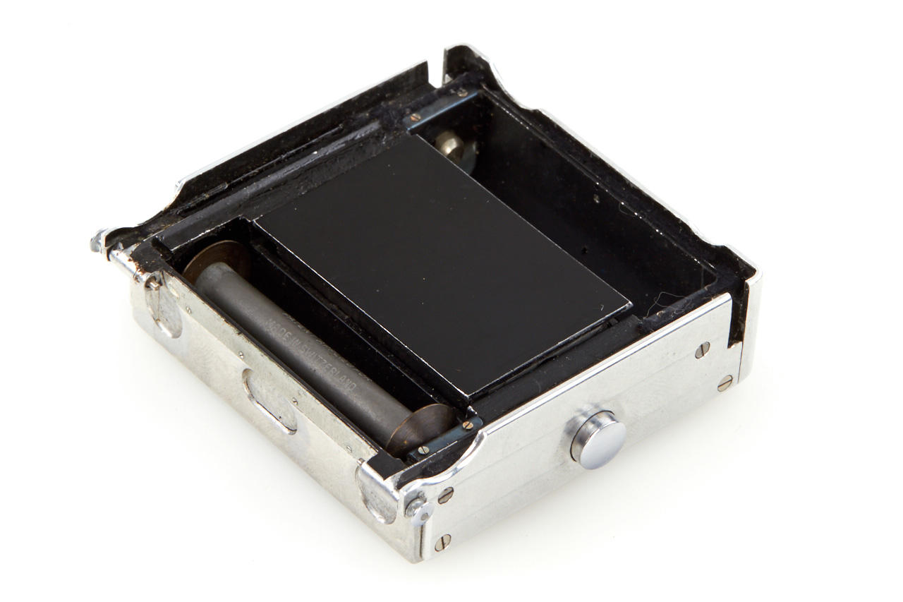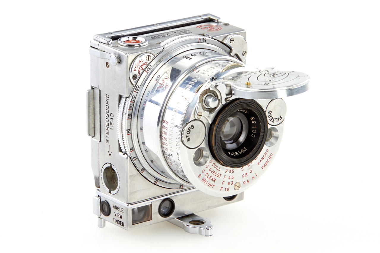 classic miniature camera, made by famous Swiss watch manufacturer Jaeger LeCoultre, English version in very good condition, nice outfit with focusing screen back, roll film back with take-up spool, original chain, in brown fitted outfit case, incl. English instructions