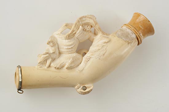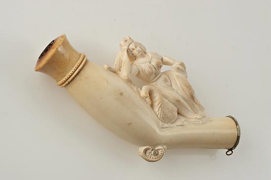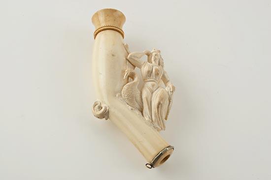 French, carved meerschaum cheroot holder with a stanhope of a nude woman sitting on a bed, signed Dagron in the negative. With leather case. (repair to one end of the pipe) Ex Spira Collection.