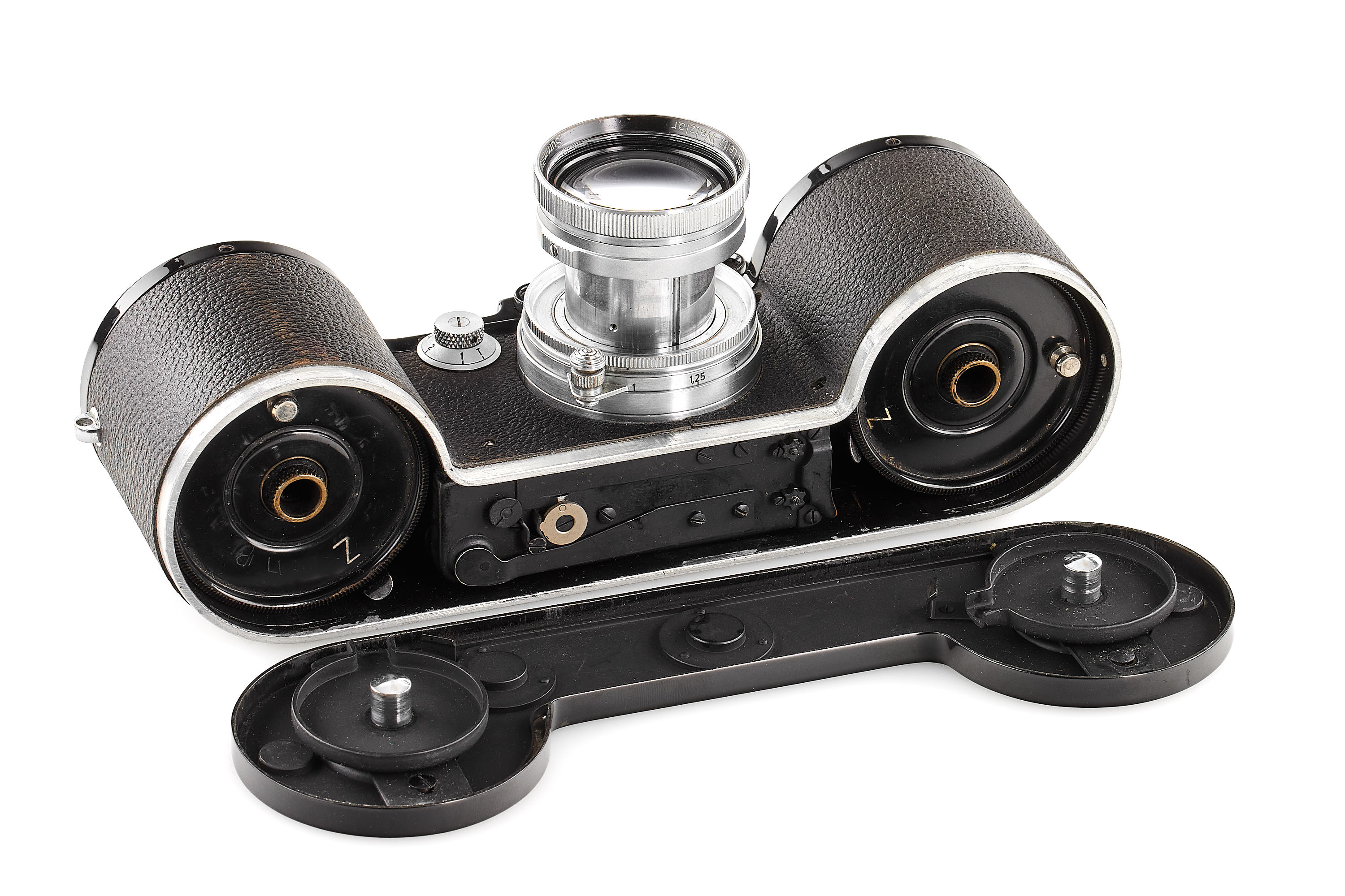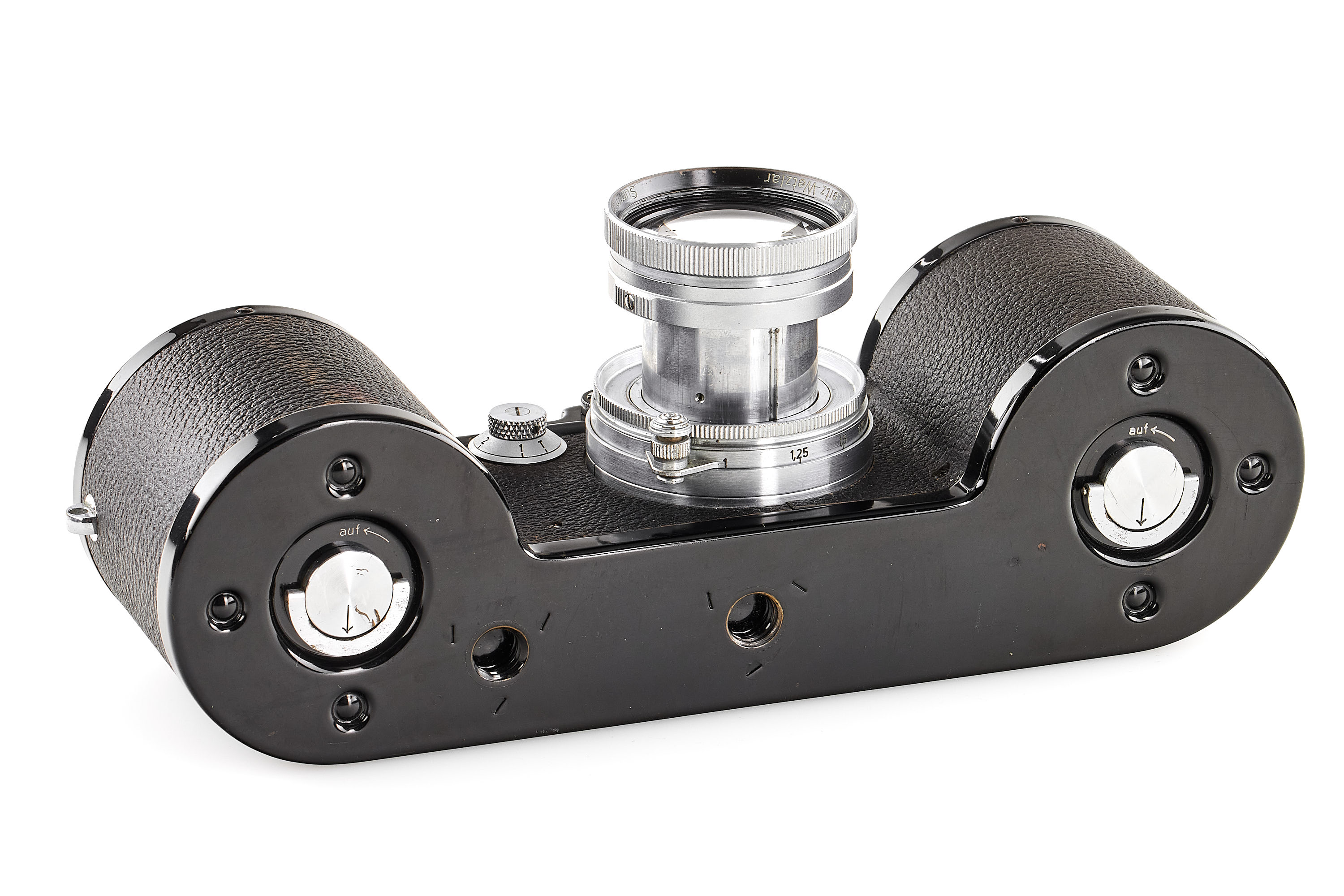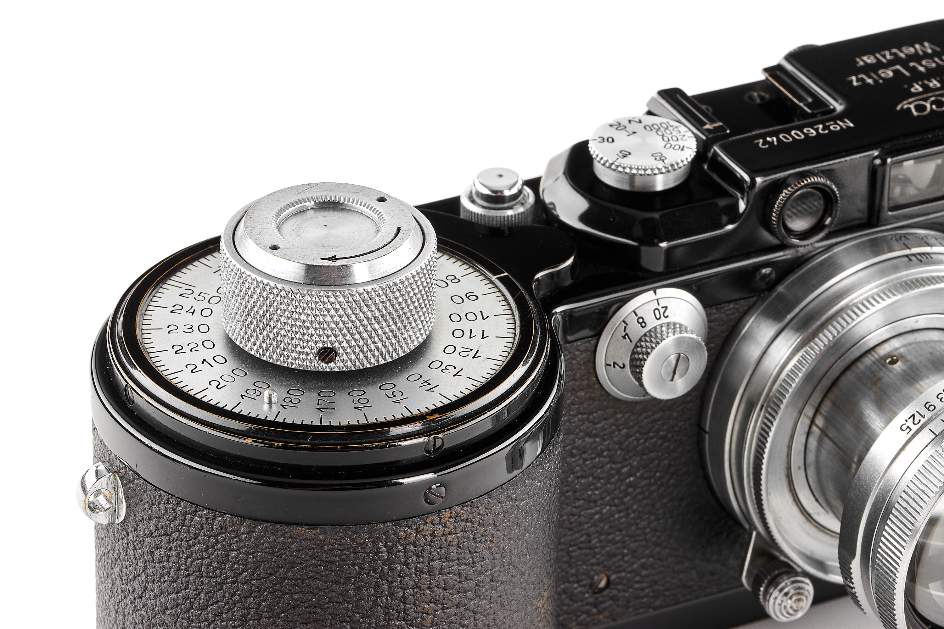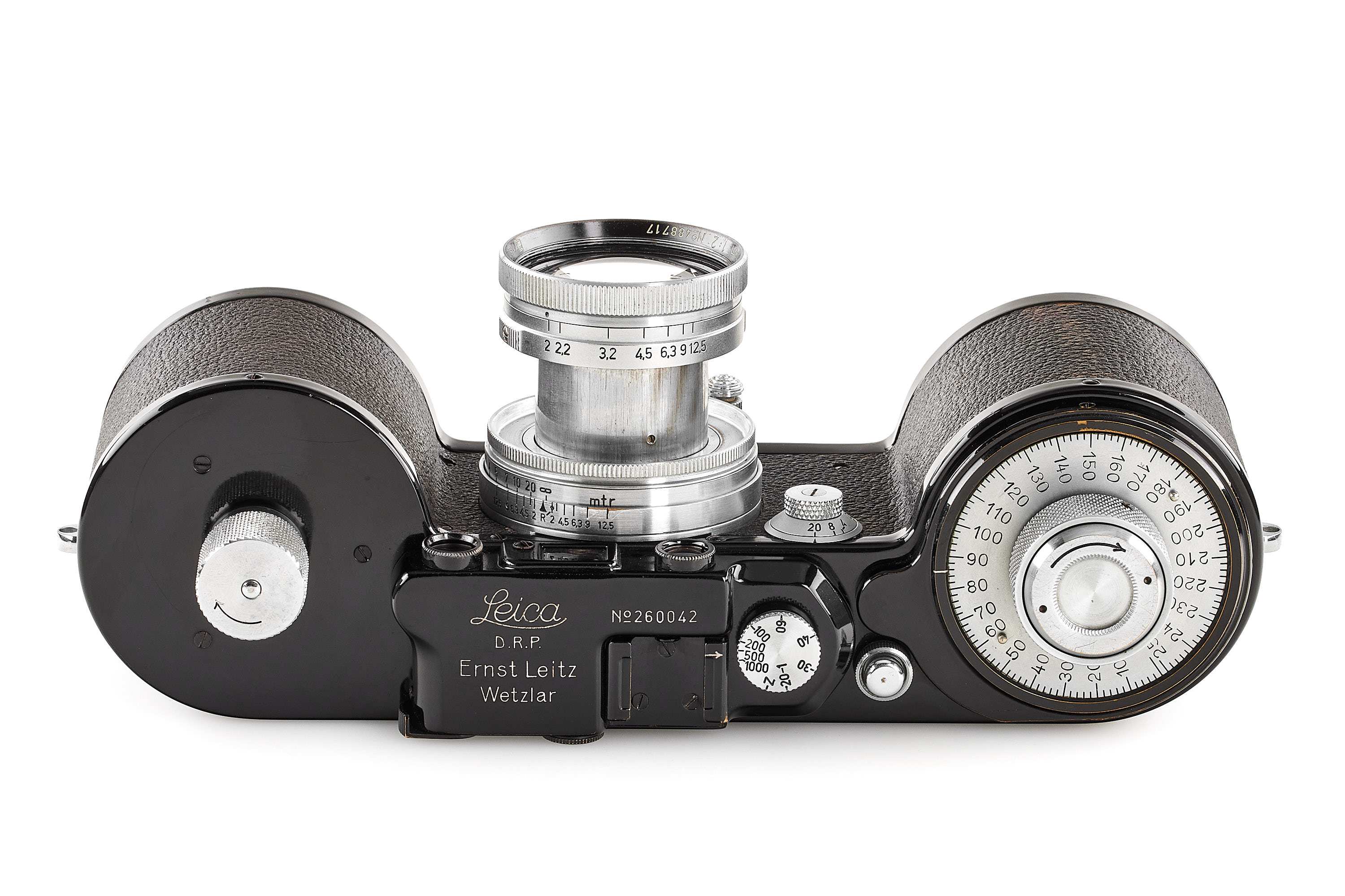 A sought-after Reporter Leica for 250 exposures on 35mm film. in exceptional, near-mint condition with only minimal signs of use. With Summitar 2/5cm no.488717, two cassettes and rare ESFOO eveready case. The camera was delivered to Berlin on 24.02.1936.