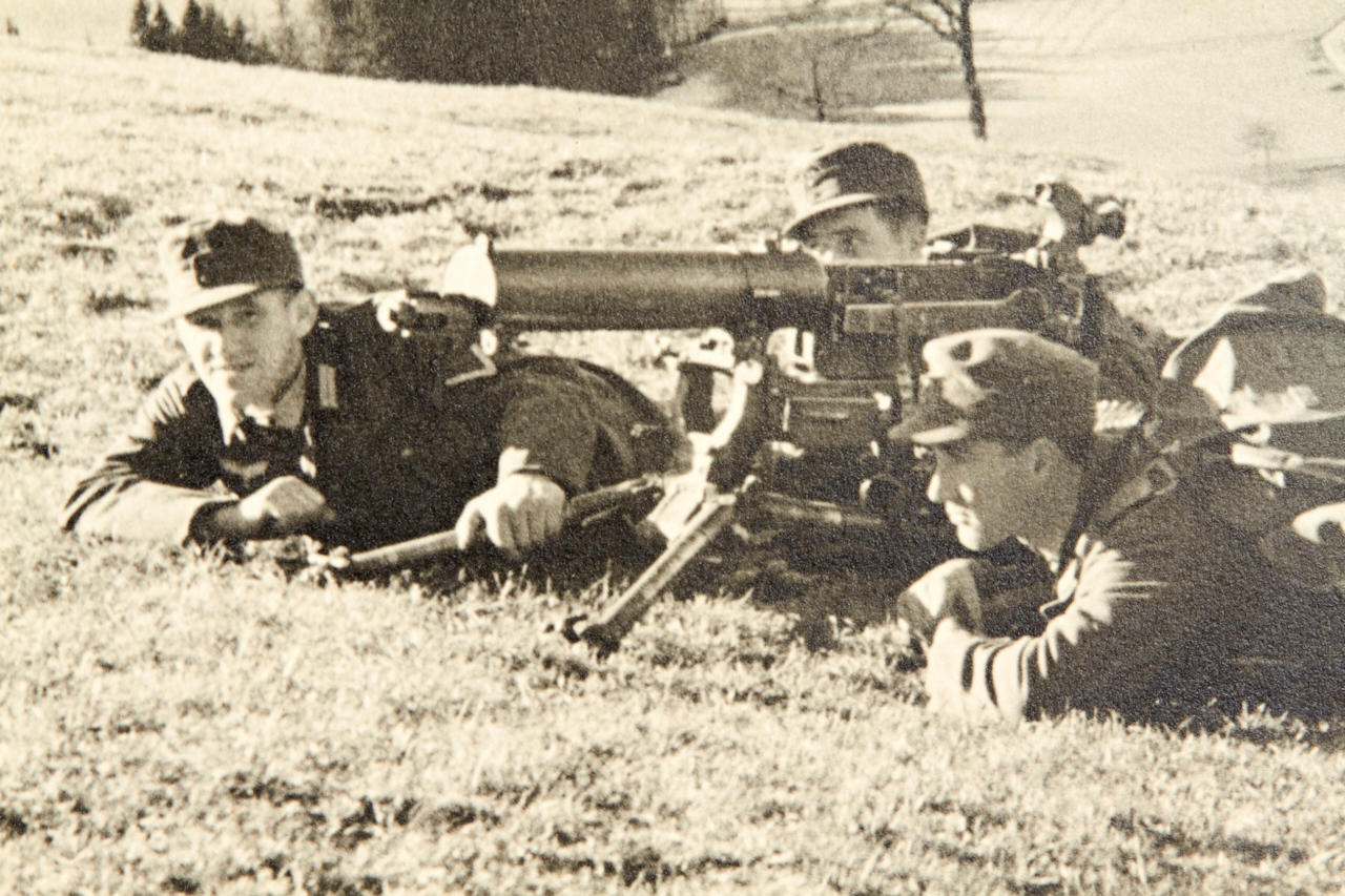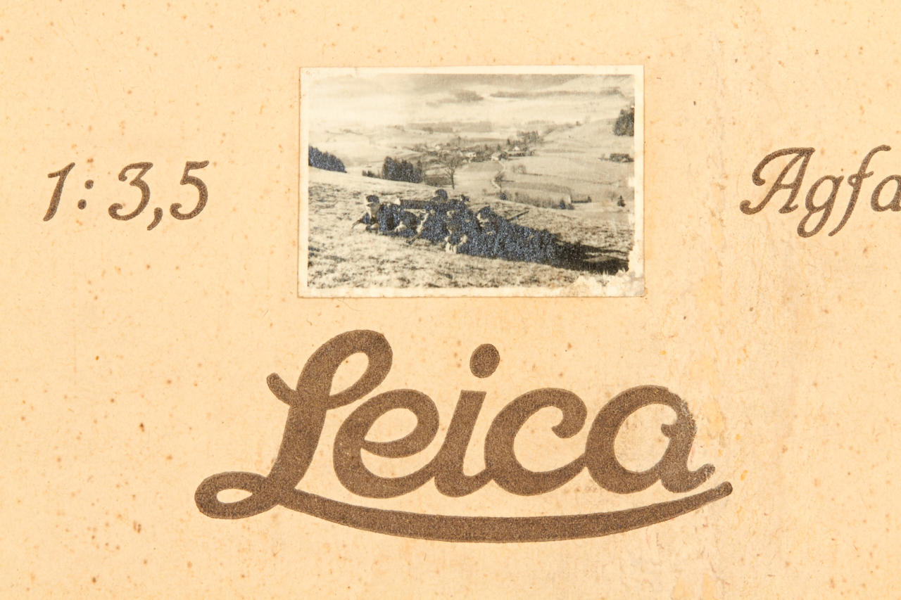 Gelatine silver print, mounted behind cardboard of the photograph in size of the negative (24x36mm) and enlarged (size 25x37cm without cardboard). The photograph shows a German military scene with 'Leitz Elmar f=5cm 1:3,5 Agfa Brovira Vergrößerung Leica' on cardboard. Unlike conventional advertising materials, which focused on cameras and their technical specifications, these enlargements laminated onto carton, so-called 'enlargements for loan', served to document the firm’s accomplishments and were loaned to Leica retailers and representatives worldwide.